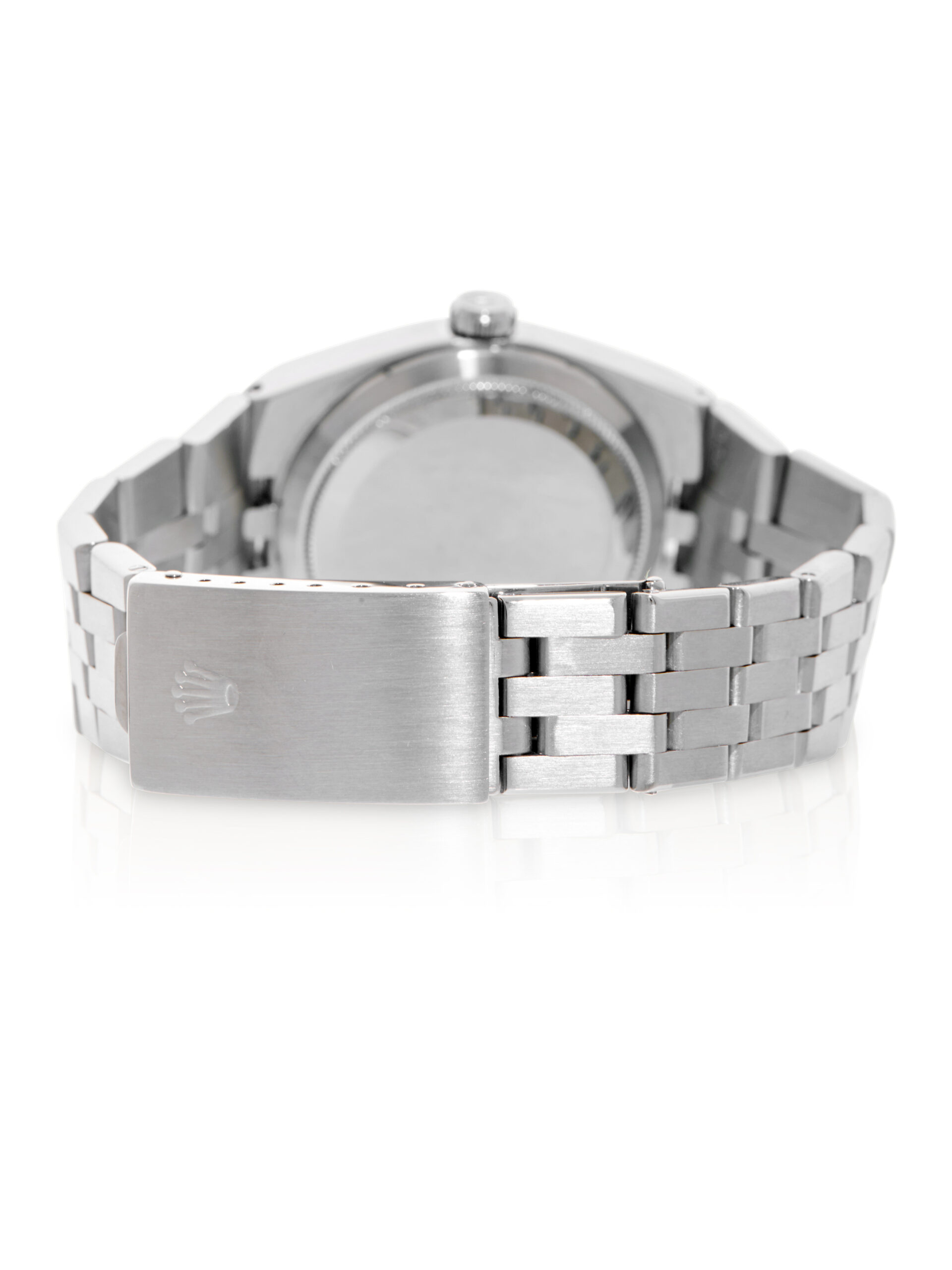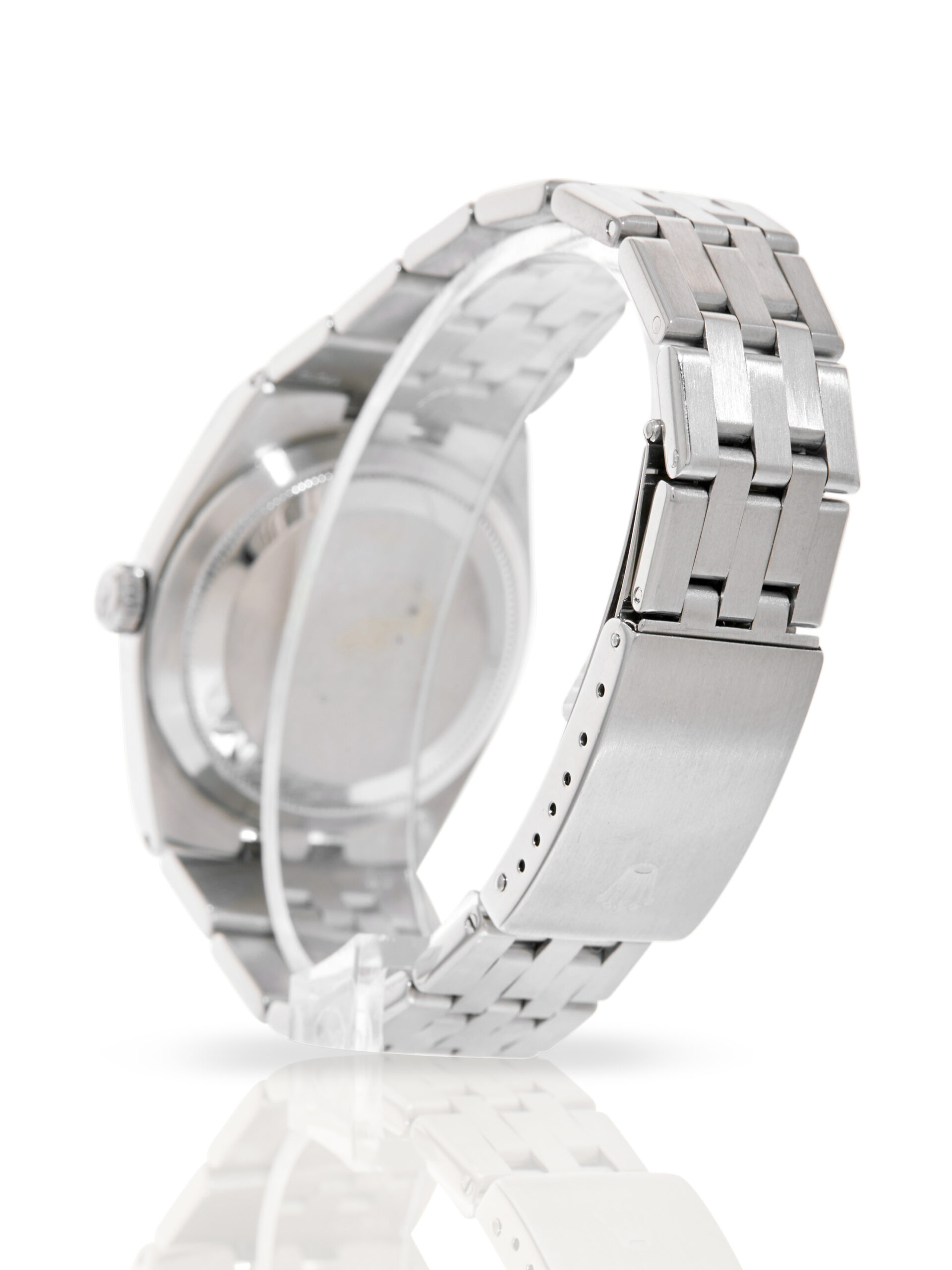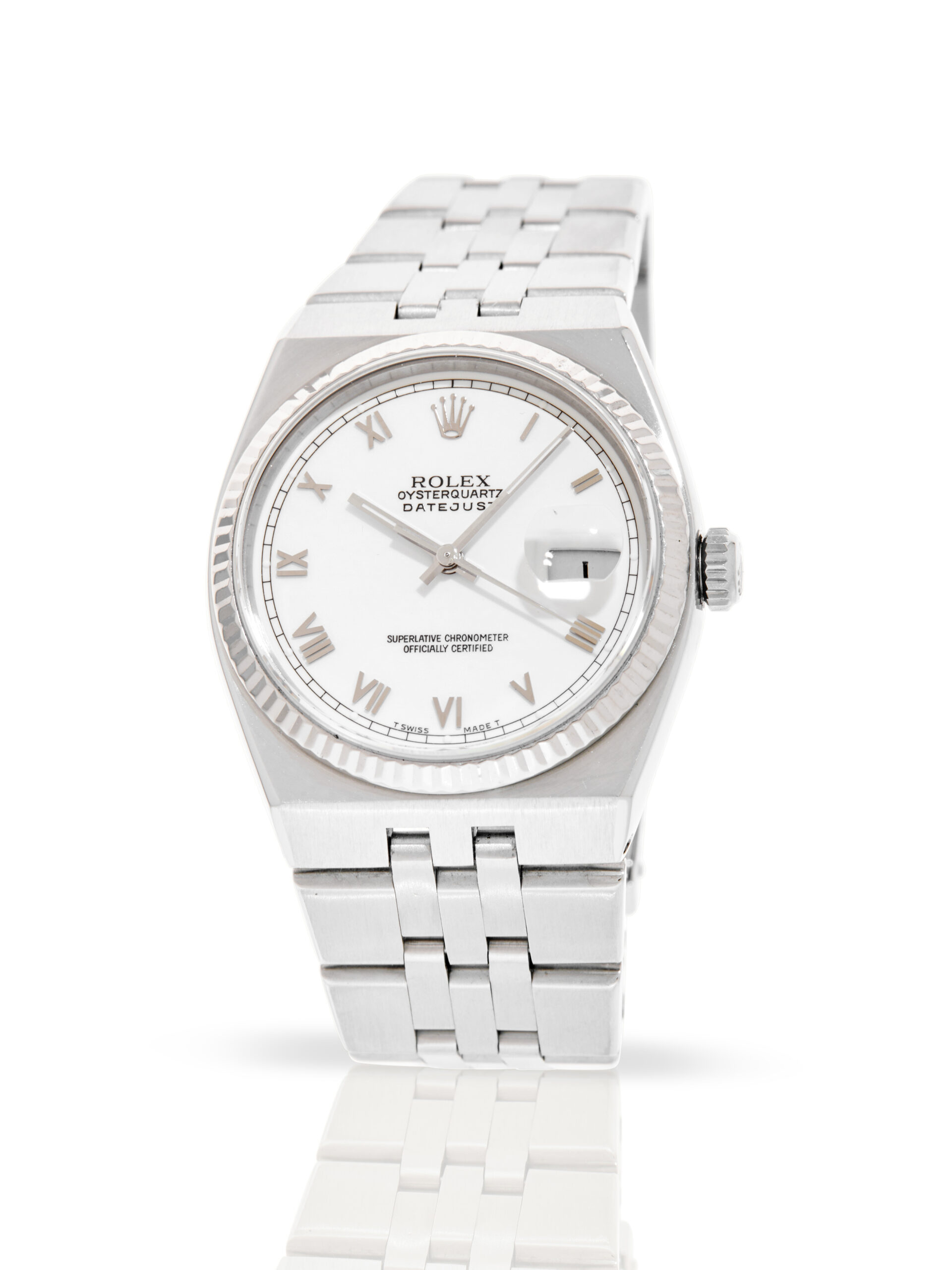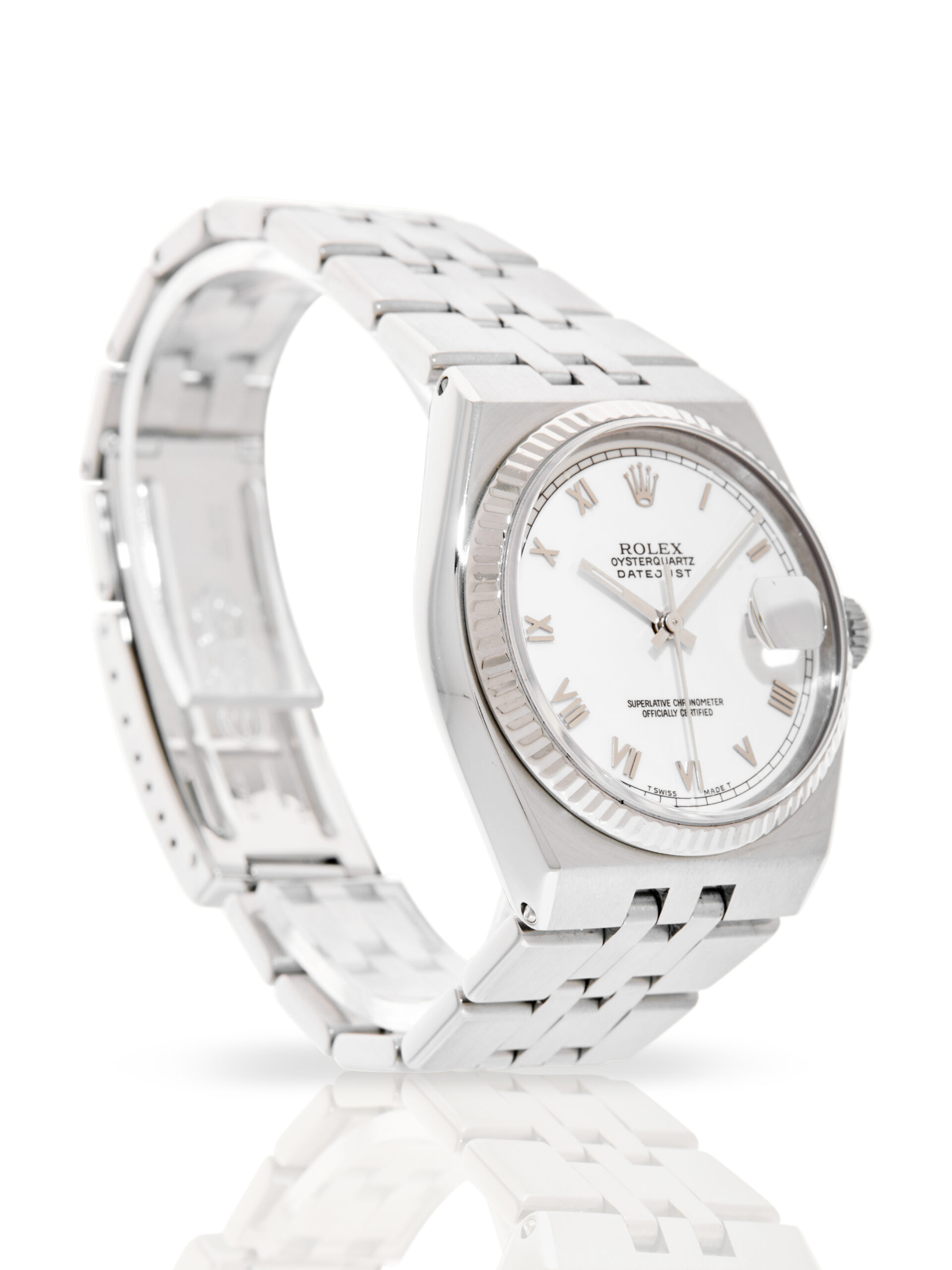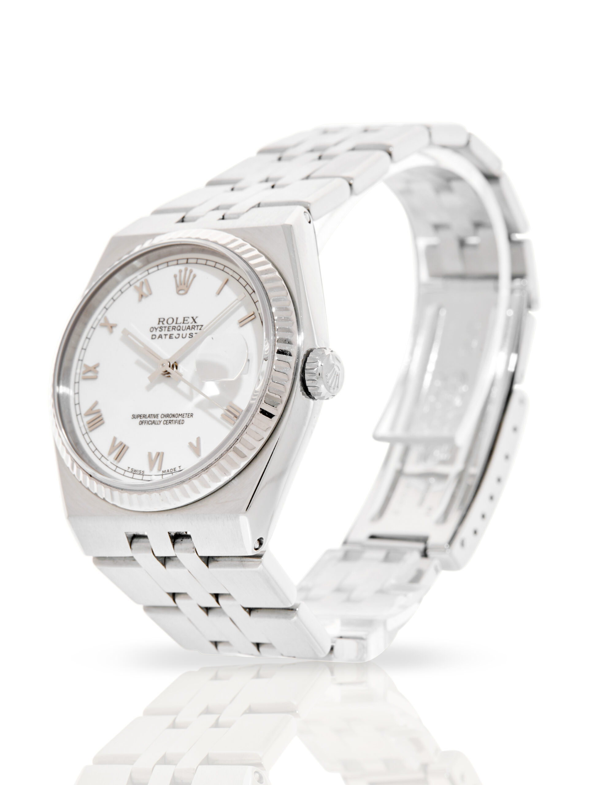 This lovely example of a 1990 Rolex Datejust Oysterquartz 17014 features a 36mm stainless steel case, silver baton dial with a date function, 18K white gold fluted bezel and is coupled to a stainless steel bracelet with a folding clasp. Having been professionally tested for condition, it’s deemed to be running well and is showing minor signs of wear