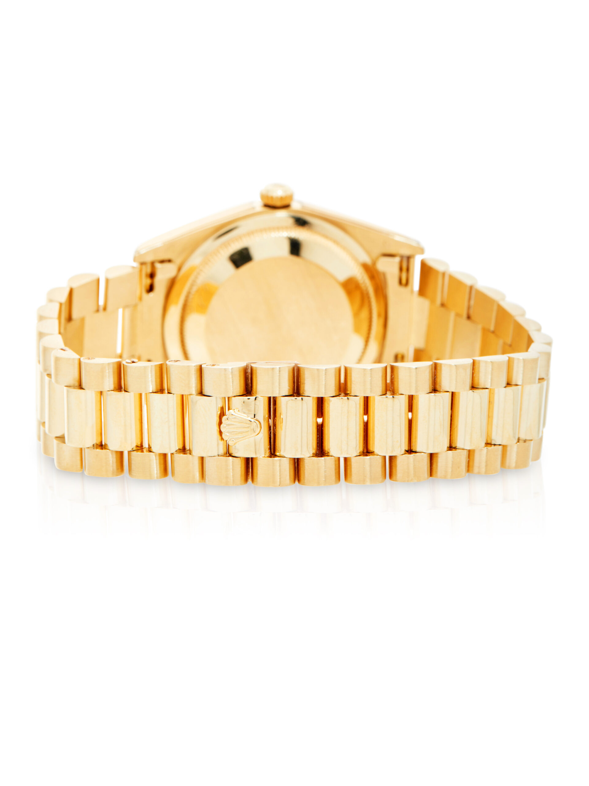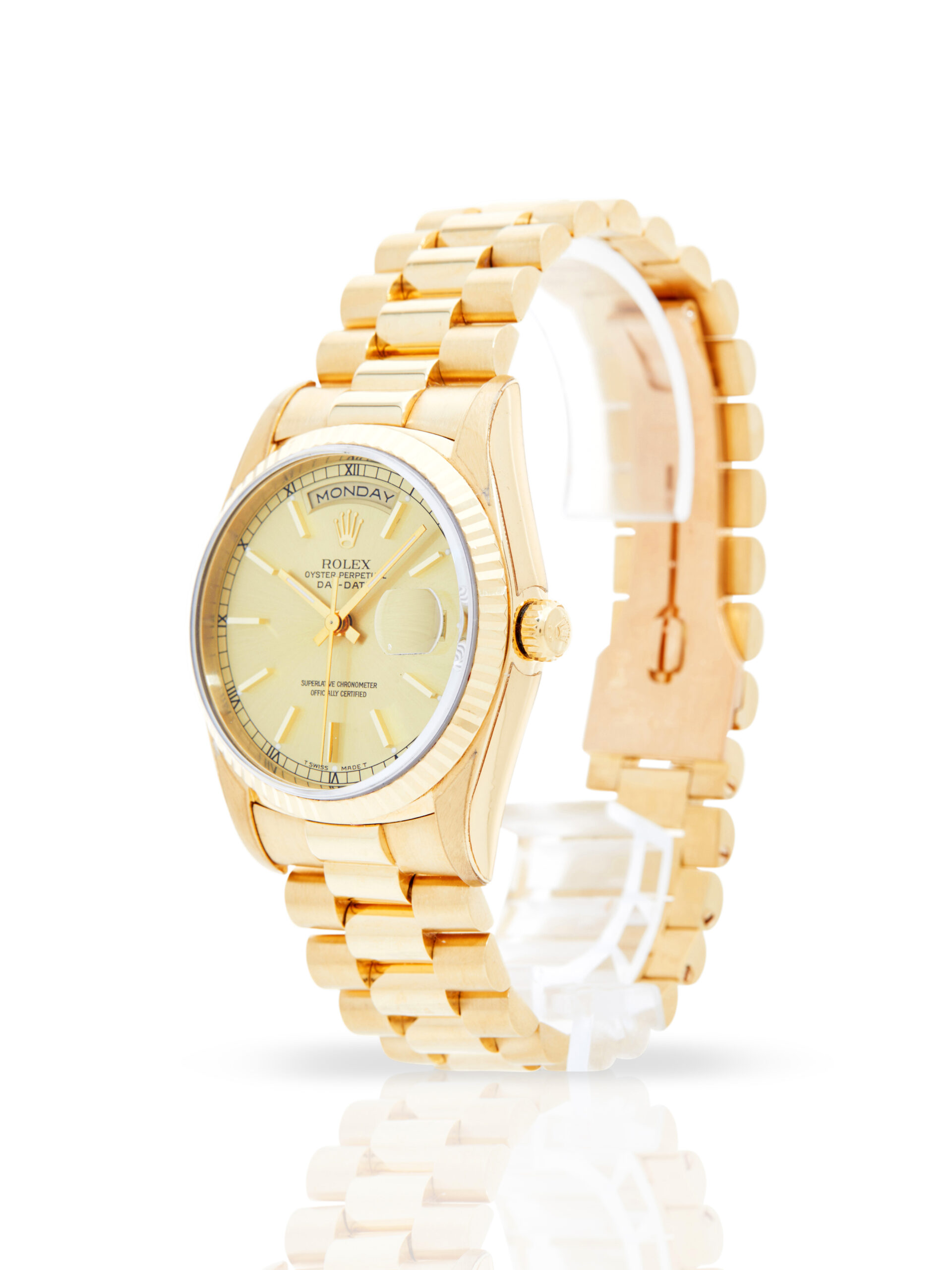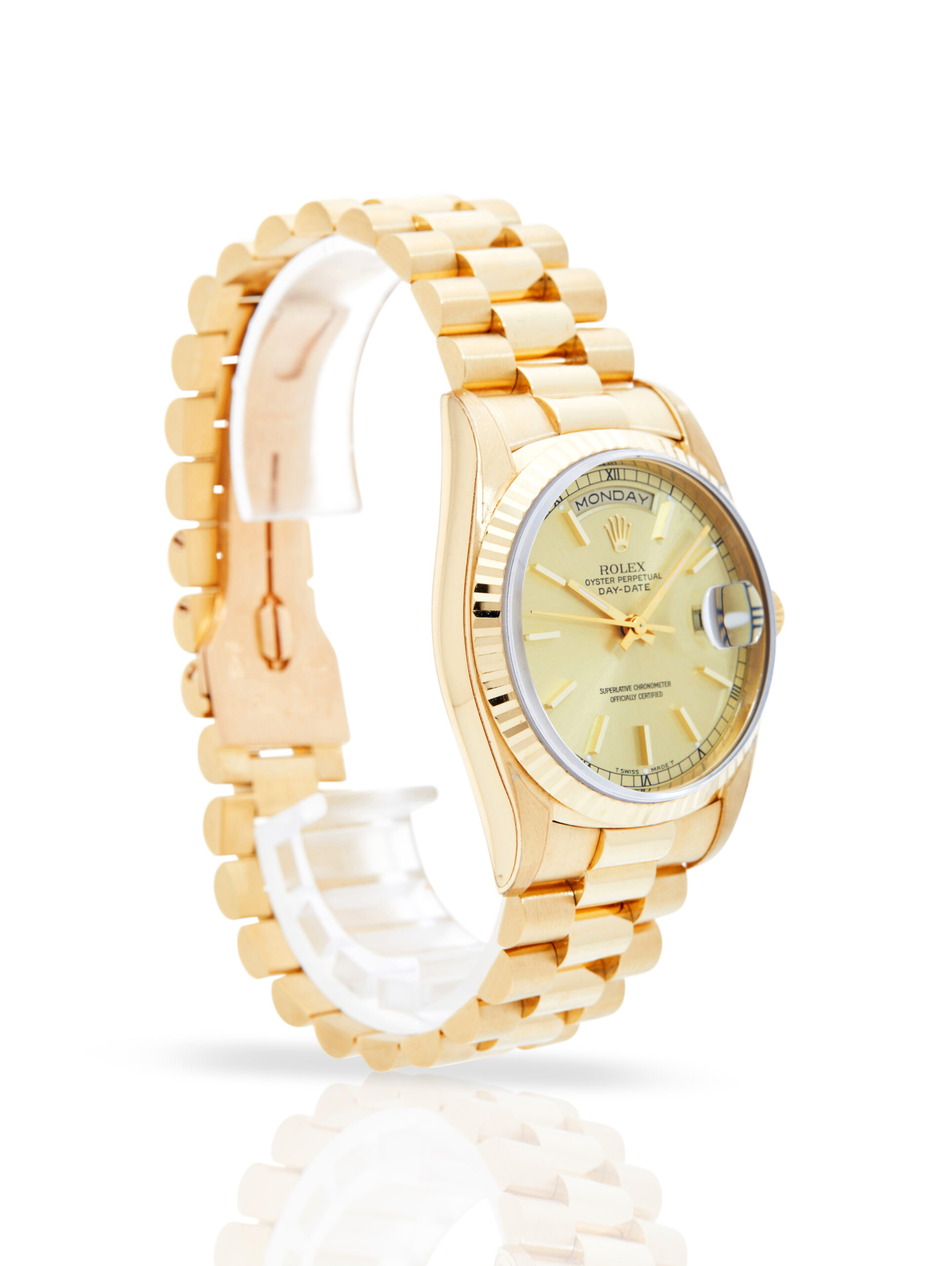 Presented in fantastic condition is this elegant example of a 1990 Rolex Day-Date 36 18238. The watch features a 36mm 18K yellow gold case, 18K yellow gold fluted bezel, champagne baton dial and is coupled to an 18K yellow gold President bracelet. Having been professionally tested for condition and accuracy, it’s deemed to be running very well and is showing only minor signs of wear.