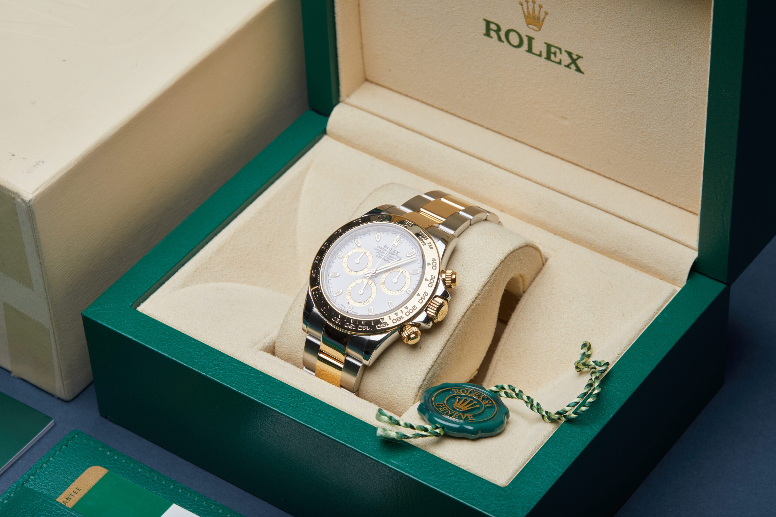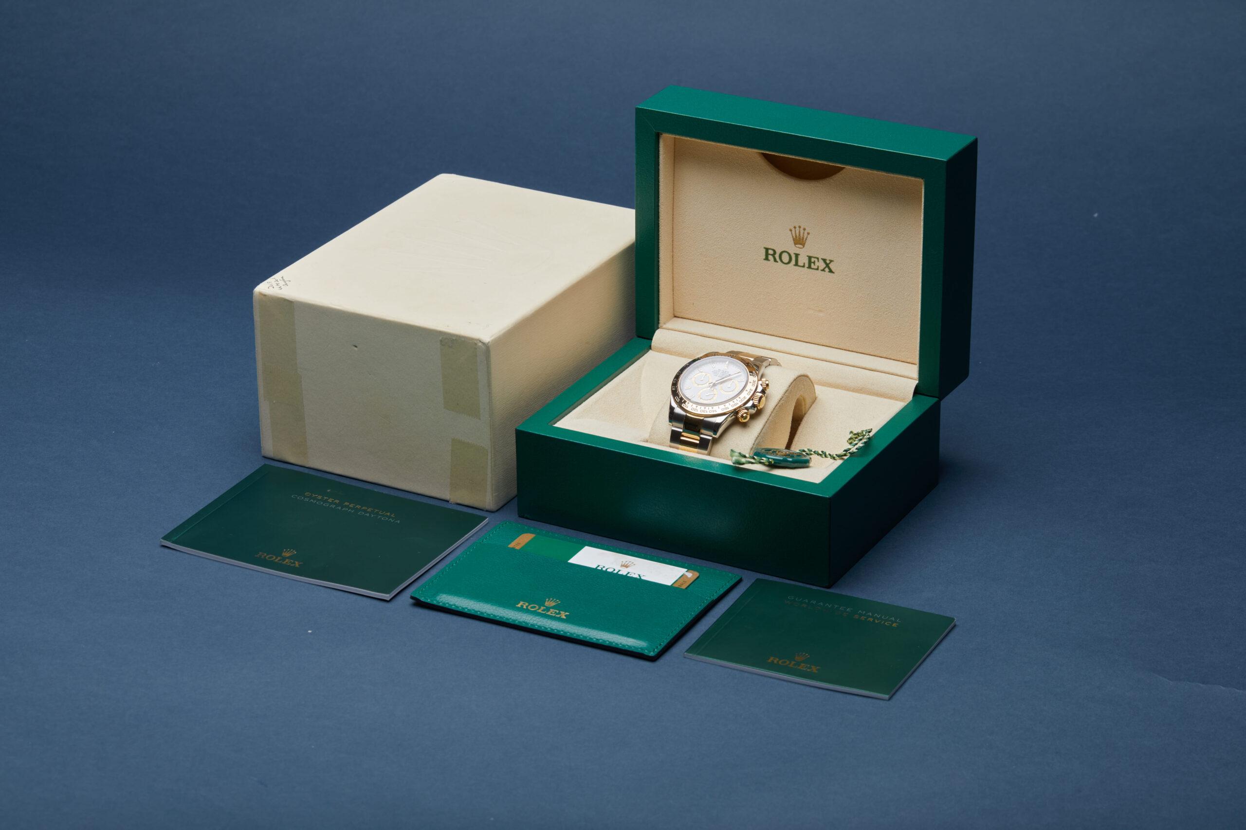 The watch is supplied with its original Rolex box, green leather wallet, manuals, green swing tag and warranty card dated Q4 2019.