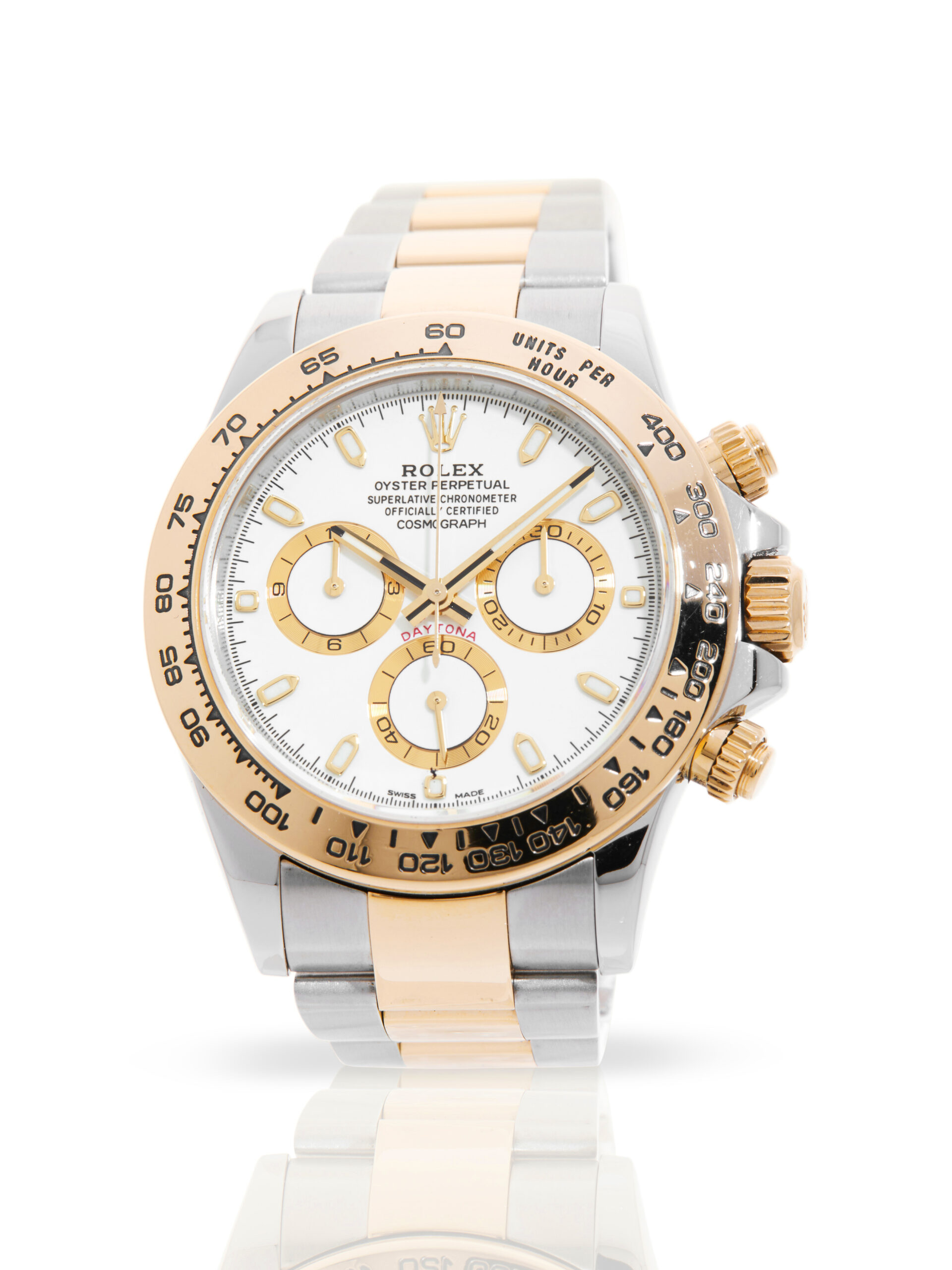 Presented in excellent condition is this great example of a 2019 Rolex Daytona 116503. The watch features a 40mm stainless steel case, white chronograph dial with luminescent hour markers, 18K yellow gold bezel with a tachymeter scale and is coupled to a a bi-metal Oyster bracelet. Having been professionally tested for condition and accuracy, it’s deemed to be running very well and is showing only very minor signs of wear.