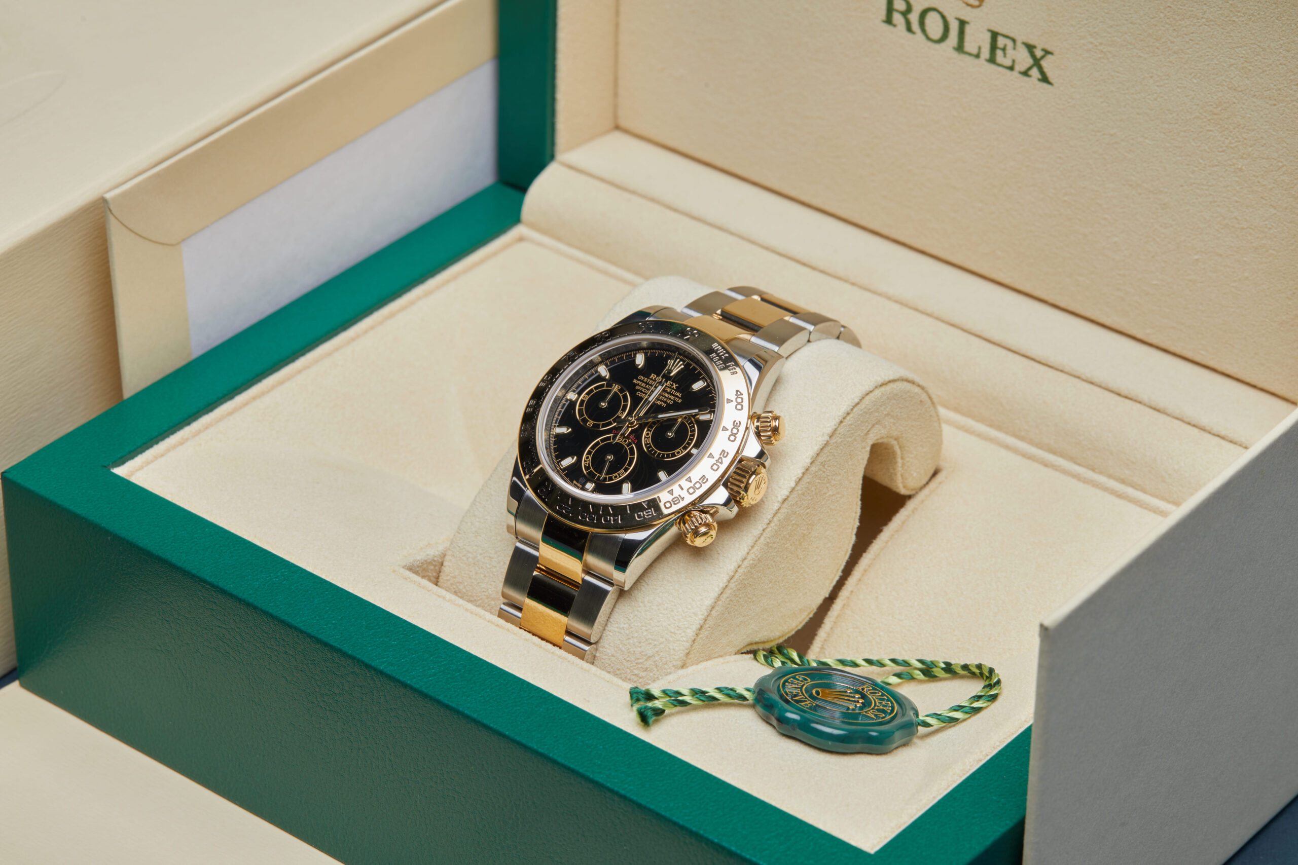 Presented in excellent condition is this stunning example of a 2017 Rolex Daytona 116503. The watch features a 40mm stainless steel case, black chronograph dial with luminescent hour markers, 18K yellow gold bezel with a tachymeter scale and is coupled to a a bi-metal Oyster bracelet. Having been professionally tested for condition and accuracy, it’s deemed to be running very well and is showing only very minor signs of wear.