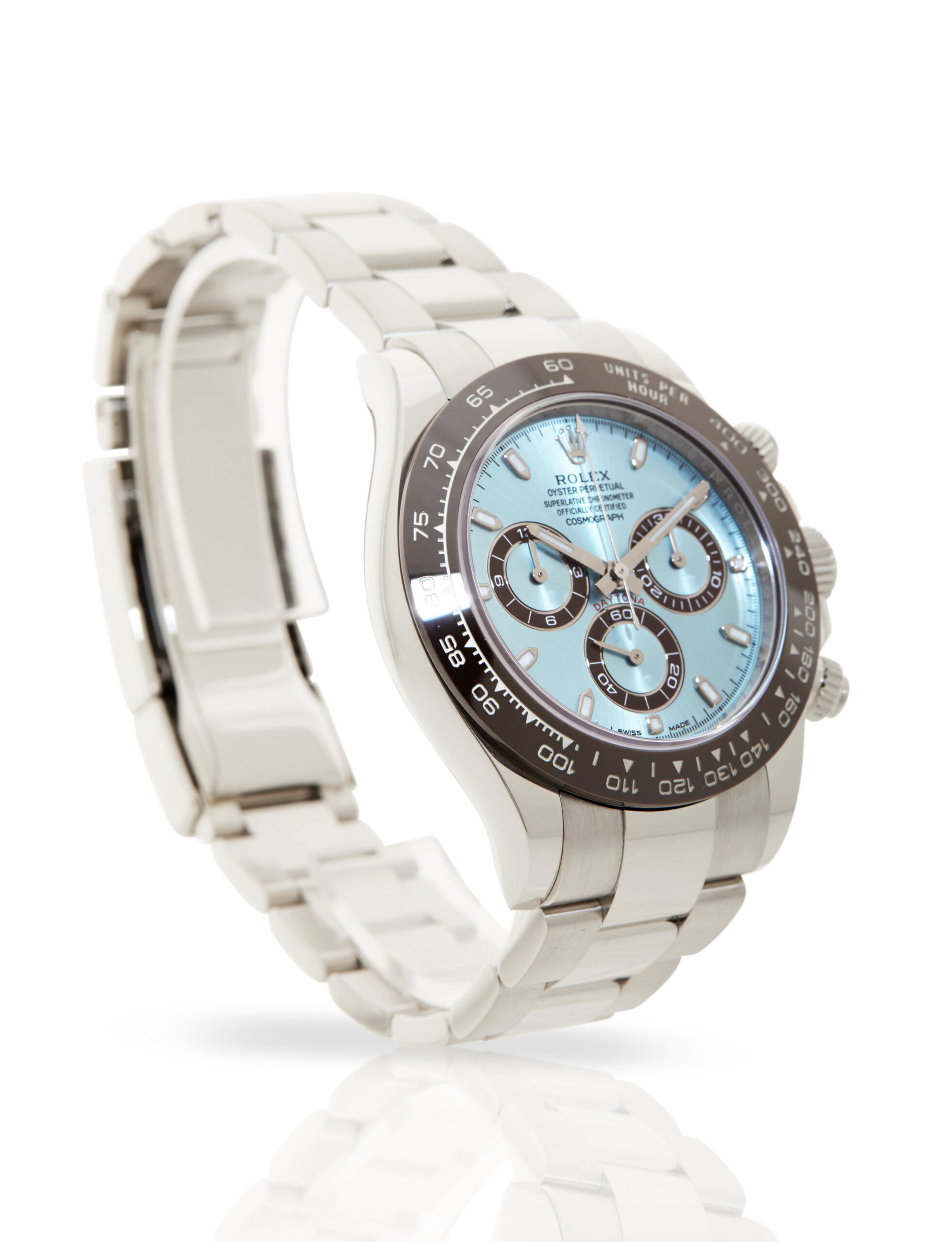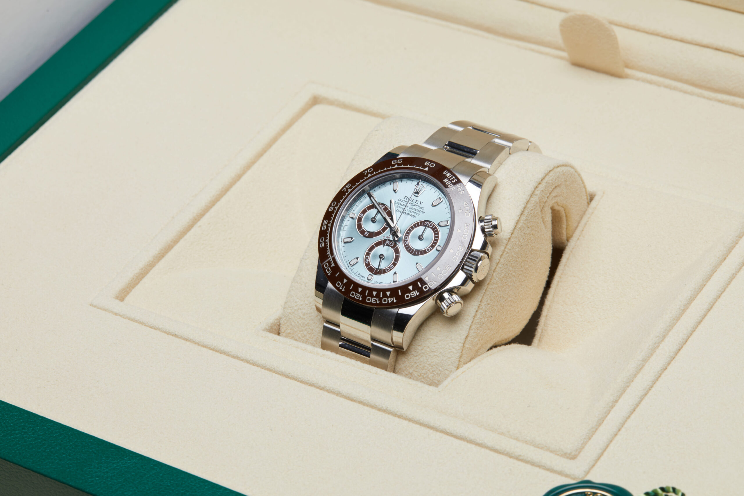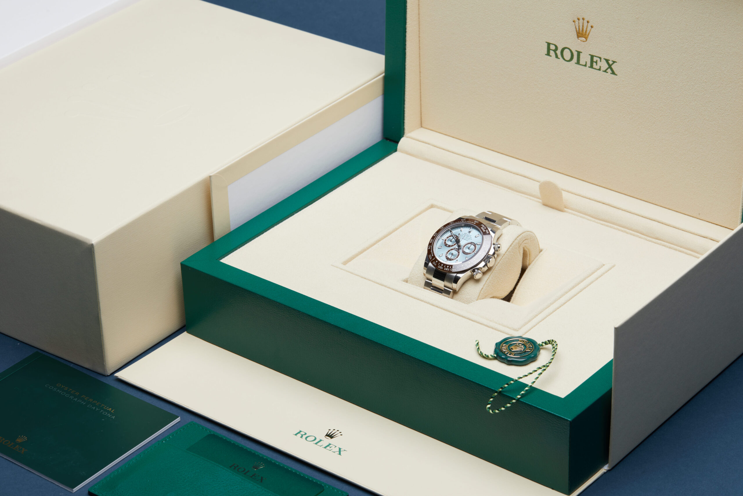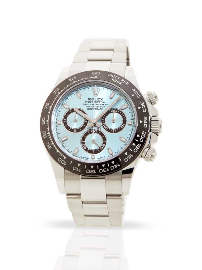Presented in excellent condition is this beautiful example of a 2023 Rolex Daytona 116506. The watch features a 40mm platinum case, ‘ice’ blue chronograph dial, brown ceramic bezel and is coupled to a platinum Oyster bracelet. Having been professionally tested for condition and accuracy, it’s deemed to be running perfectly, ready for its new, very lucky owner.