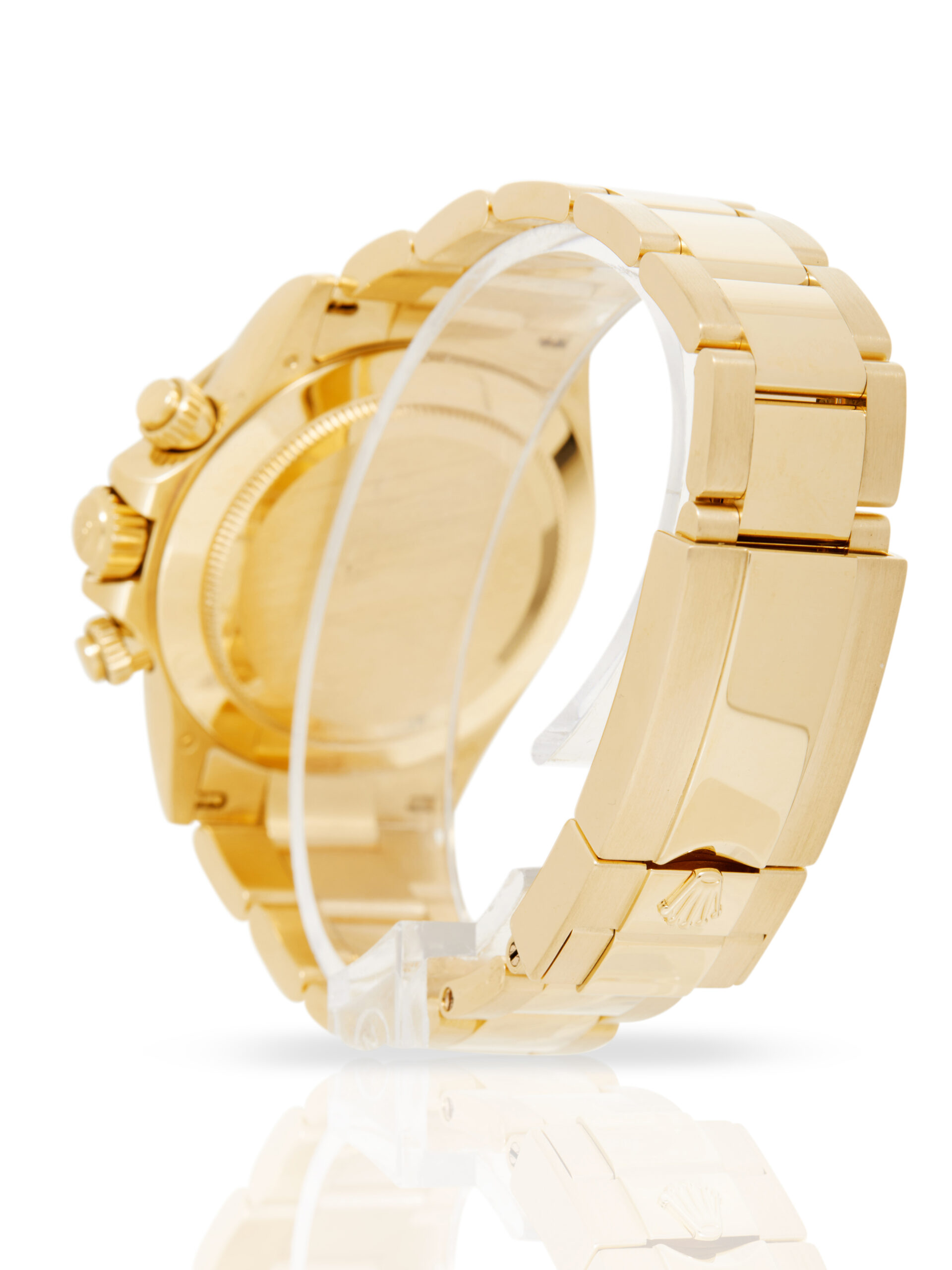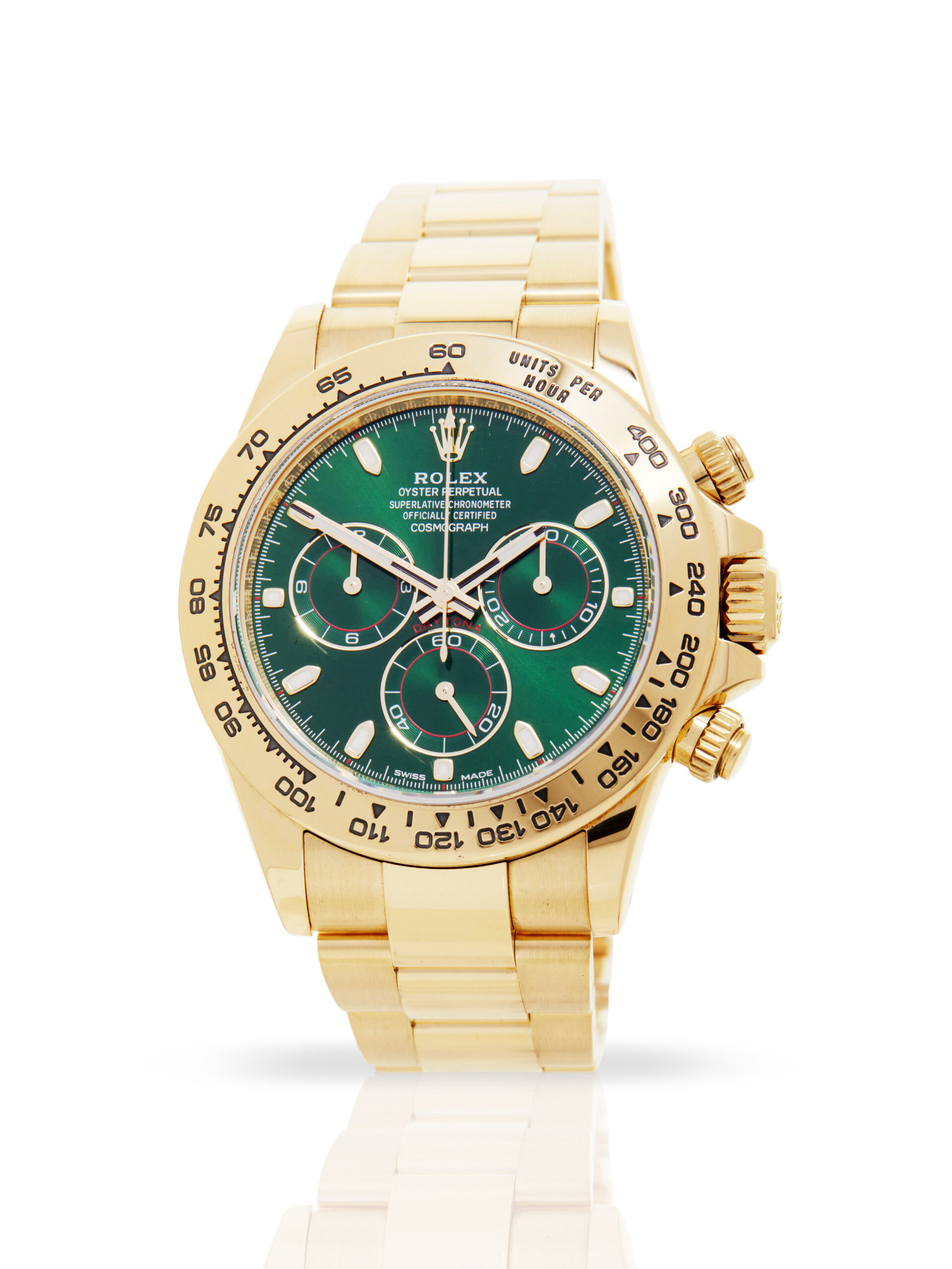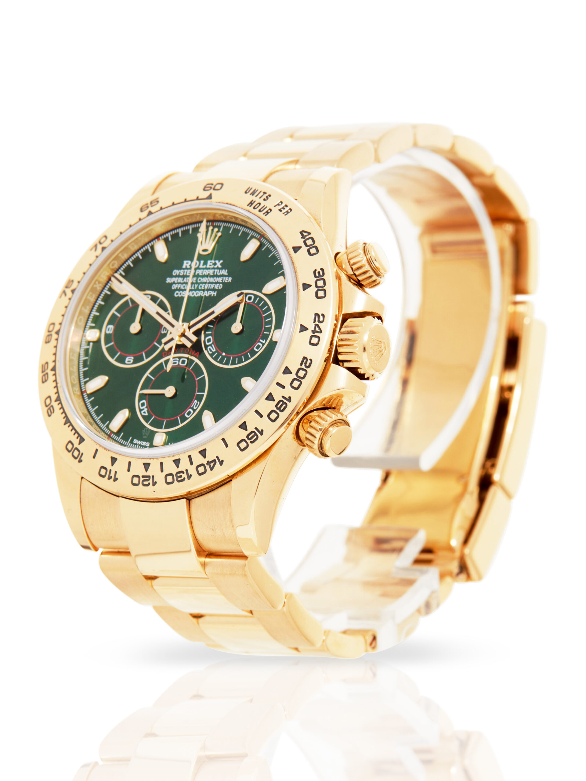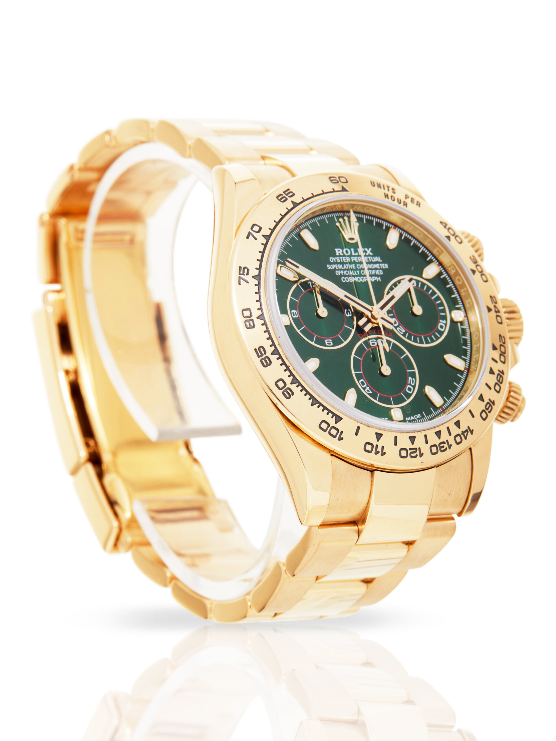 Presented in excellent condition is this beautiful example of a Rolex Daytona 116508 John Mayer. The watch features a 40mm 18K yellow gold case, 18K yellow gold bezel with a tachymeter scale, green chronograph dial with luminescent hour markers and is coupled to an 18K yellow gold Oyster bracelet. Having been professionally tested for condition and accuracy, it’s deemed to be running perfectly and is showing only very signs of wear.