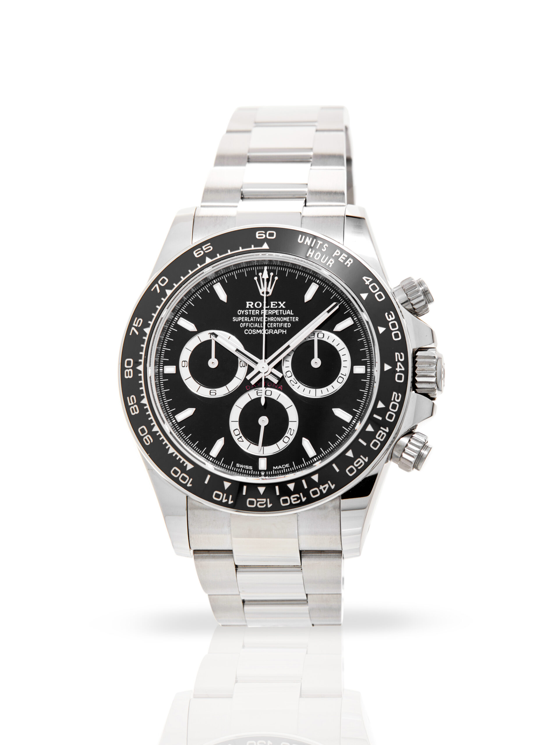 Presented in unworn condition is this superb example of a 2025 Rolex Daytona 126500LN. The watch features a 40mm stainless steel case, black chronograph dial with luminescent hour markers, stainless steel bezel with black ceramic insert and is coupled to a stainless steel Oyster bracelet. Having been professionally tested for condition and accuracy, it’s deemed to be running perfectly, ready for its new, lucky owner.