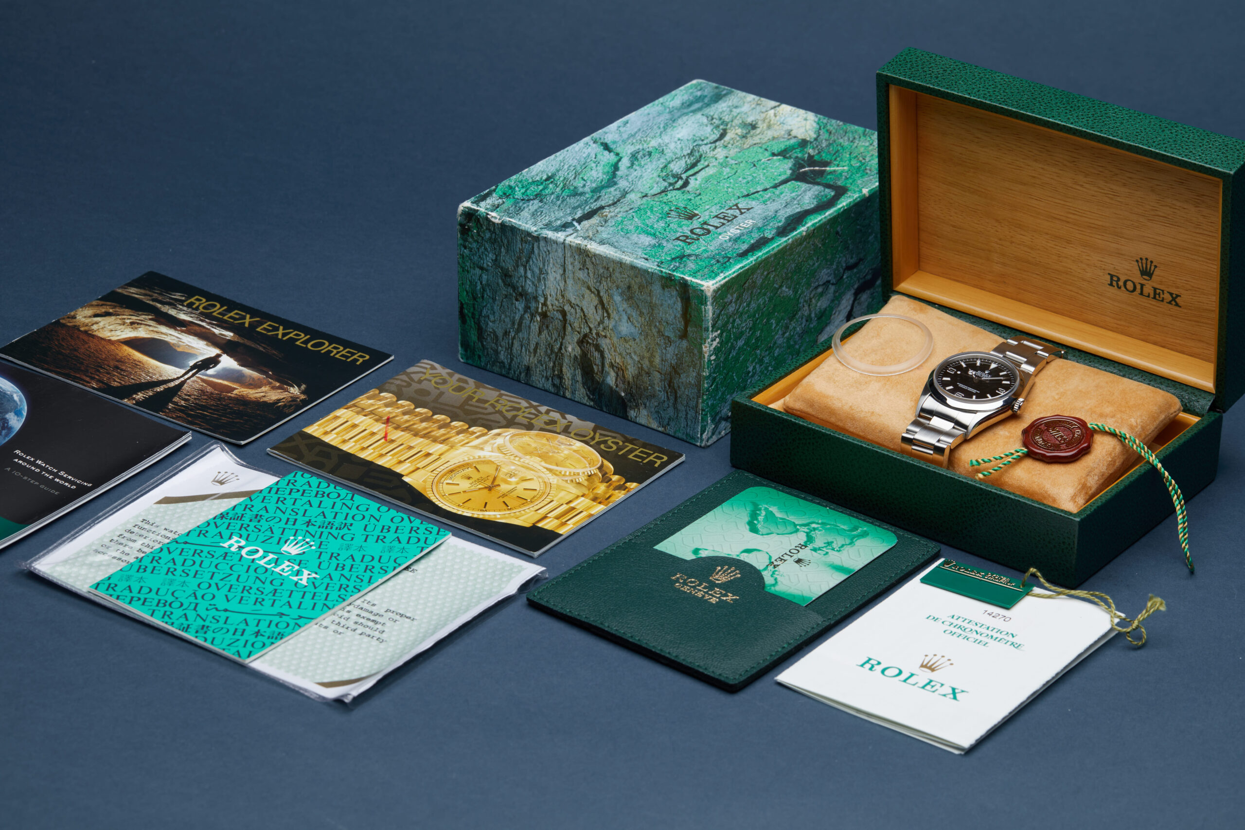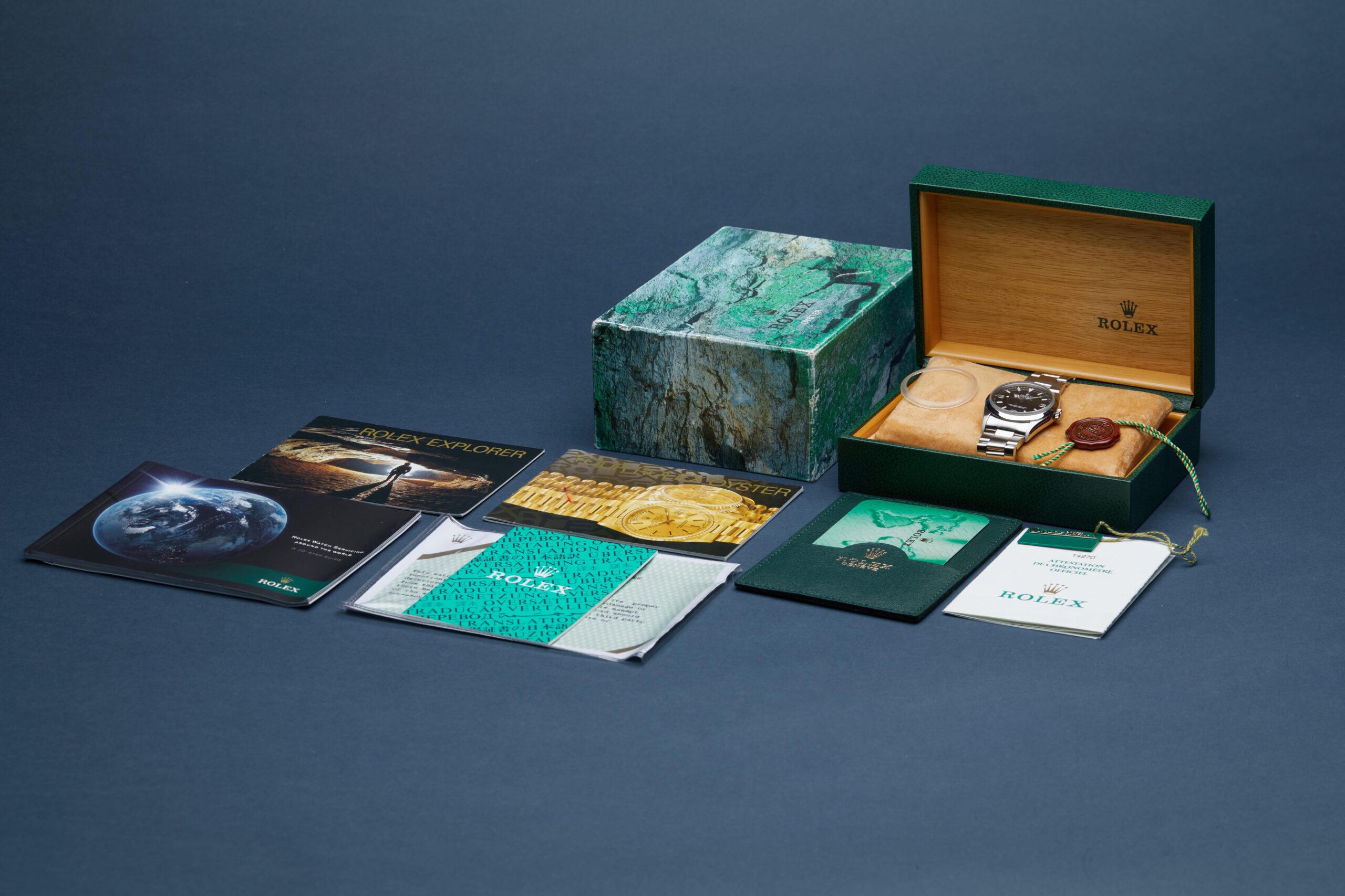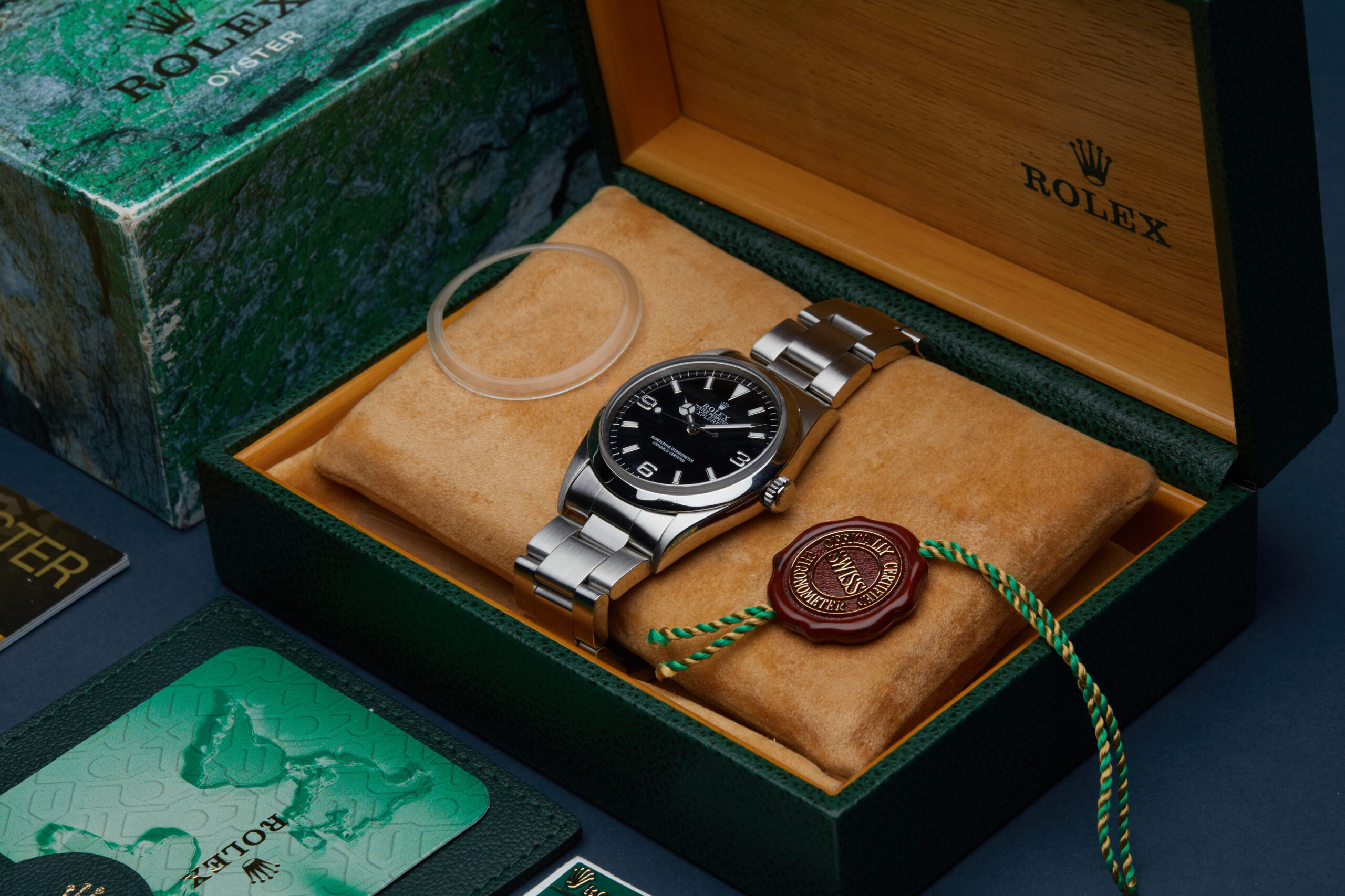 The watch is supplied with its original Rolex box, green leather wallet, service certificate dated 2006, 2x swing tags, bezel protector, manuals, swing tag and warranty card dated Q3 2000 (UK supplied).