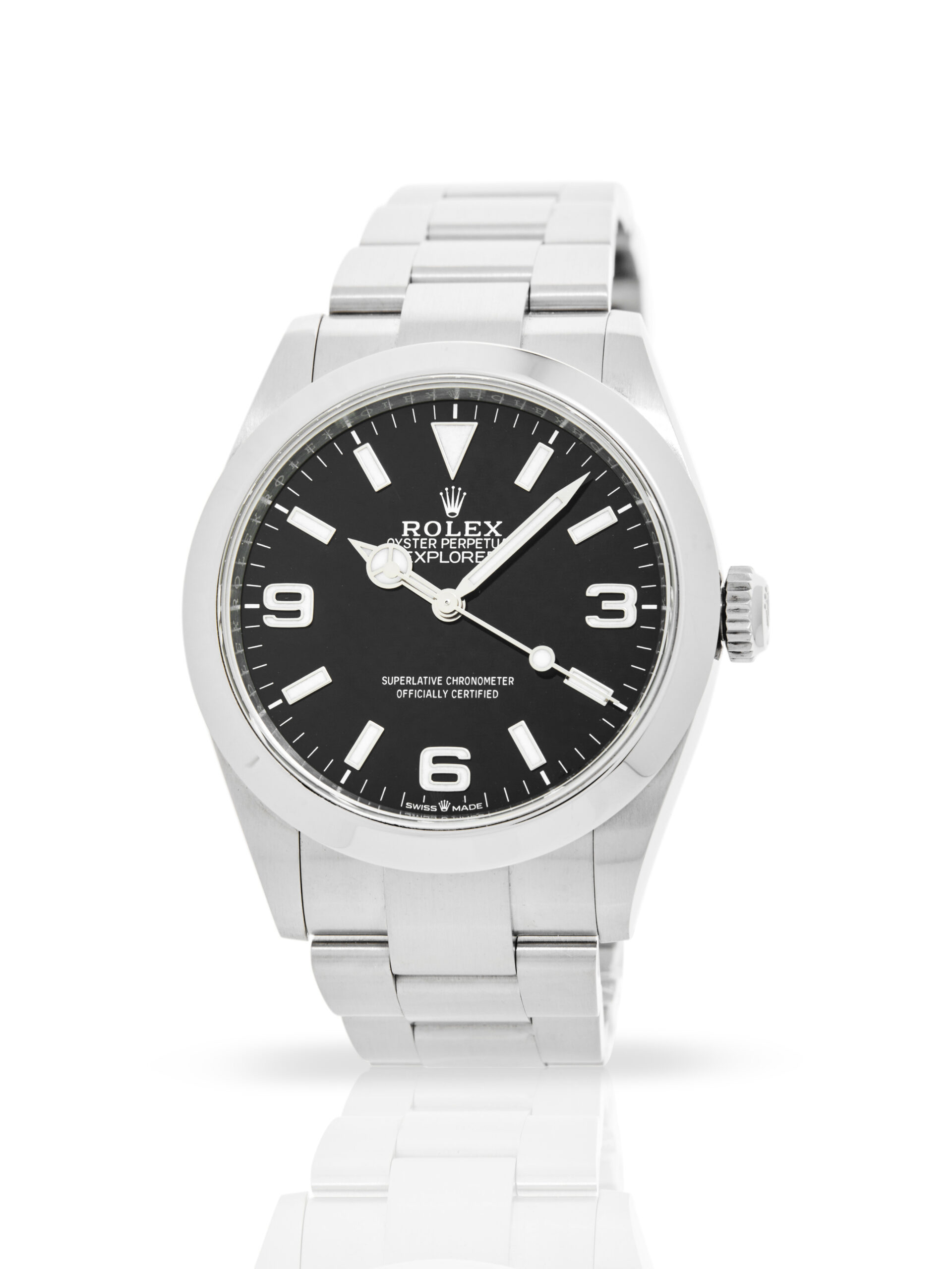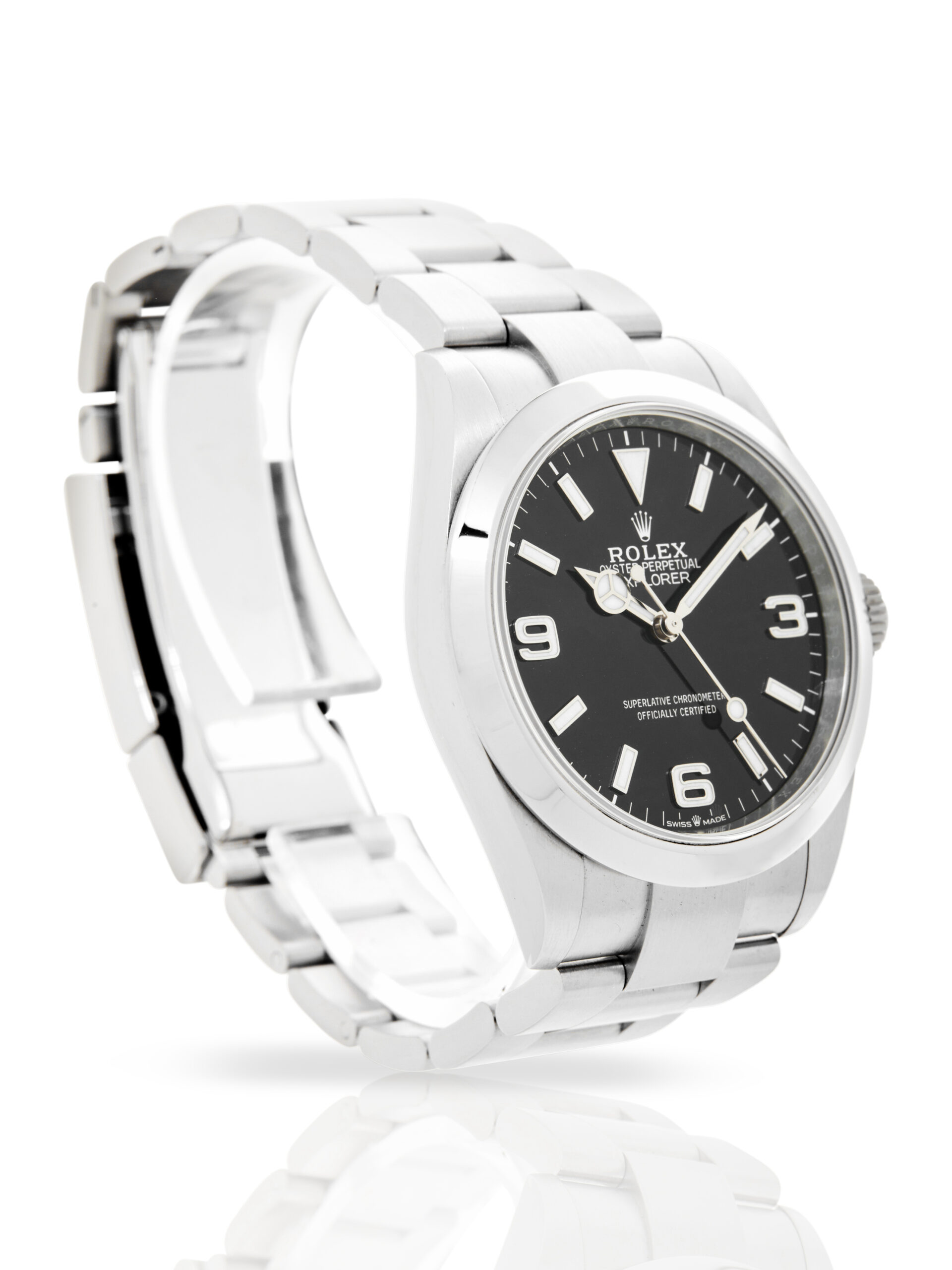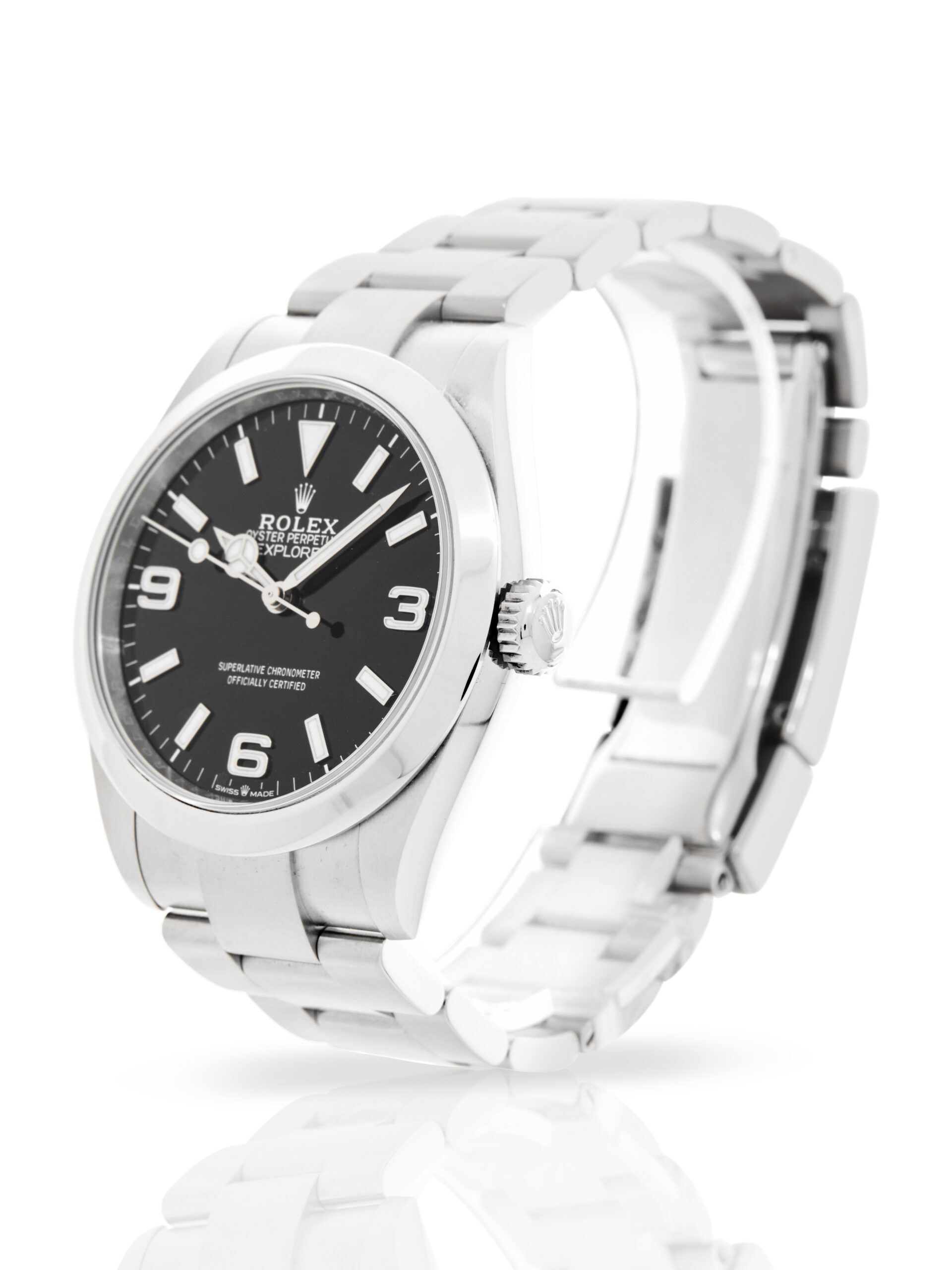 Presented in excellent condition is this stunning example of a 2023 Rolex Explorer 40 224270. The watch features a 40mm stainless steel case, smooth stainless steel bezel, black dial with luminescent hour markers, quarter Arabic numerals and is coupled to a stainless steel Oyster bracelet. Having been professionally tested for condition and accuracy, it’s deemed to be running perfectly and is showing barely any signs of wear.