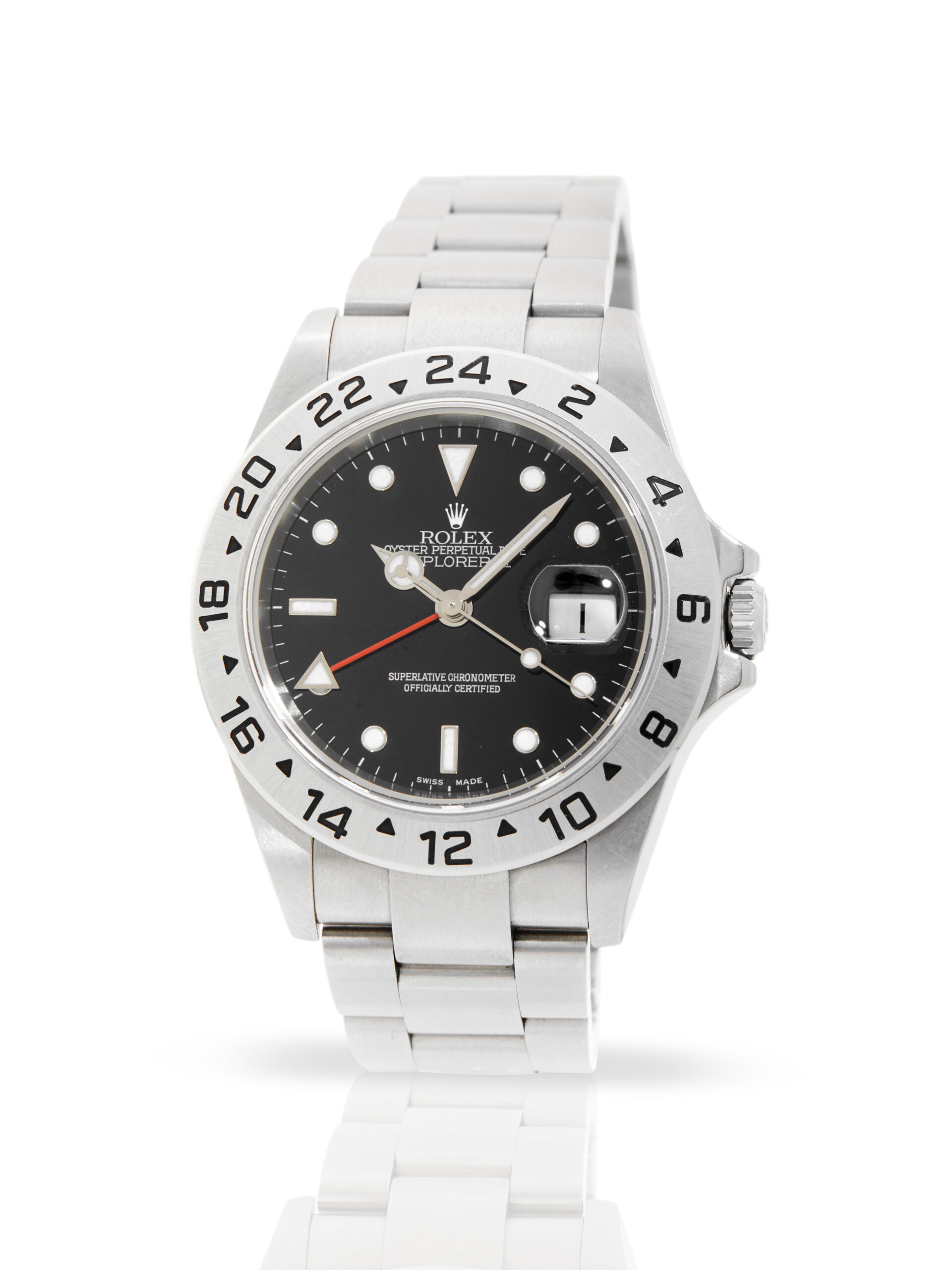 Presented in fantastic condition is this stunning example of a 2006 Rolex Explorer II 16570. The watch features a 40mm stainless steel case, black dial with luminescent hour markers, brushed stainless steel bezel with a GMT scale and is coupled to a stainless steel Oyster bracelet. Having been professionally tested for condition and accuracy, it’s deemed to be running very well and is showing only minor signs of wear.