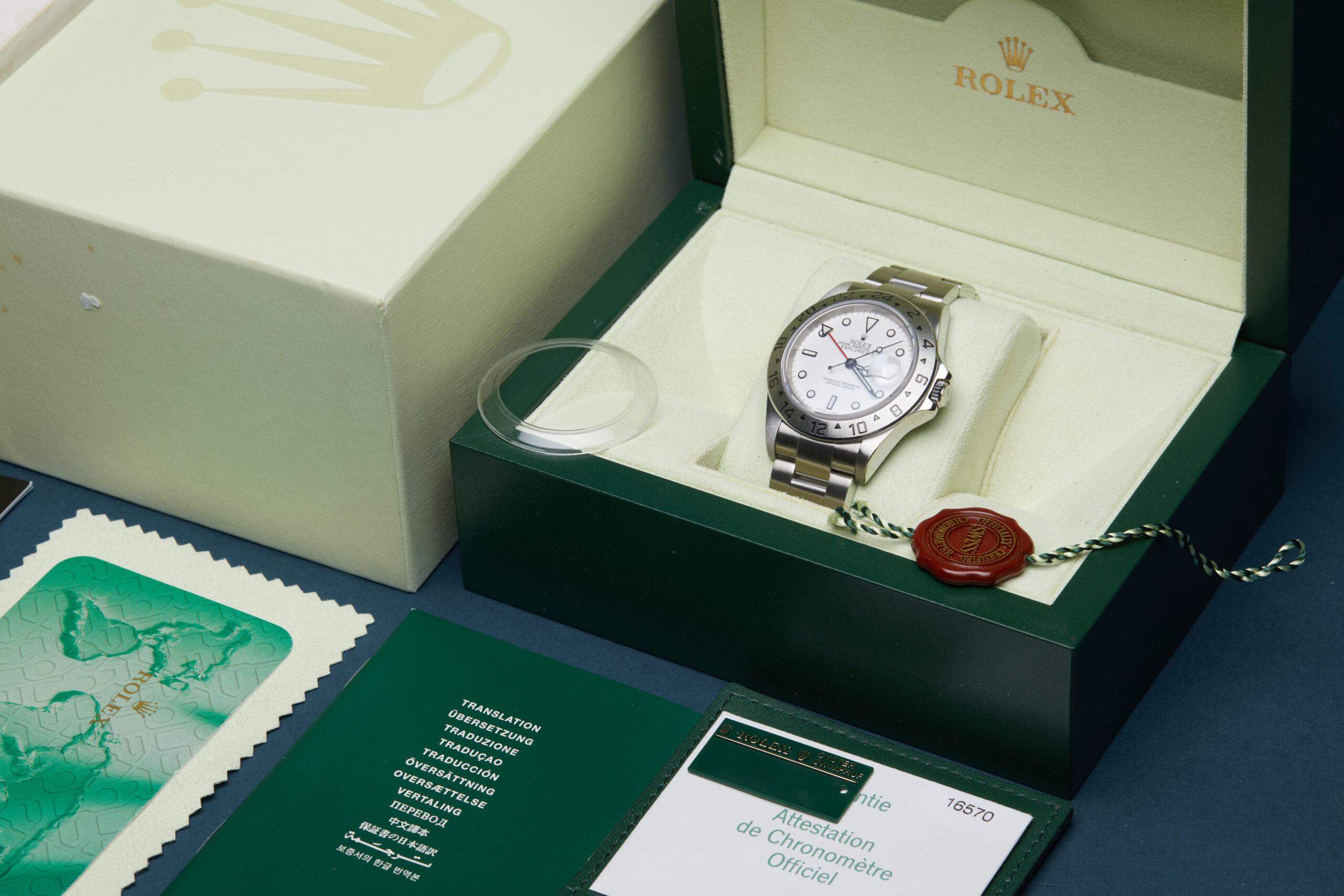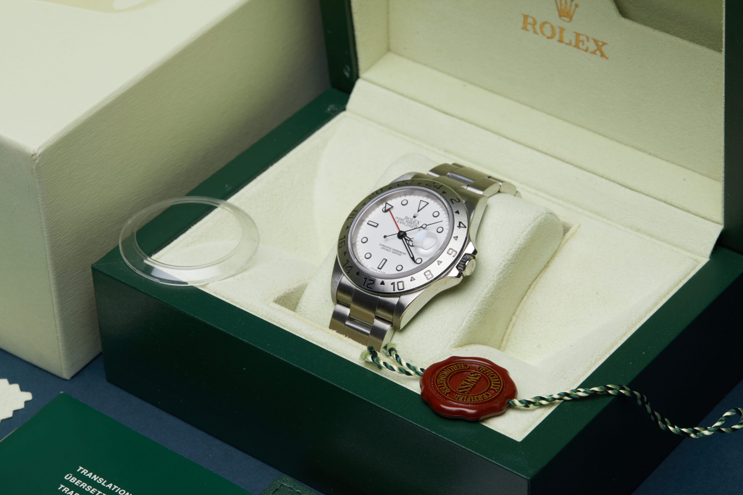 The watch is supplied with its original Rolex box, green leather wallet, manuals, Rolex calendar, polishing cloth, bezel protector, 2x swing tags and warranty card dated Q2 2005 (UK supplied).