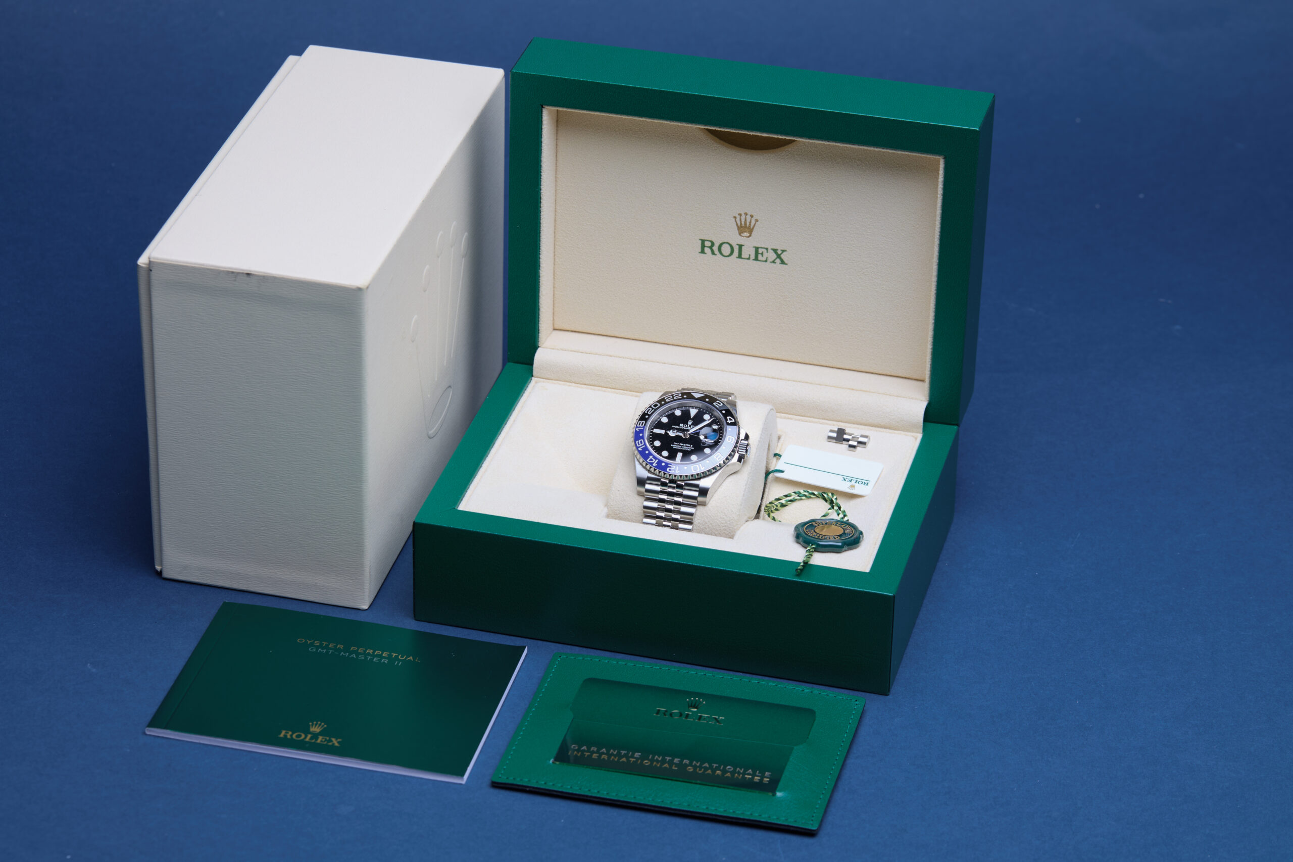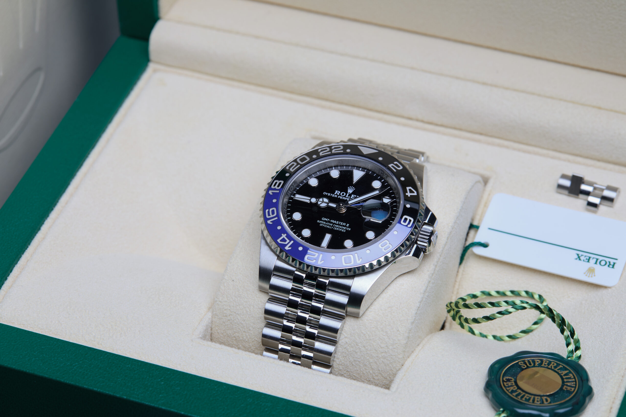 The watch is supplied with its original Rolex box, green leather wallet, manuals, 2x swing tags and warranty card dated Q2 2023.