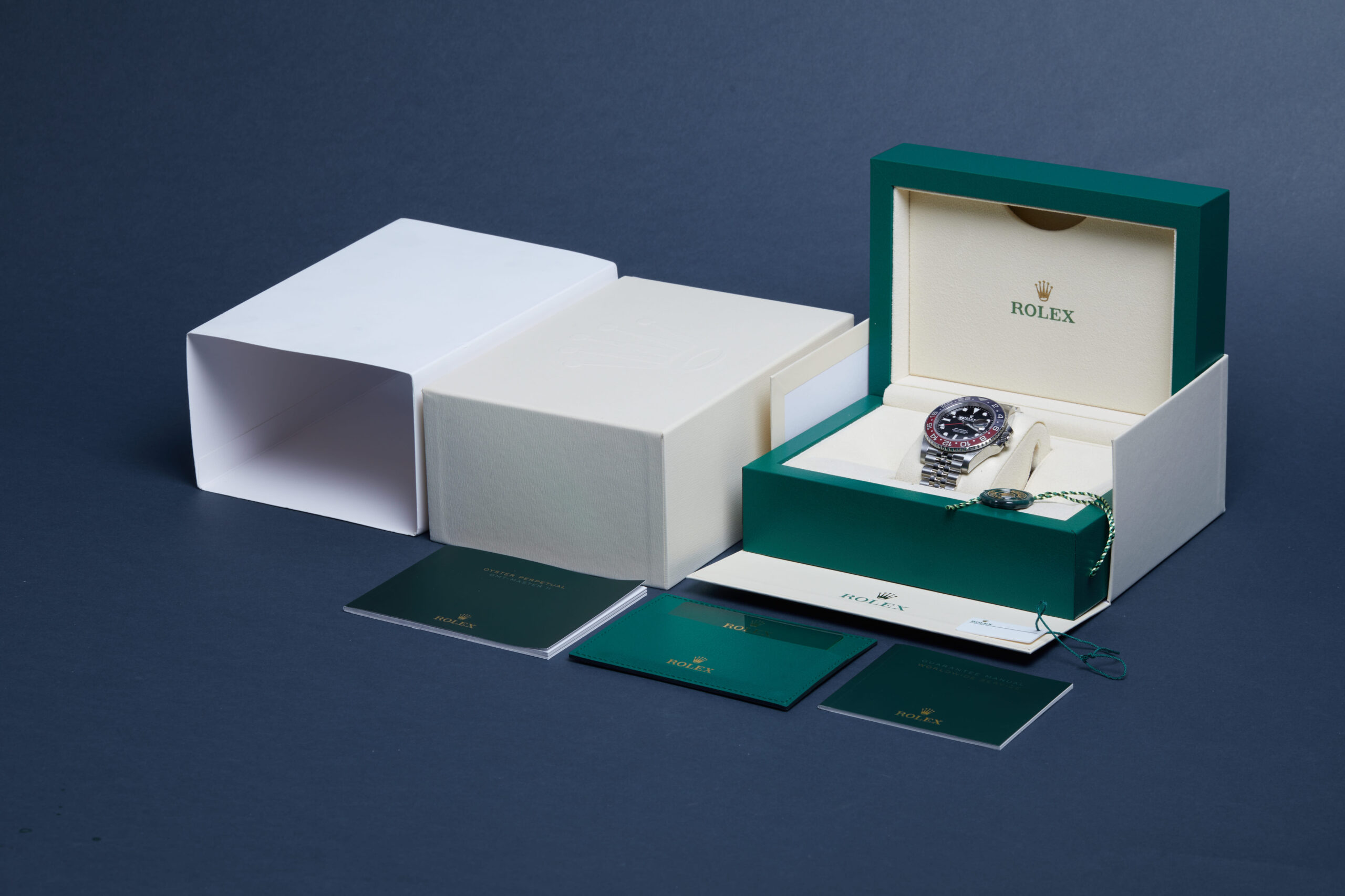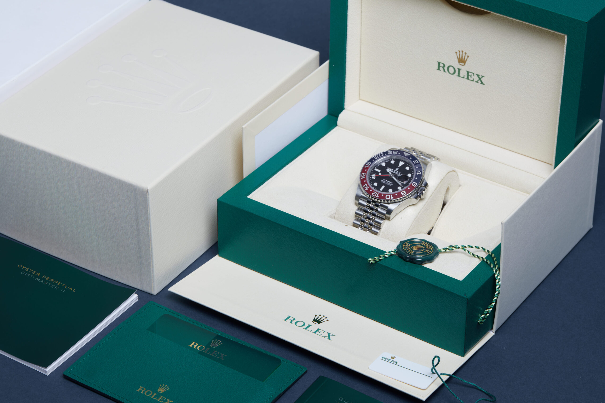 The watch is supplied with its original Rolex box, green leather wallet, manuals, 2x swing tags and warranty card dated Q4 2022.