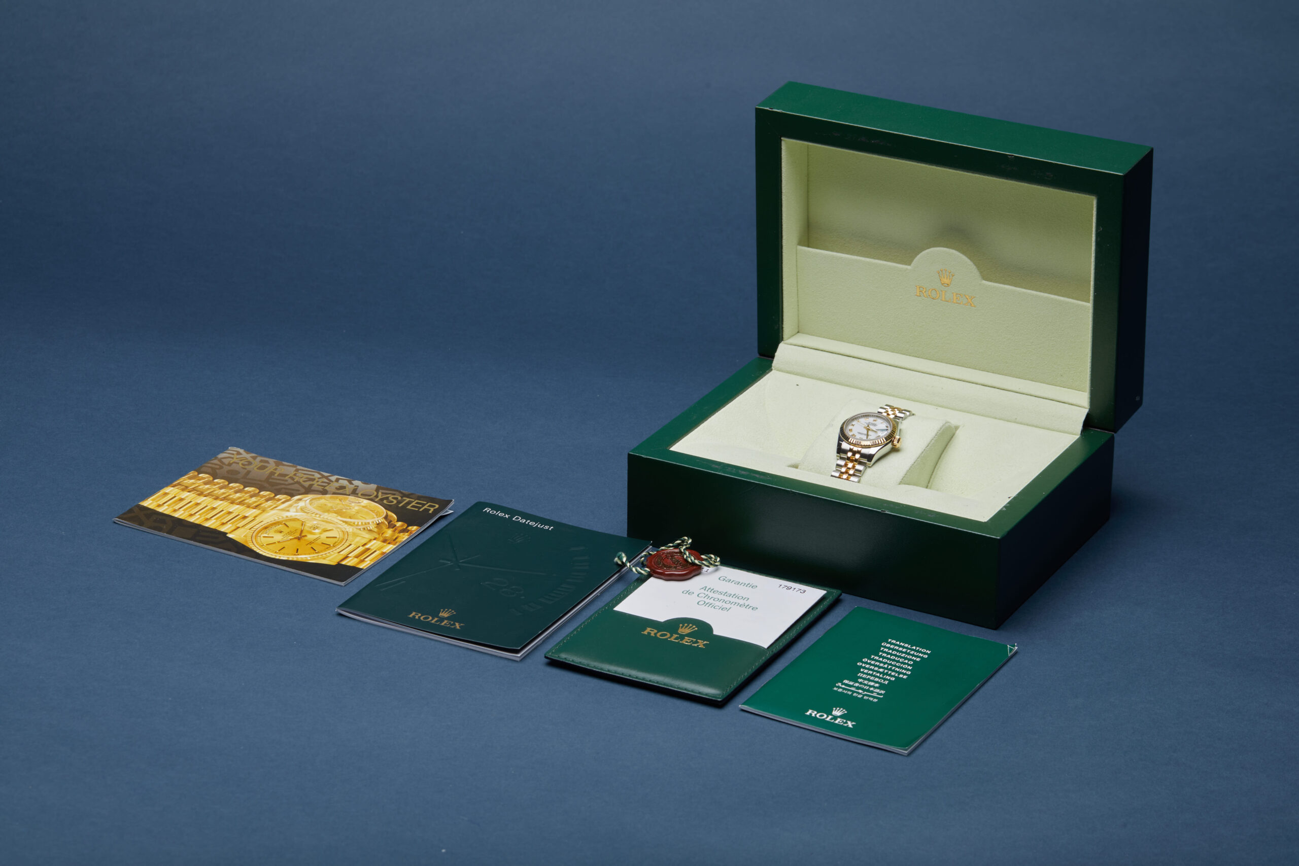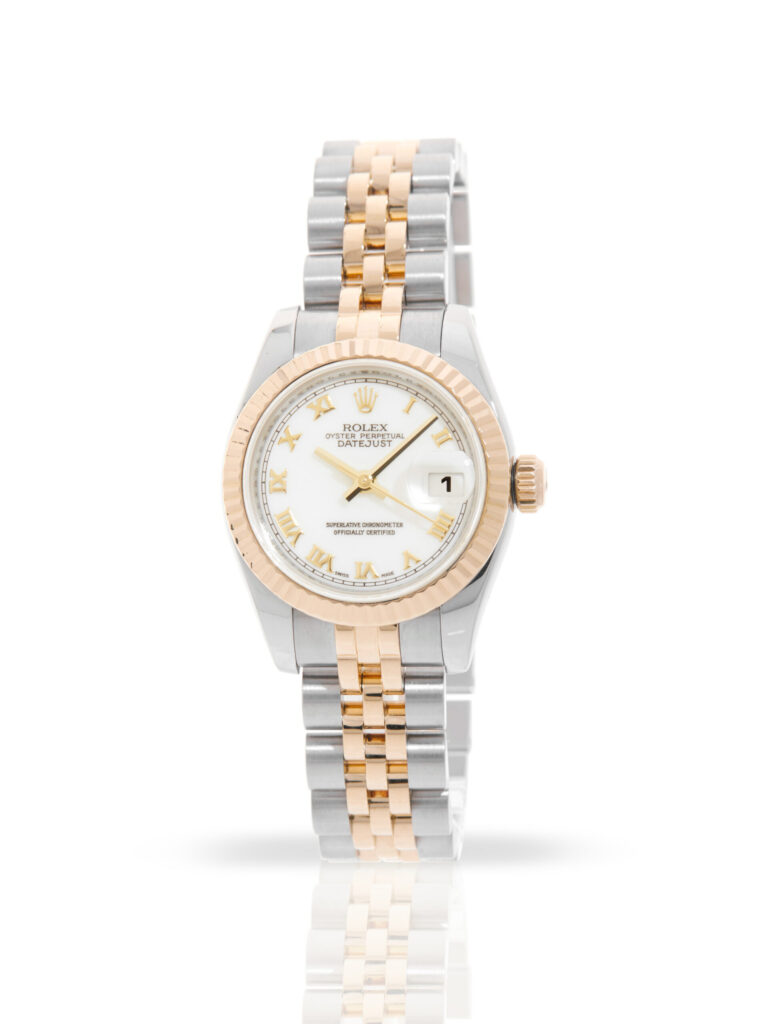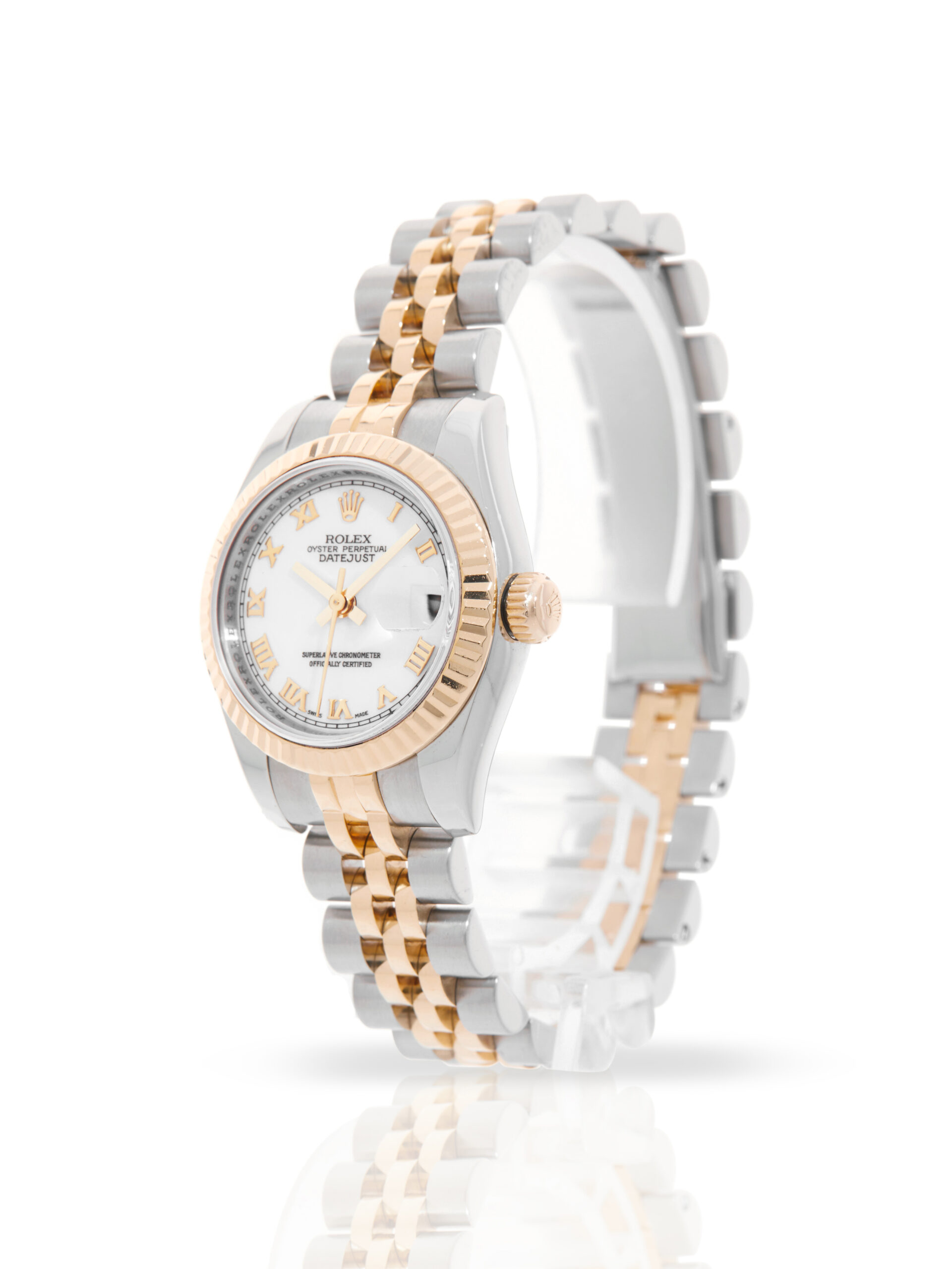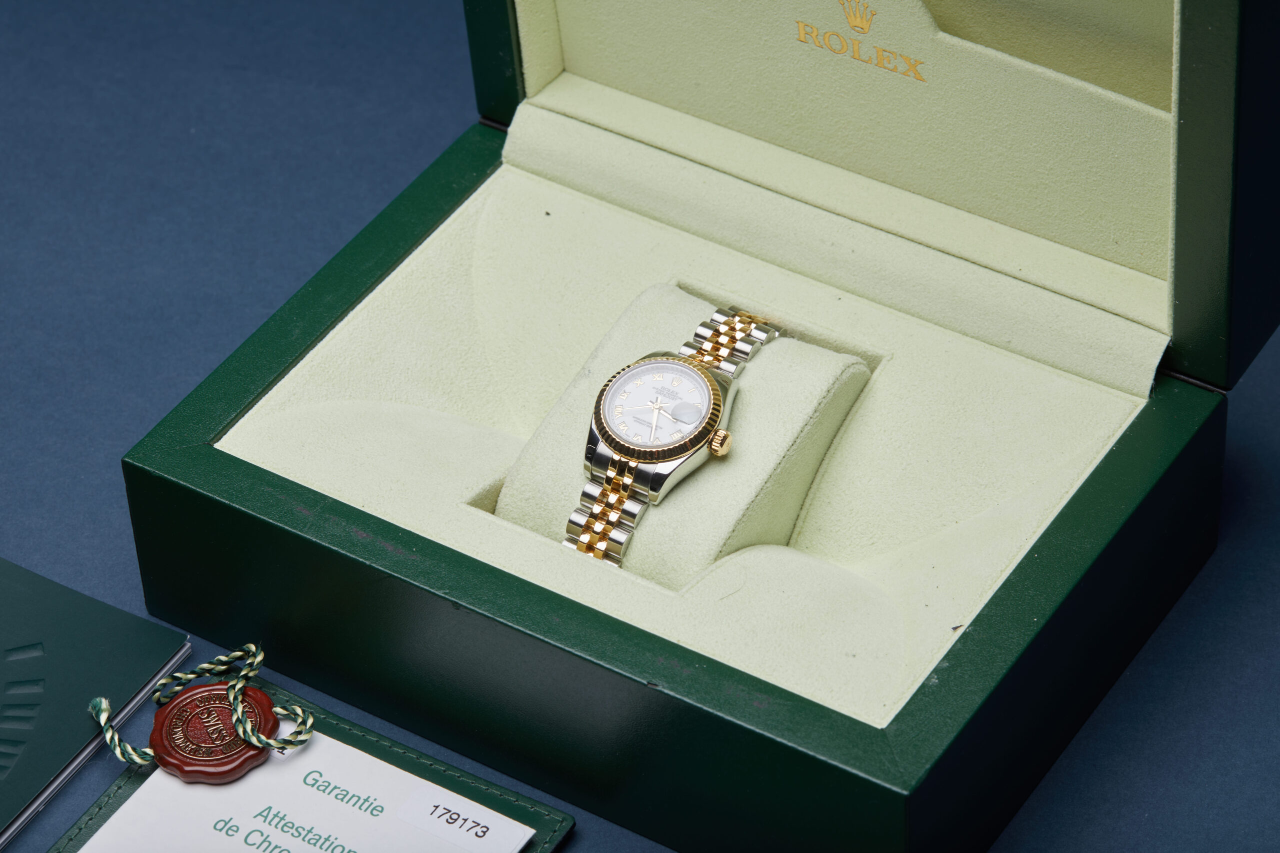 Presented in fantastic condition is this lovely example of a 2007 Rolex Lady Datejust 26 179173. The watch features a 26mm stainless steel case, white dial with Roman numerals, 18K yellow gold fluted bezel and is coupled to a bi-metal Jubilee bracelet with a folding clasp. Having been professionally tested for condition and accuracy, it’s deemed to be running very well and is showing minor signs of wear.