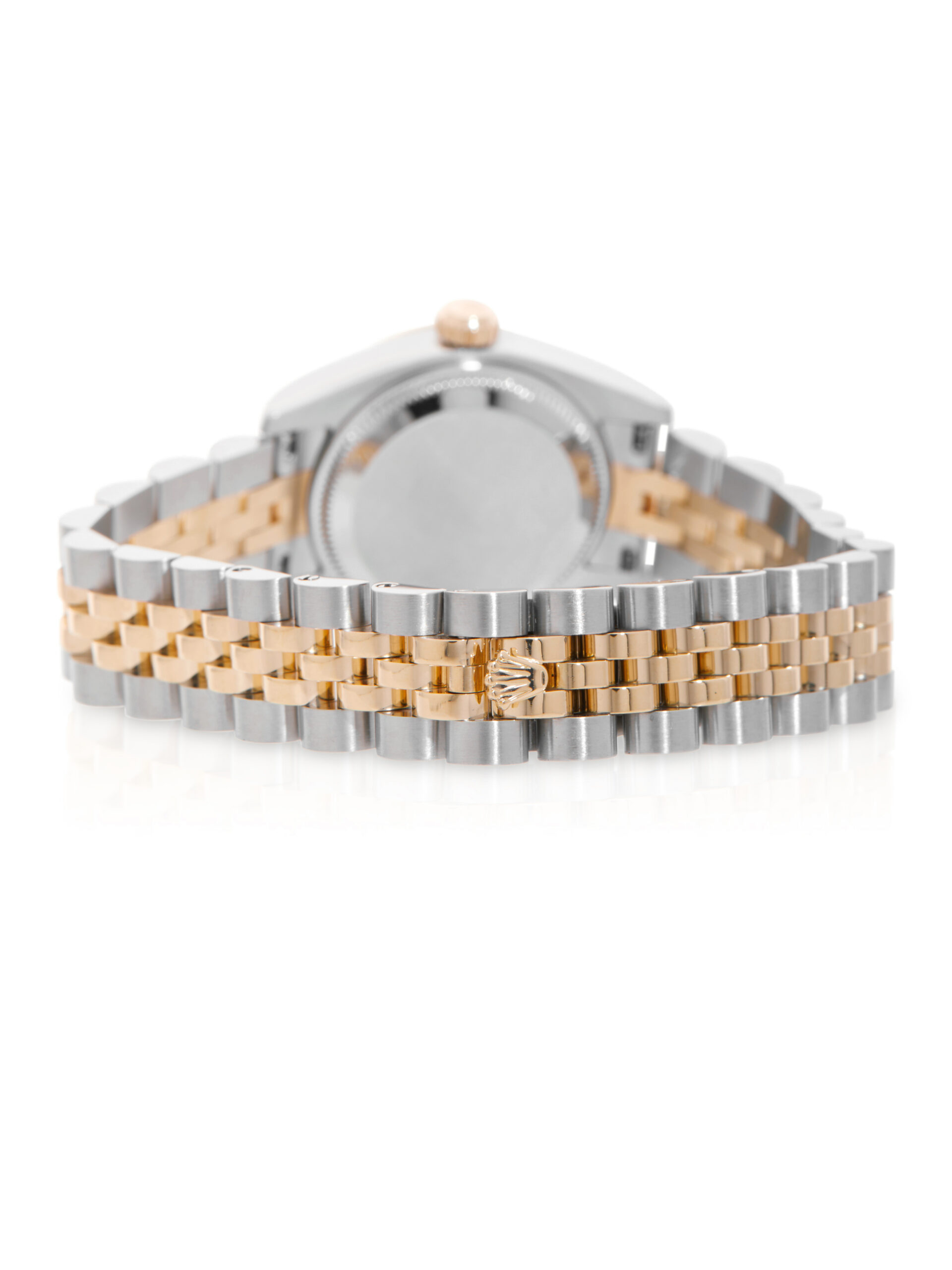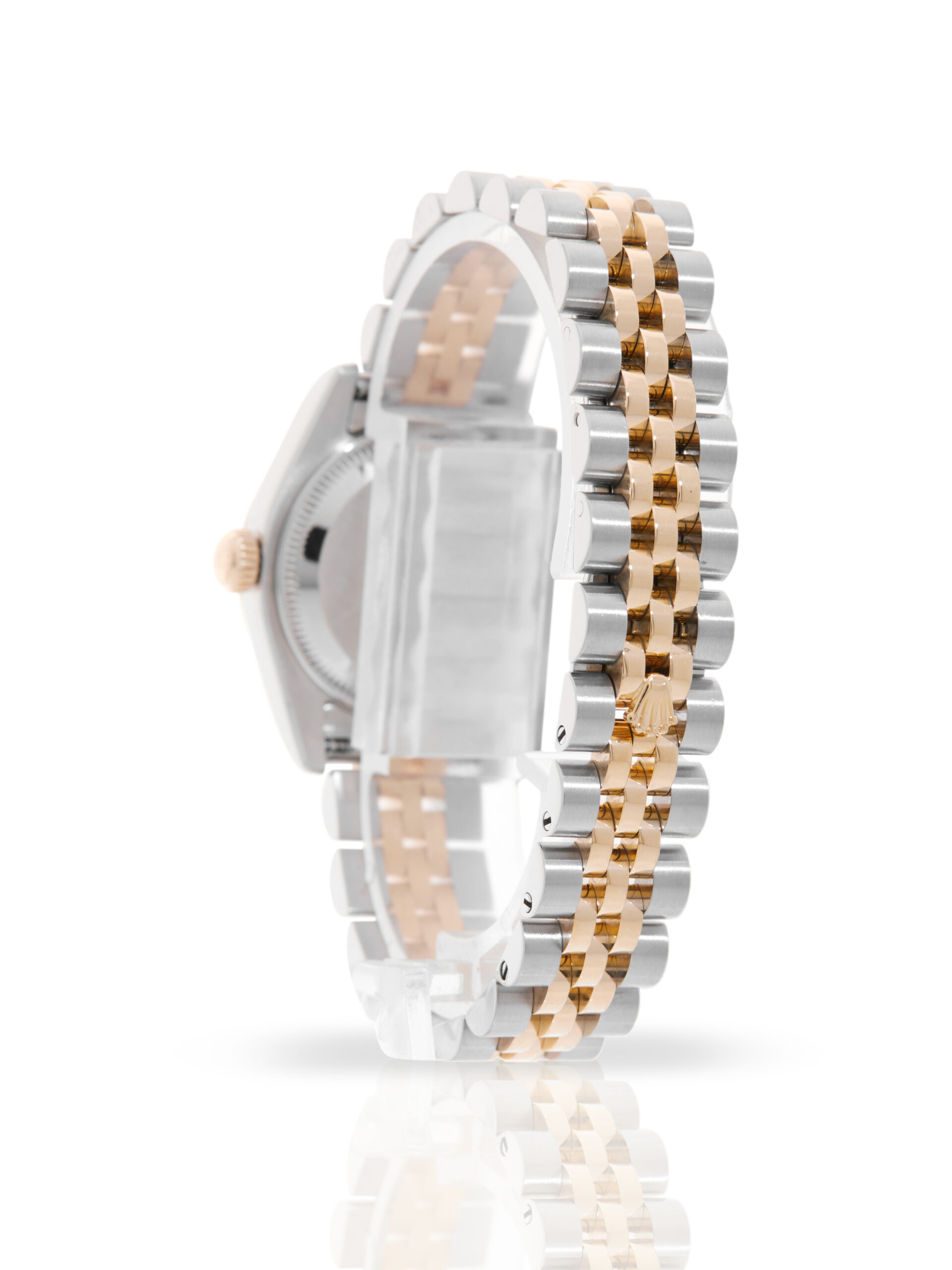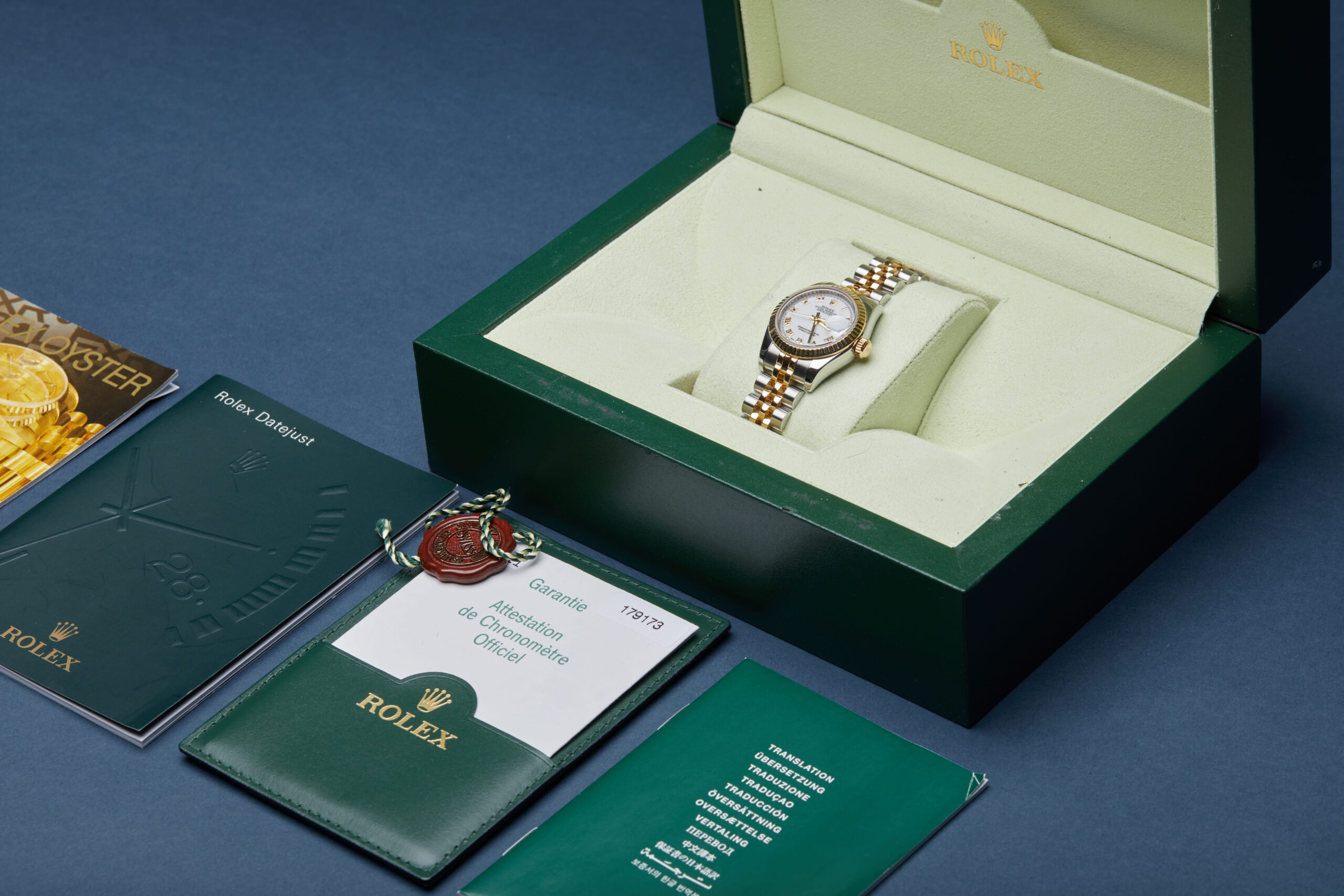 Presented in fantastic condition is this lovely example of a 2007 Rolex Lady Datejust 26 179173. The watch features a 26mm stainless steel case, white dial with Roman numerals, 18K yellow gold fluted bezel and is coupled to a bi-metal Jubilee bracelet with a folding clasp. Having been professionally tested for condition and accuracy, it’s deemed to be running very well and is showing minor signs of wear.
