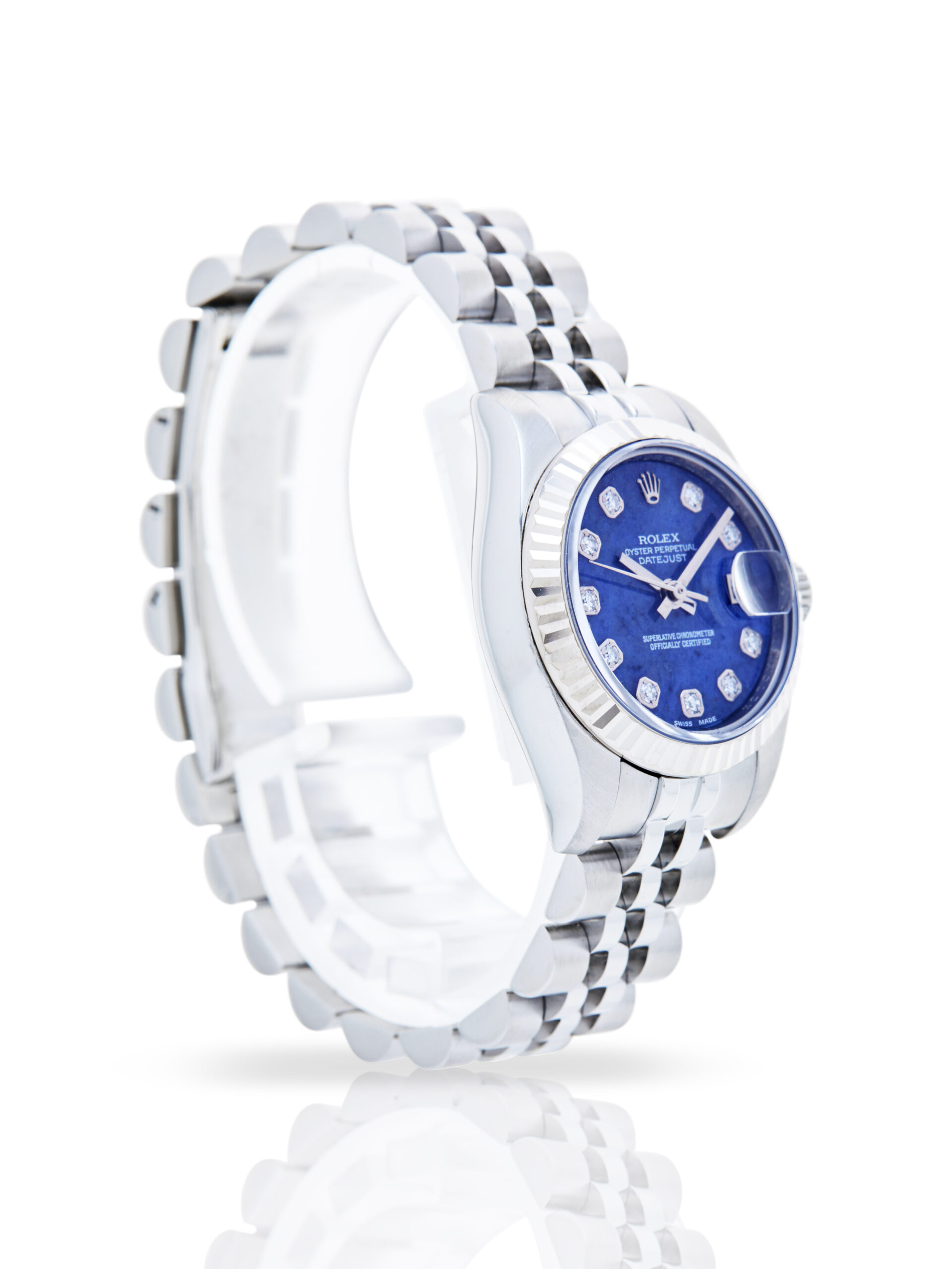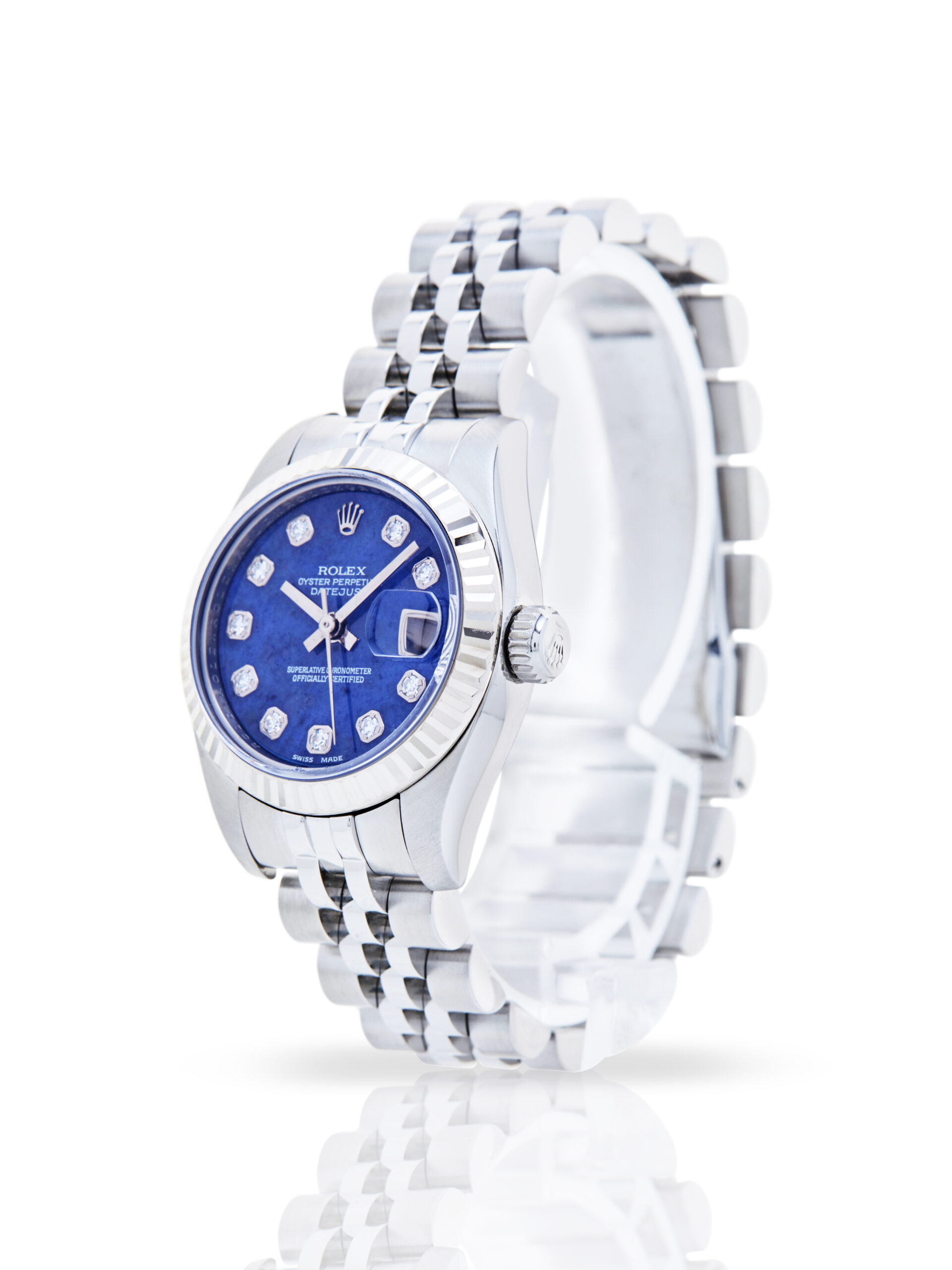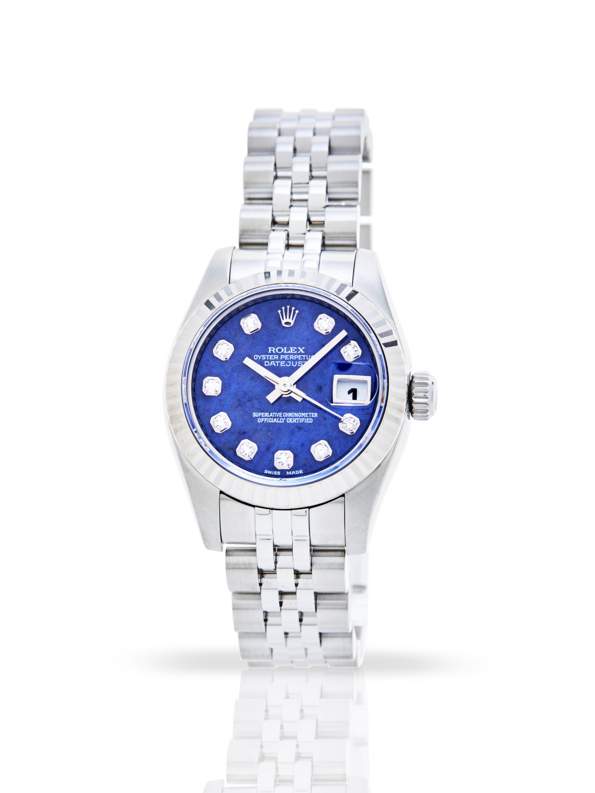 Presented in fantastic condition is this lovely example of a 2009 Rolex Lady Datejust 26 179174. The watch features a 26mm stainless steel case, a rare sodalite dial with diamond hour markers, 18K white gold fluted bezel and is coupled to a stainless steel Jubilee bracelet. Having been professionally tested for condition and accuracy, it’s deemed to be running very well and is showing only minor signs of wear.