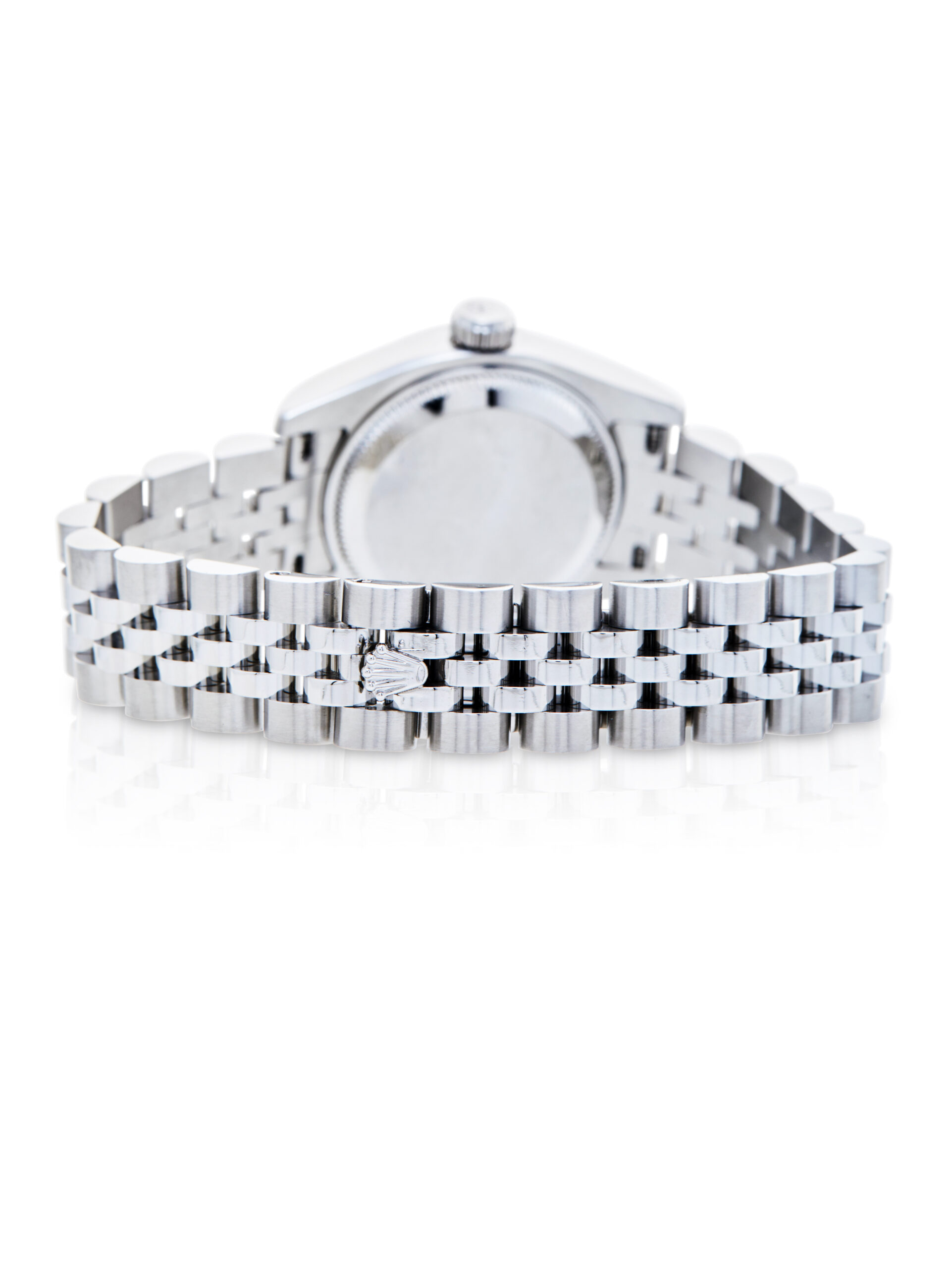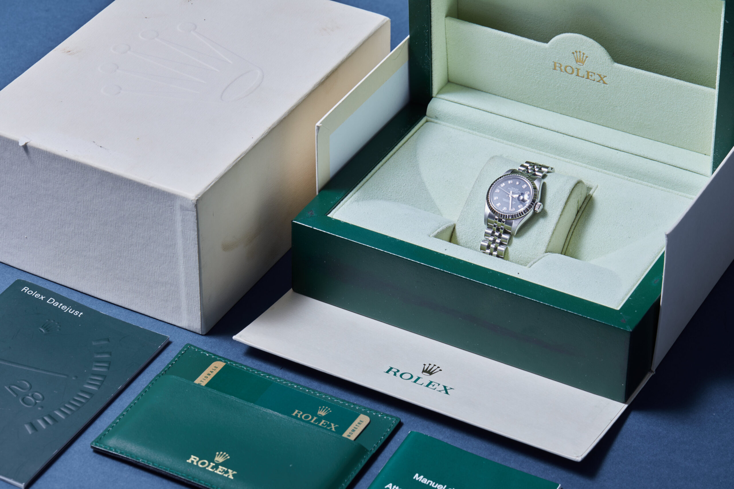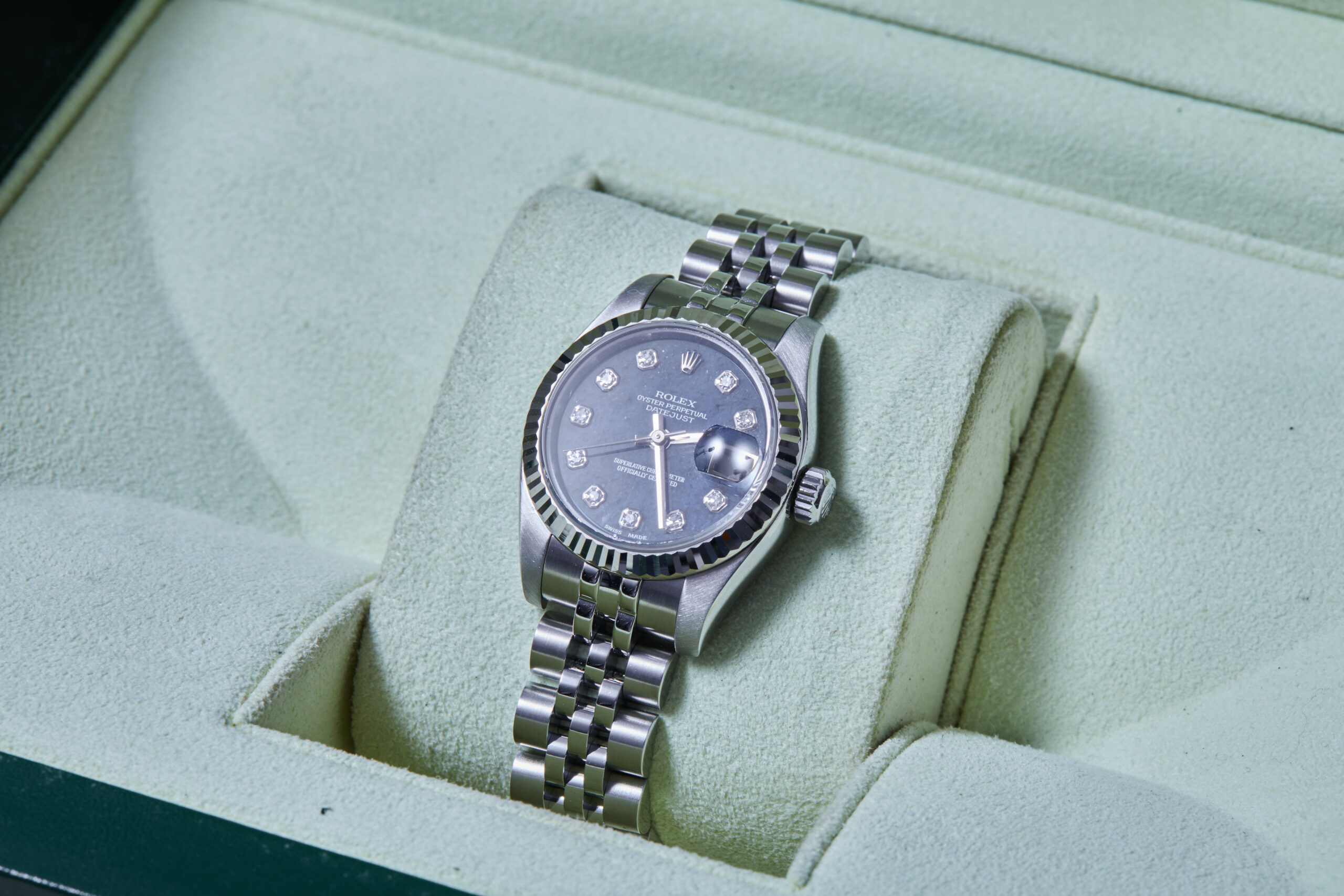 Presented in fantastic condition is this lovely example of a 2009 Rolex Lady Datejust 26 179174. The watch features a 26mm stainless steel case, a rare sodalite dial with diamond hour markers, 18K white gold fluted bezel and is coupled to a stainless steel Jubilee bracelet. Having been professionally tested for condition and accuracy, it’s deemed to be running very well and is showing only minor signs of wear.