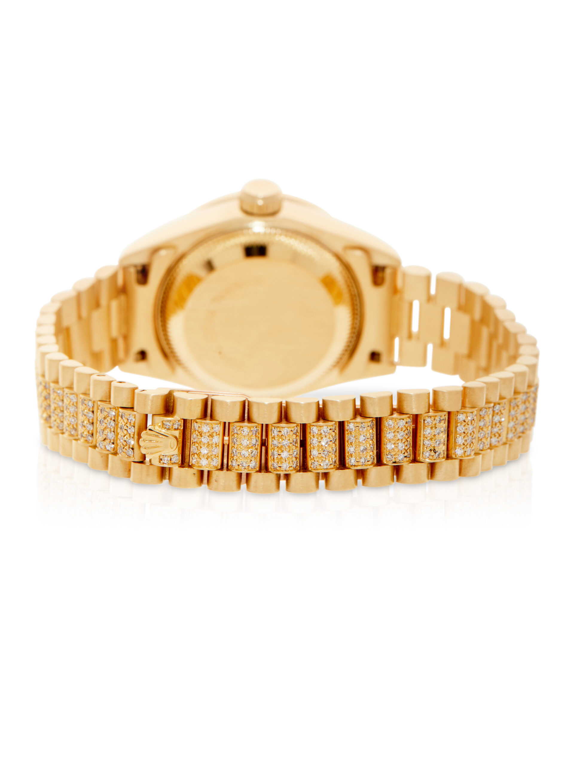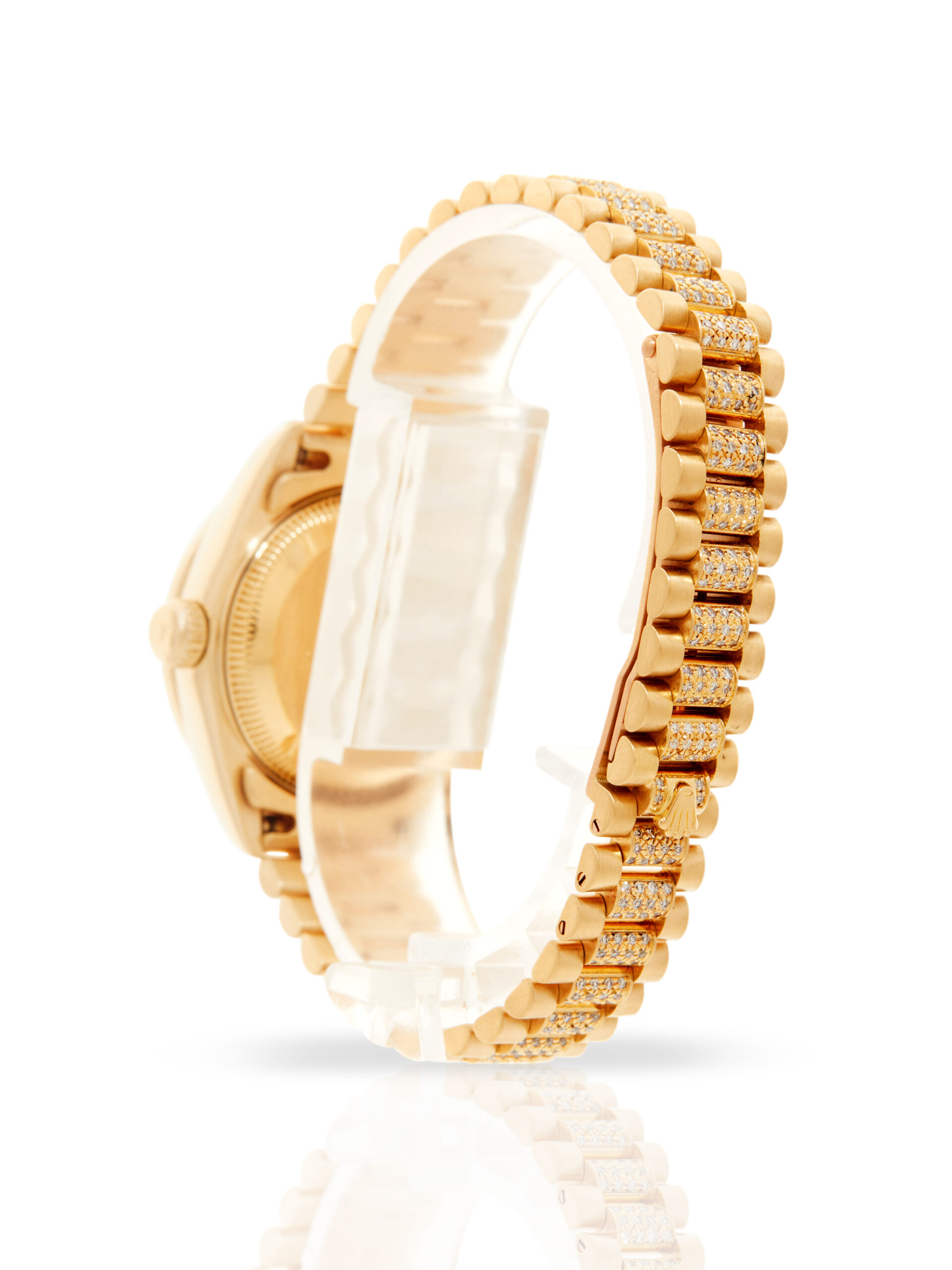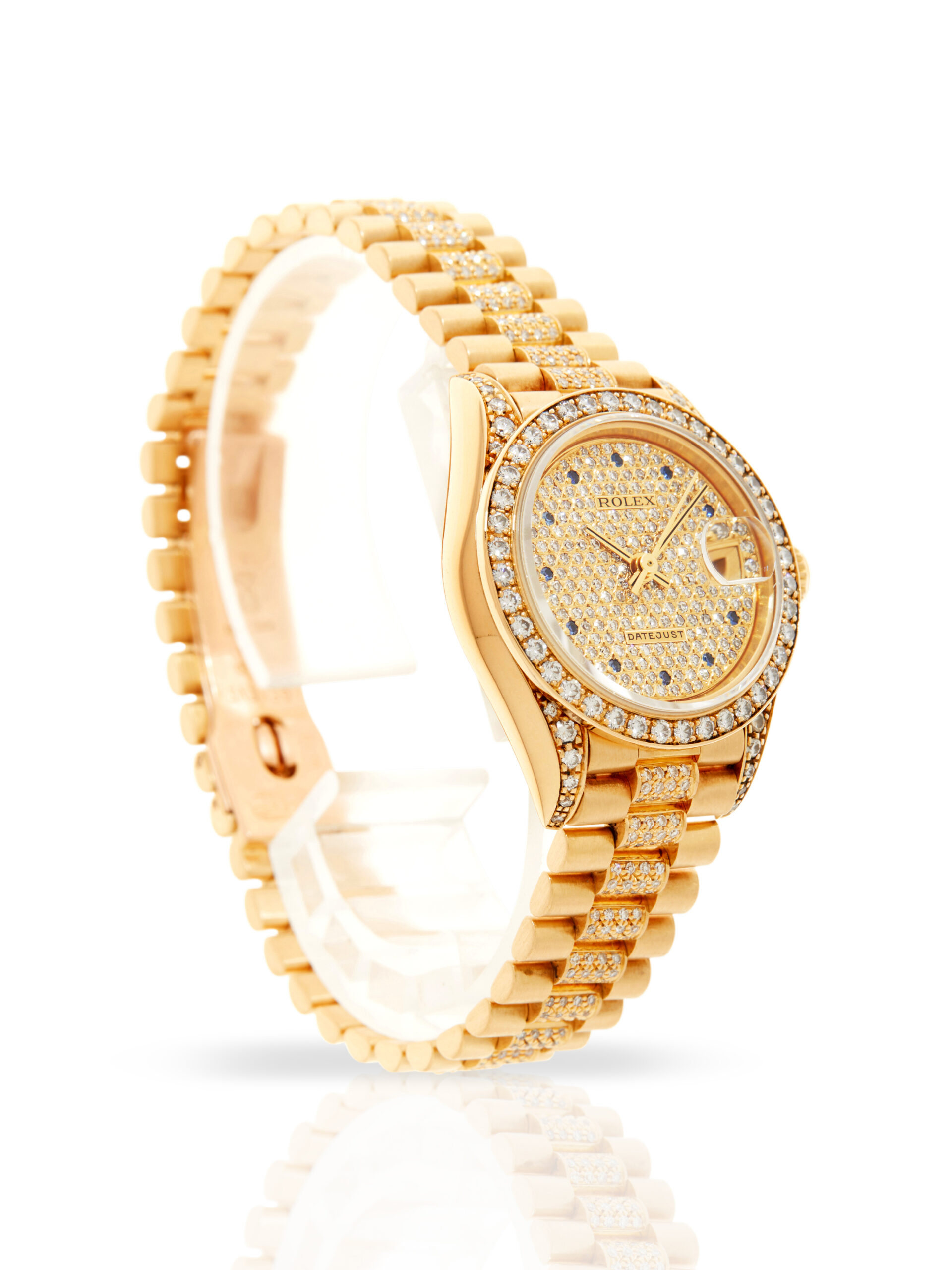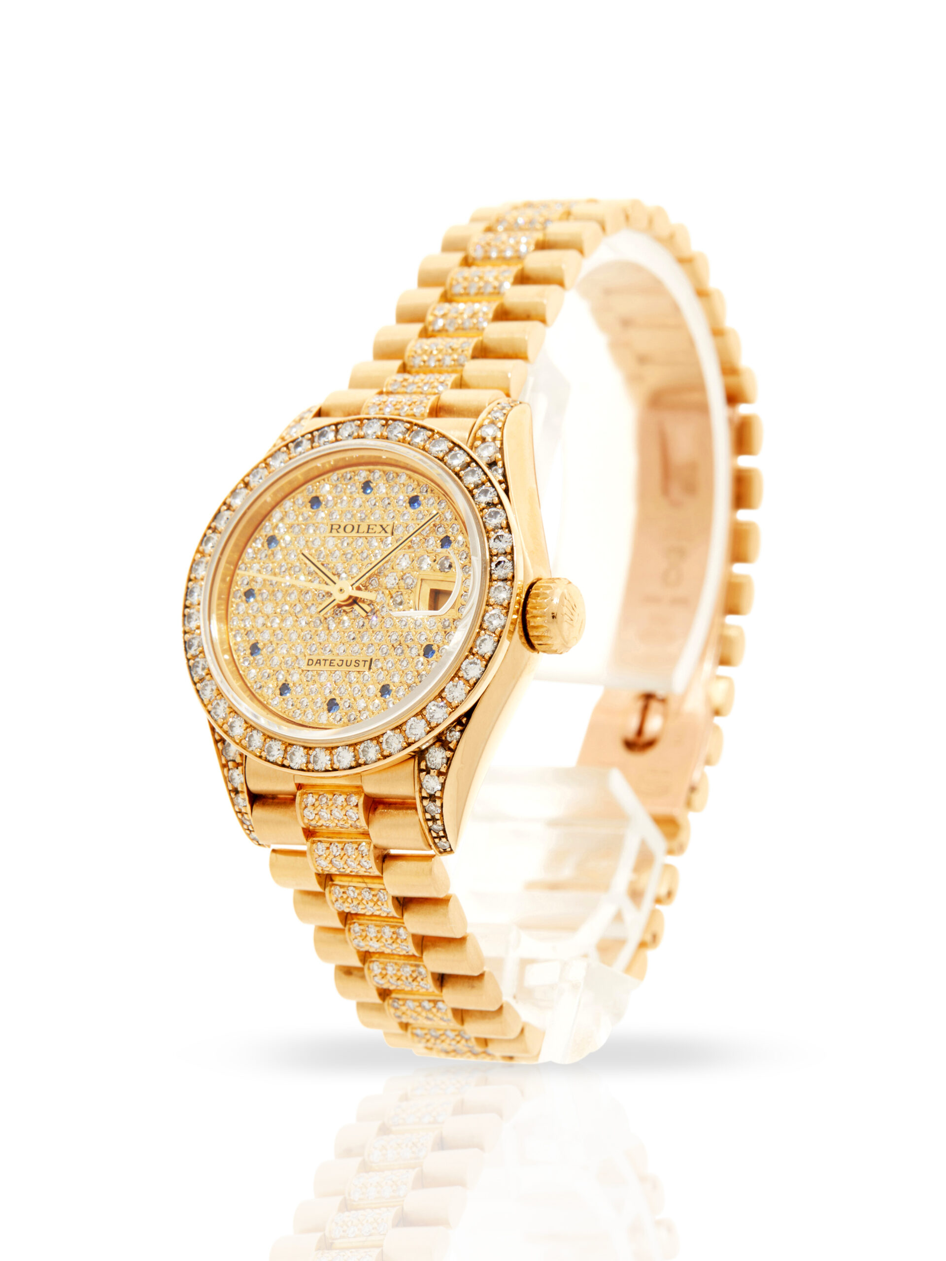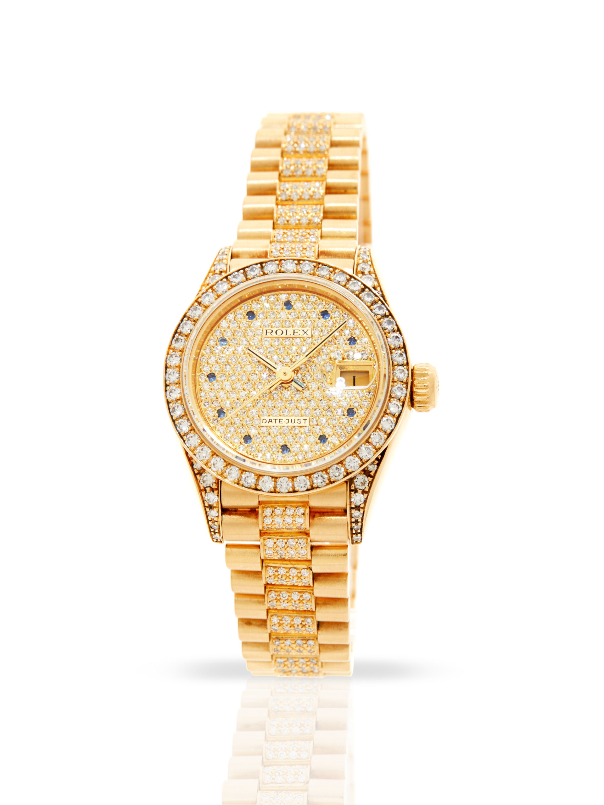 This lovely and rare example of a 1989 Rolex Lady Datejust 26 69158 features a 26mm 18K yellow gold case, factory diamond set champagne dial with blue gem stones, 18K yellow gold bezel with factory set diamonds and is coupled to an 18K yellow gold President bracelet with factory diamond set centre links. Having been professionally tested for condition and accuracy, it’s deemed to be running very well and is showing minor imperfections.