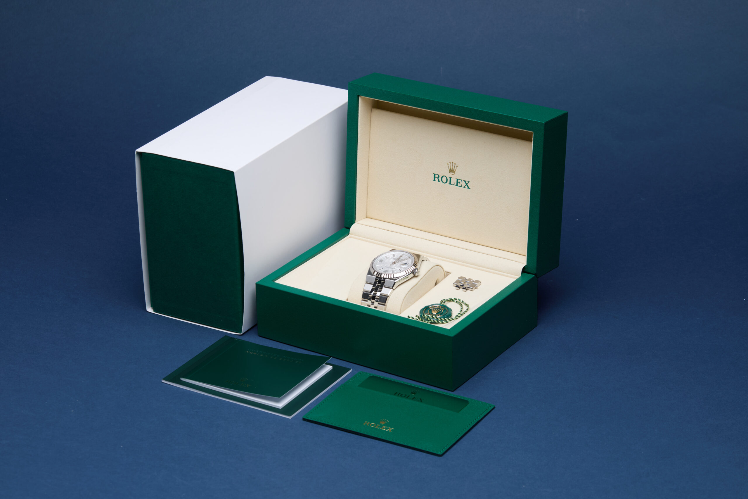 The watch is supplied with its original Rolex box, green leather wallet, manuals, green swing tag and warranty card.
