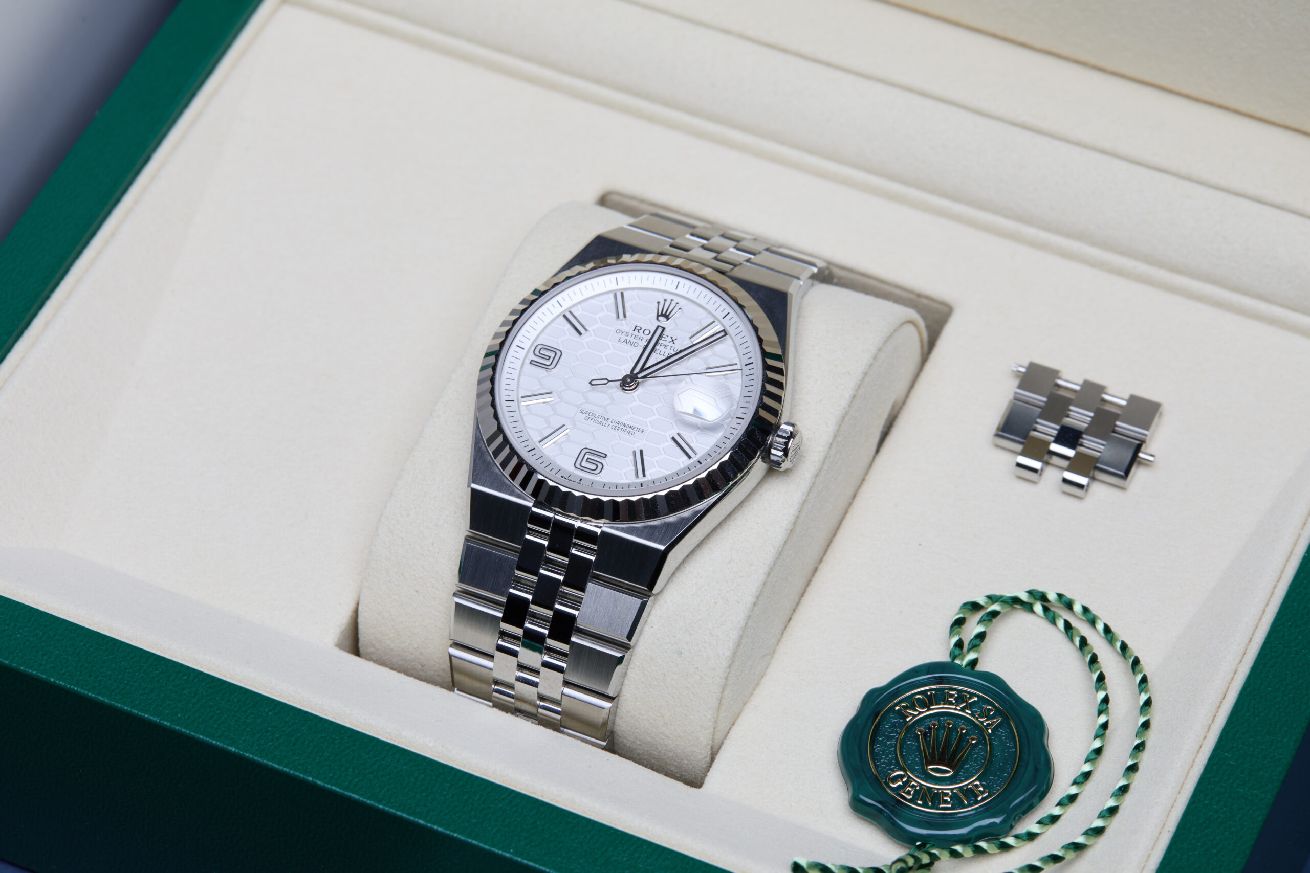 Presented in unworn condition is this beautiful example of a 2025 Rolex Land-Dweller 40 127334. The watch features a 40mm stainless steel case, ‘intense’ white honeycomb-motif dial with luminescent hour markers, 18K white gold fluted bezel and is coupled to a stainless steel flat Jubilee bracelet with a folding clasp. Having been professionally tested for condition and accuracy, it’s deemed to be running perfectly, ready for its new, lucky owner.