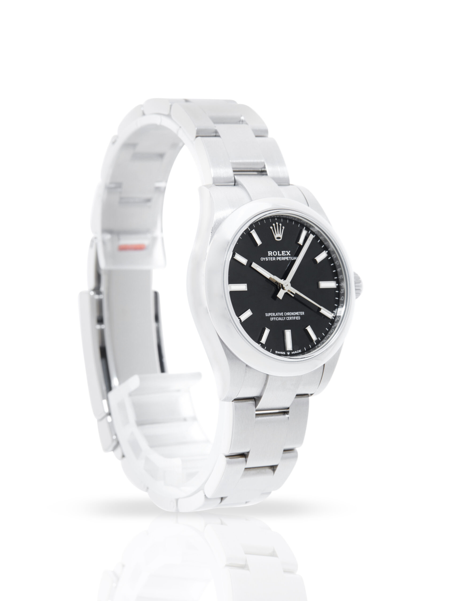 Presented in unworn and stickered condition is this lovely example of a 2024 Rolex Oyster Perpetual 31 277200. The watch features a 31mm stainless steel case, black dial with luminescent hour markers, smooth stainless steel bezel and is coupled to a stainless steel Oyster bracelet. Having been professionally tested for condition and accuracy, it’s deemed to be running perfectly and is showing barely any signs of wear.