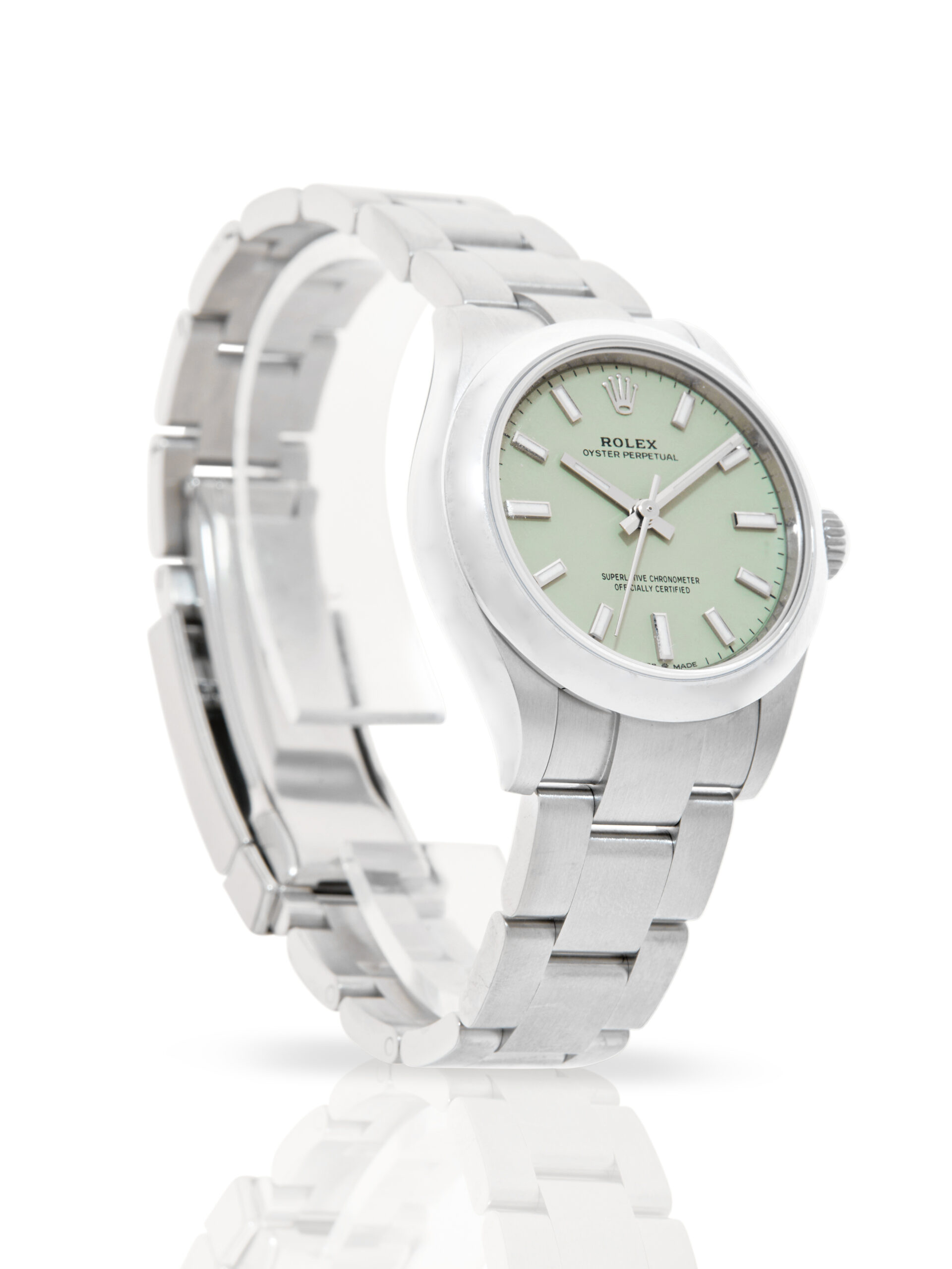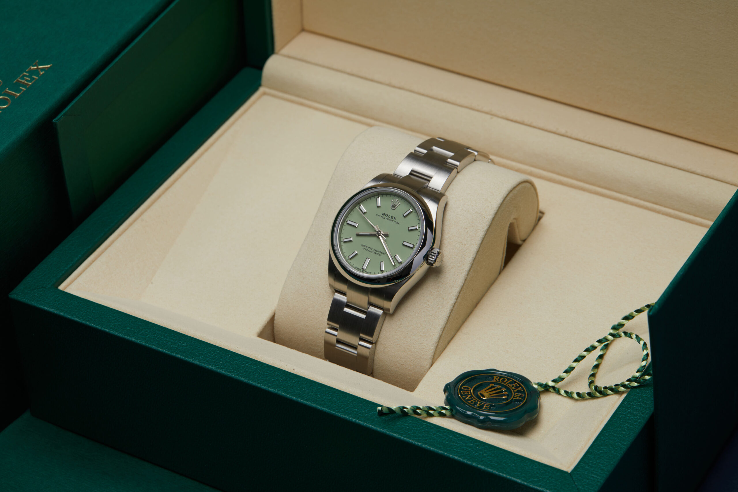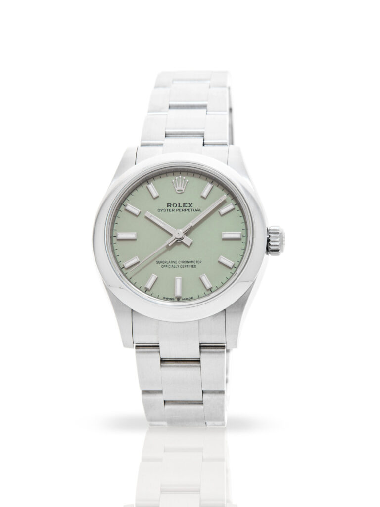 Presented in excellent condition is this elegant example of a 2026 Rolex Oyster Perpetual 31 277200. The watch features a 31mm stainless steel case, smooth stainless steel bezel, pistachio green dial with luminous indices and numerals and is coupled to a stainless steel Oyster bracelet. Having been professionally tested for condition and accuracy, it’s deemed to be running perfectly, ready for its new, lucky owner.