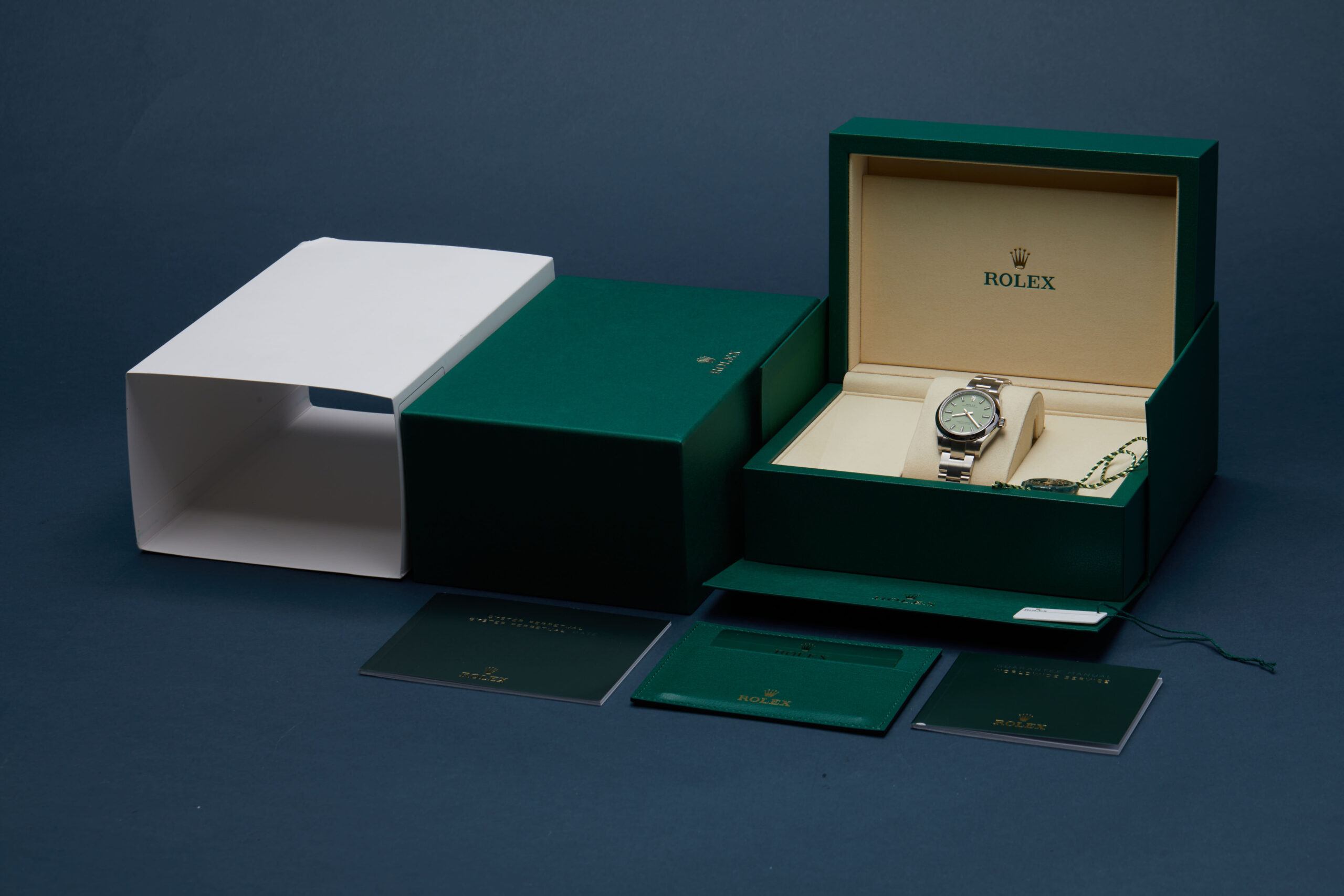 The watch is supplied with its outer box, inner presentation case, green card holder, manual, guarantee booklet, two swing tags and warranty card dated Q1 2026.