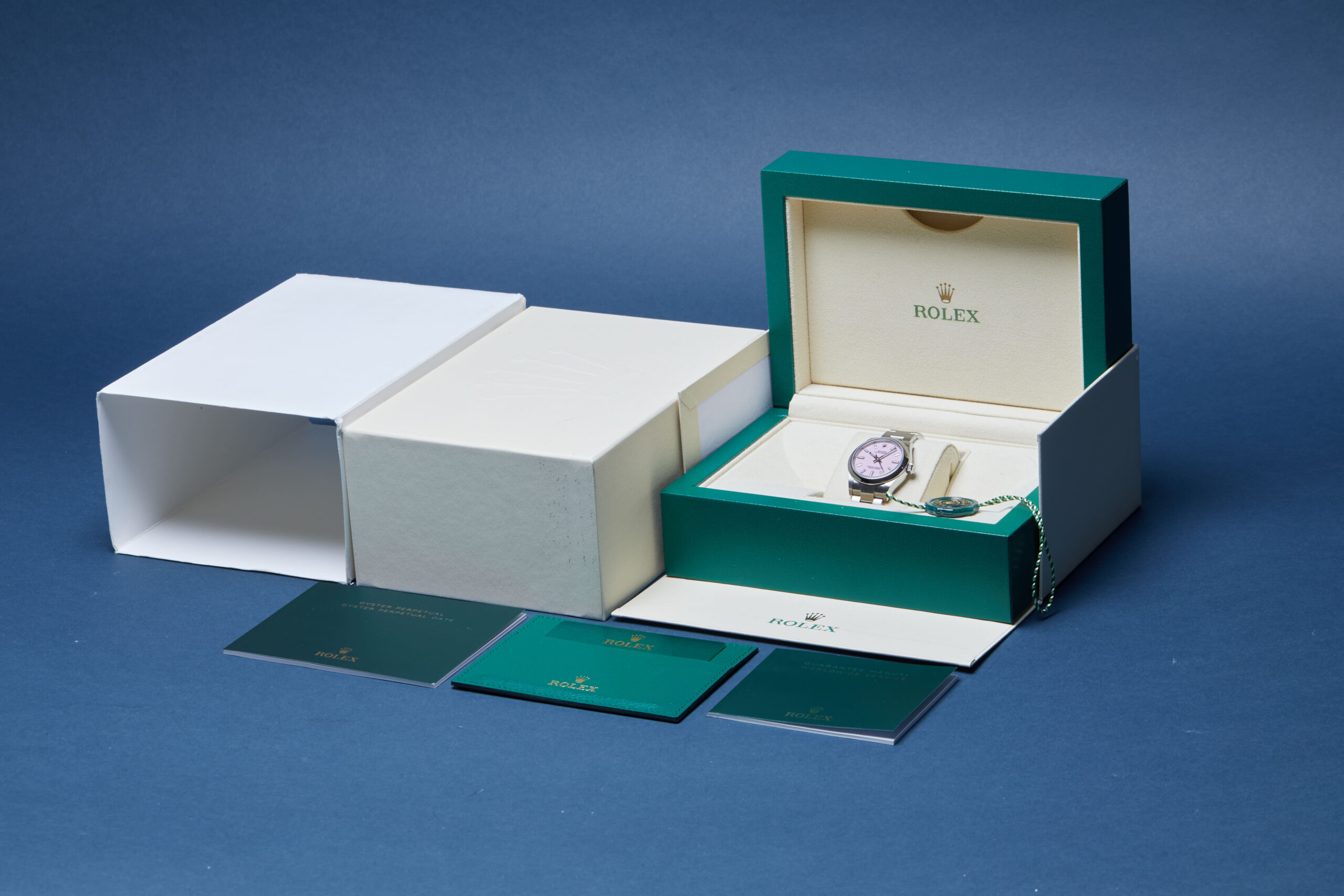 The watch is supplied with its original Rolex box, green leather wallet, manuals, green swing tags and warranty card dated Q1 2022.