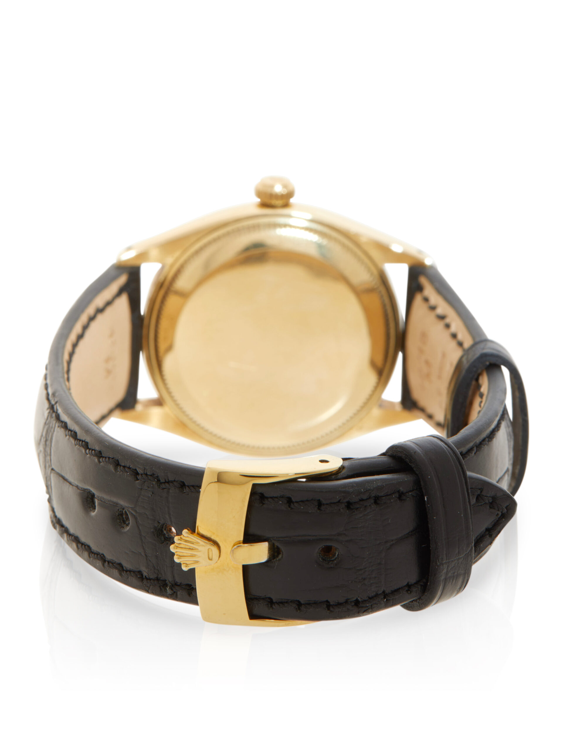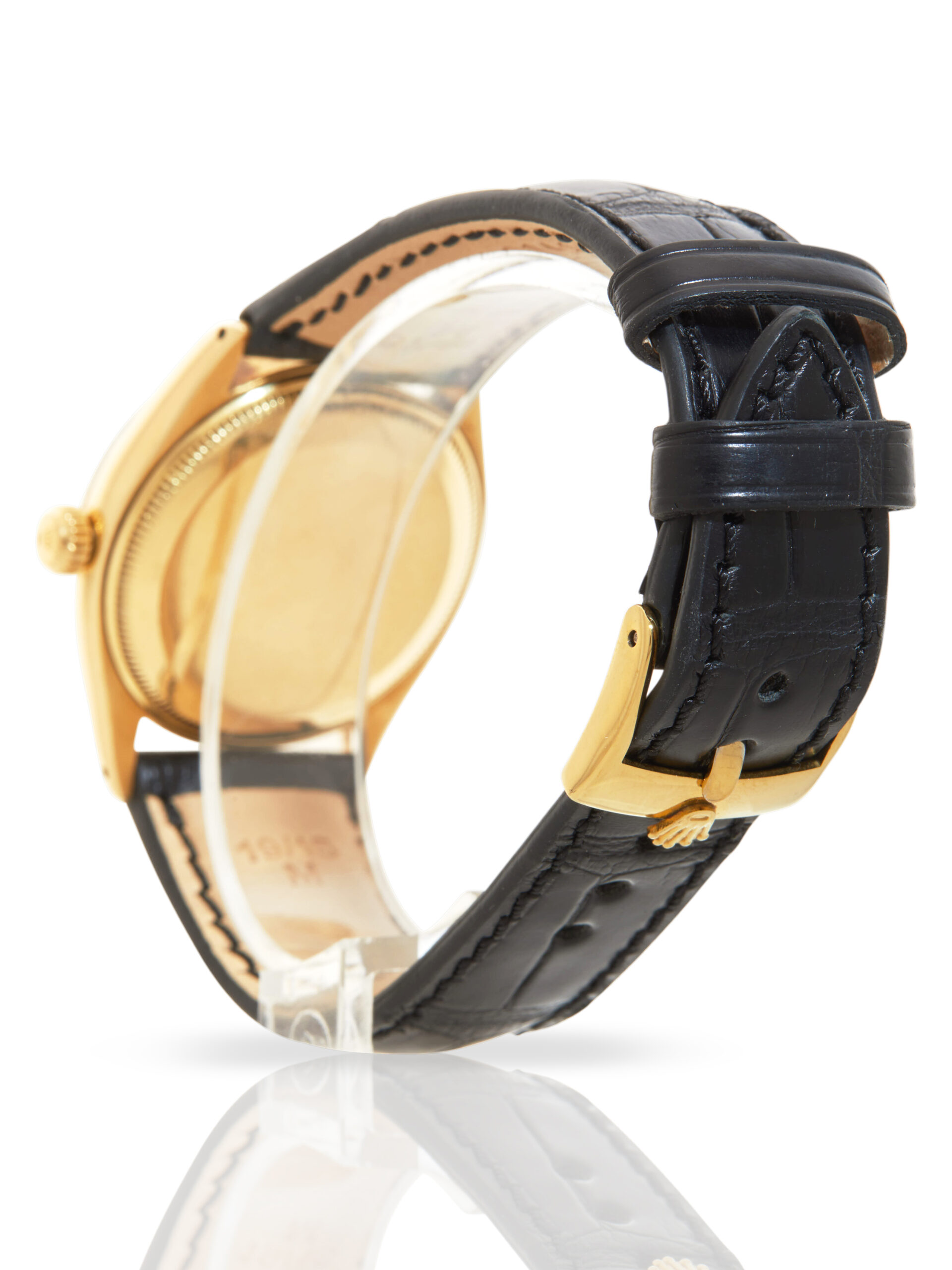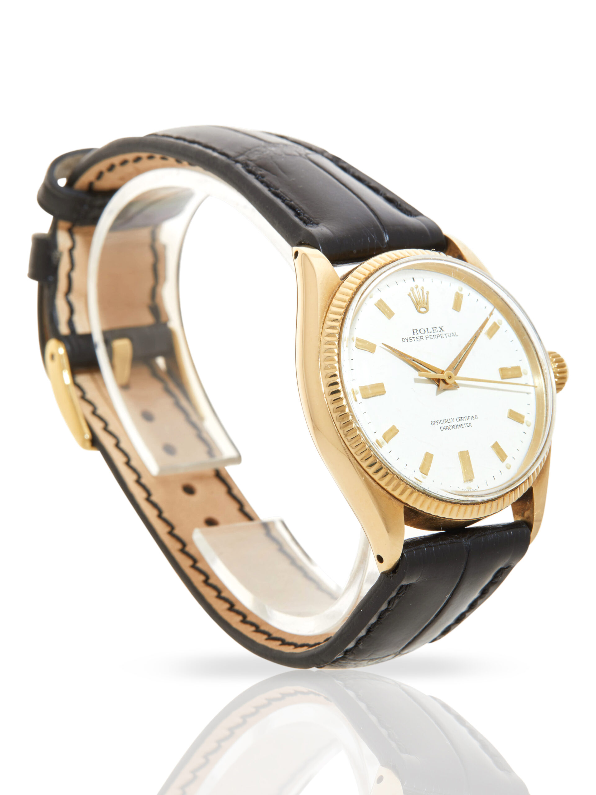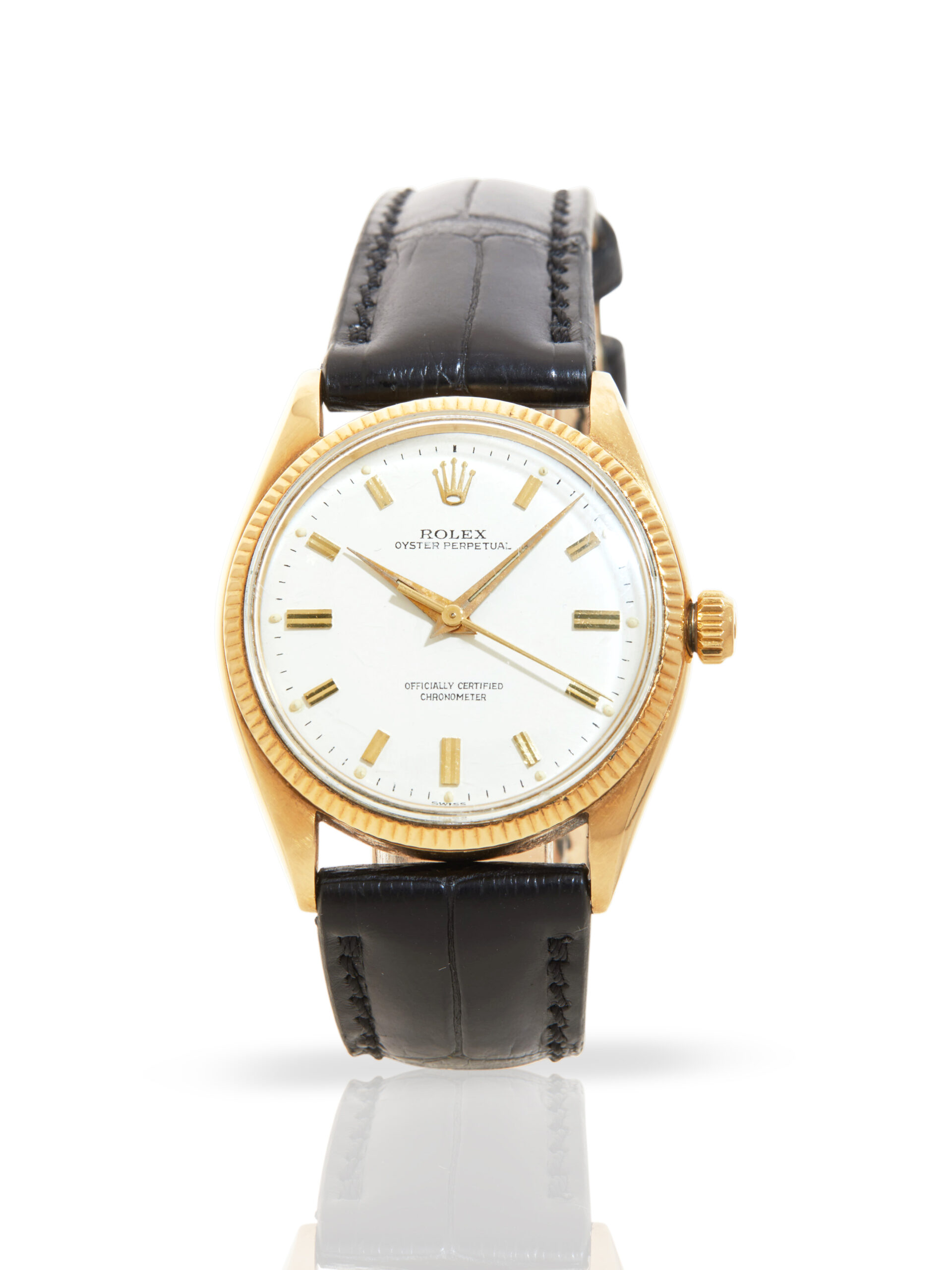 This elegant example of a 1955 Rolex Oyster Perpetual 34 6567 features a 34mm 14K yellow gold case, white baton dial, 14K yellow gold fluted bezel and is coupled to a brand new (after-market), black alligator strap with a pin buckle. Having been professionally tested for condition and accuracy, it’s deemed to be running well and is showing moderate signs of wear.