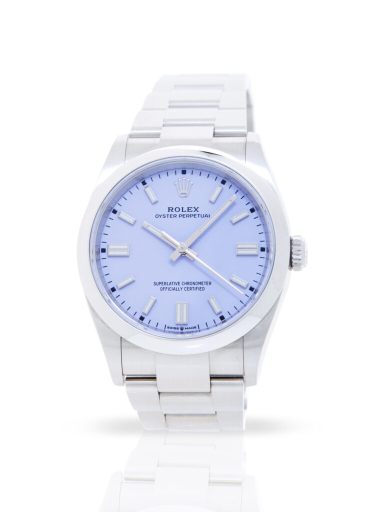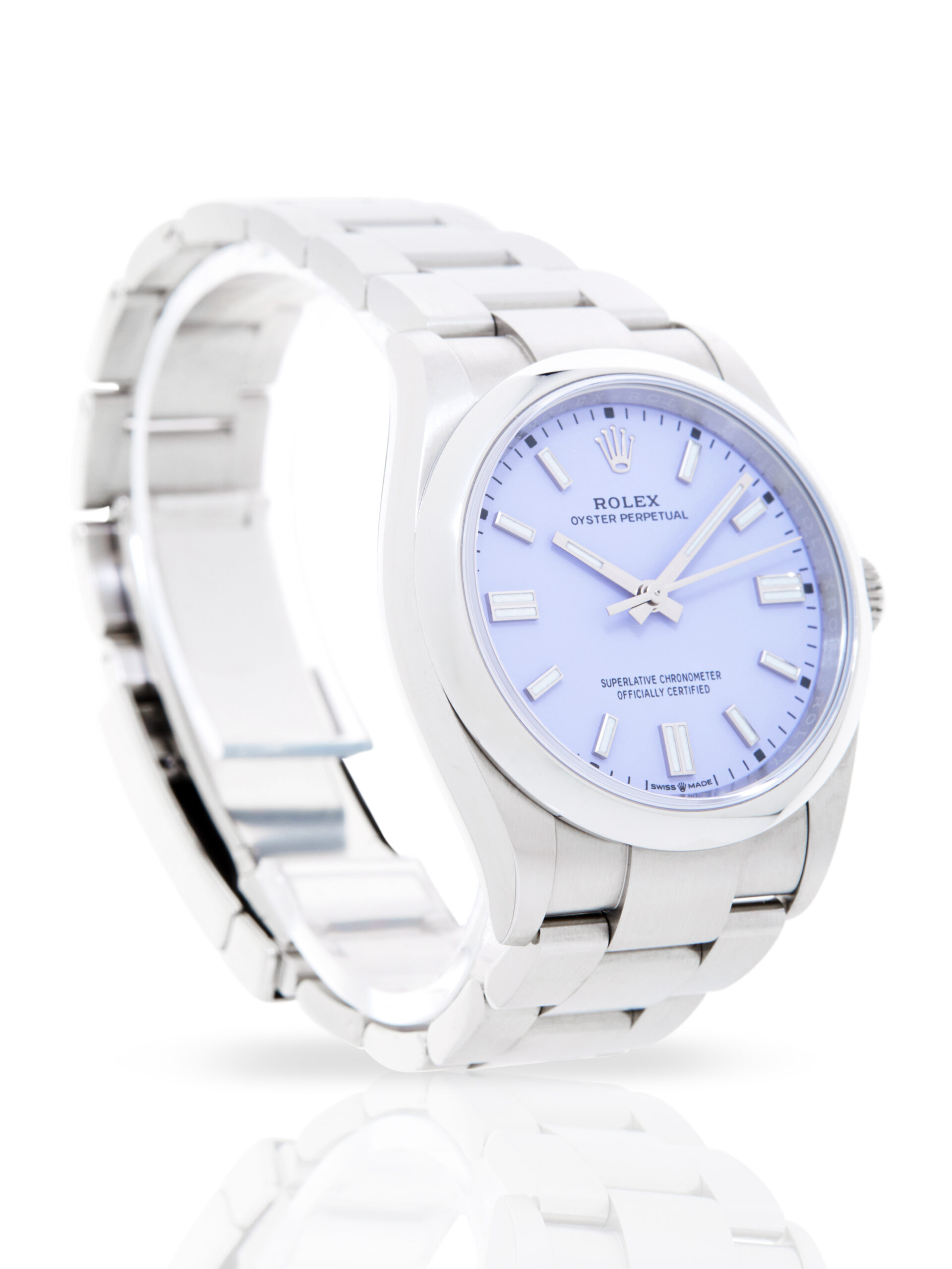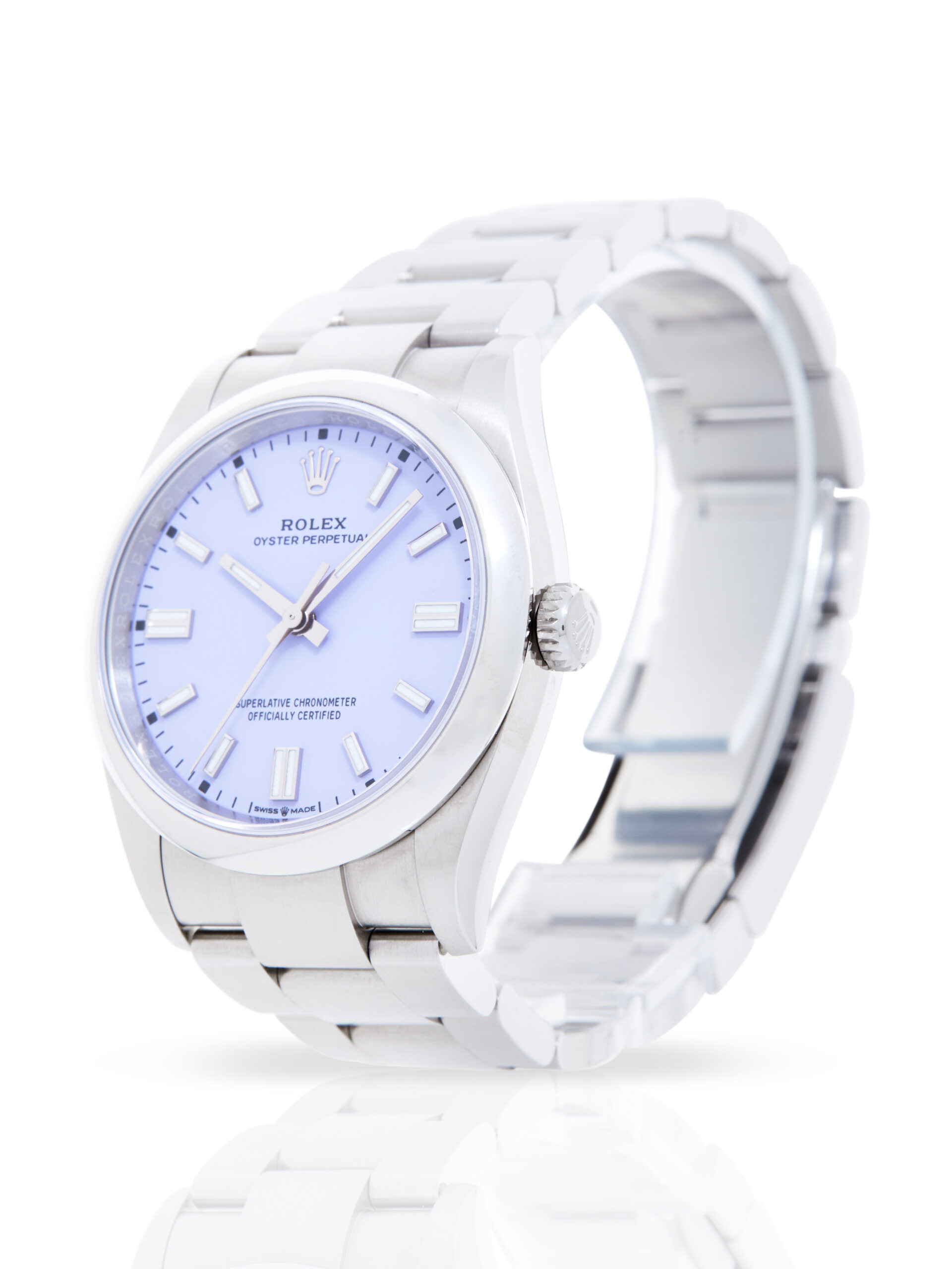 Presented in unworn condition is this beautiful example of a 2026 Rolex Oyster Perpetual 36 126000. The watch features a 36mm stainless steel case, purple ‘Lavender’ dial with luminescent hour markers, smooth stainless steel bezel and is coupled to a stainless steel Oyster bracelet. Having been professionally tested for condition and accuracy, it’s deemed to be running perfectly, ready for its new, lucky owner.