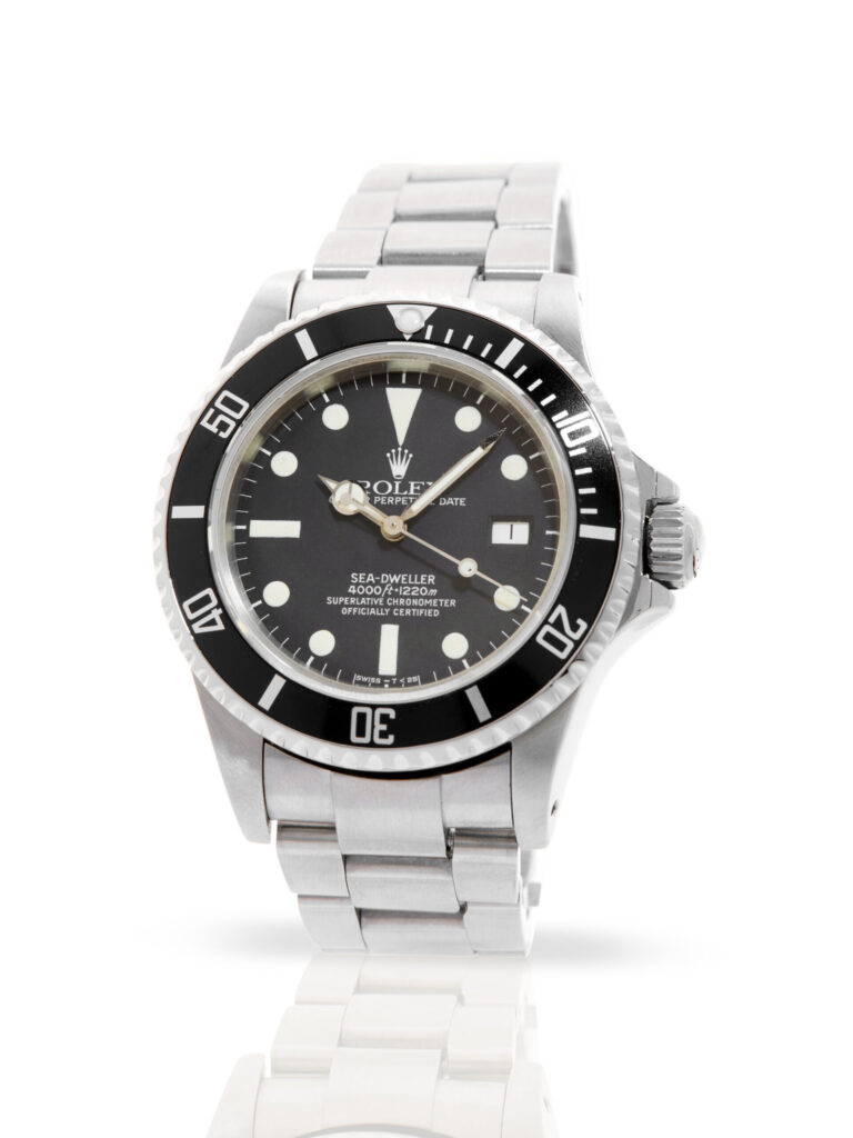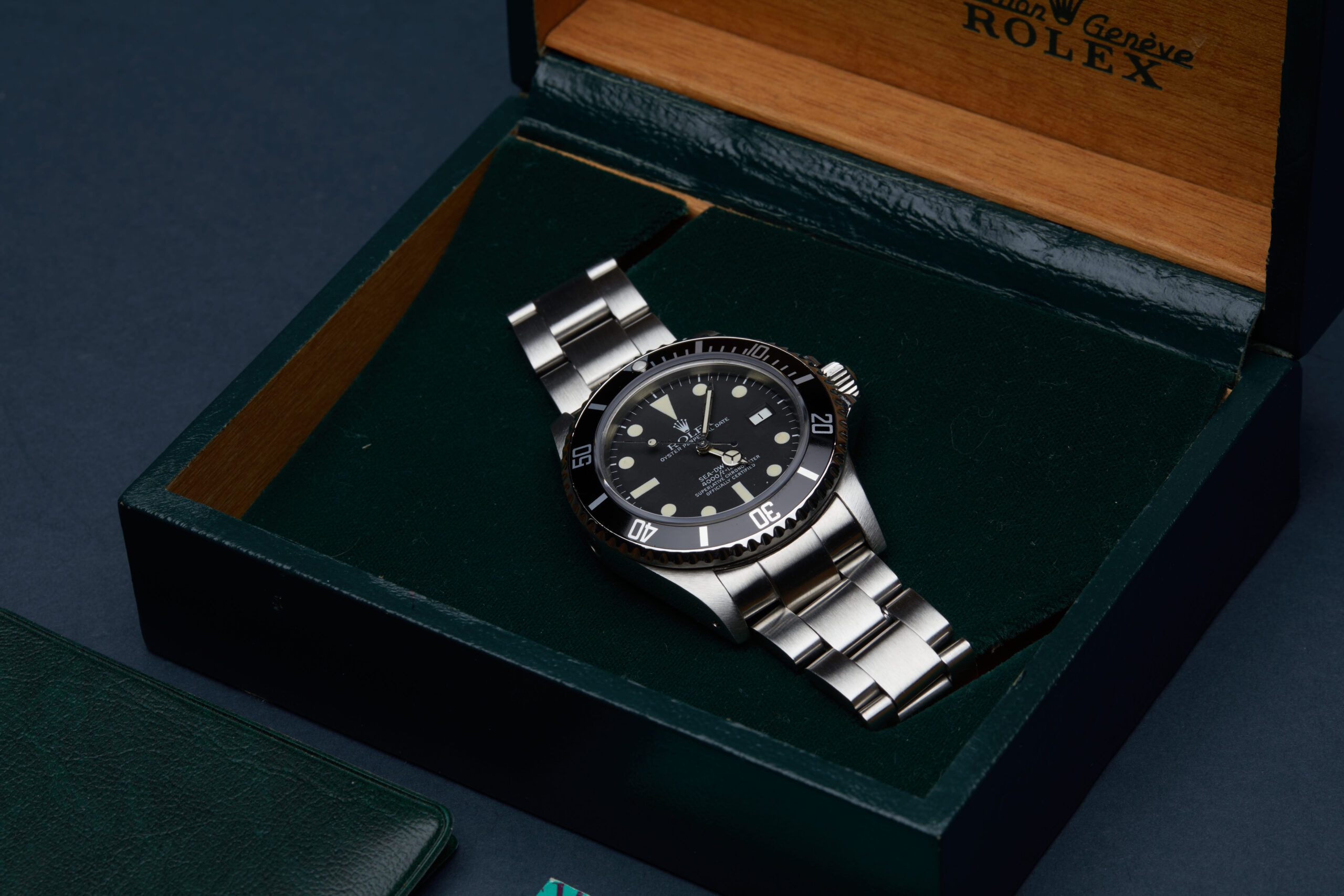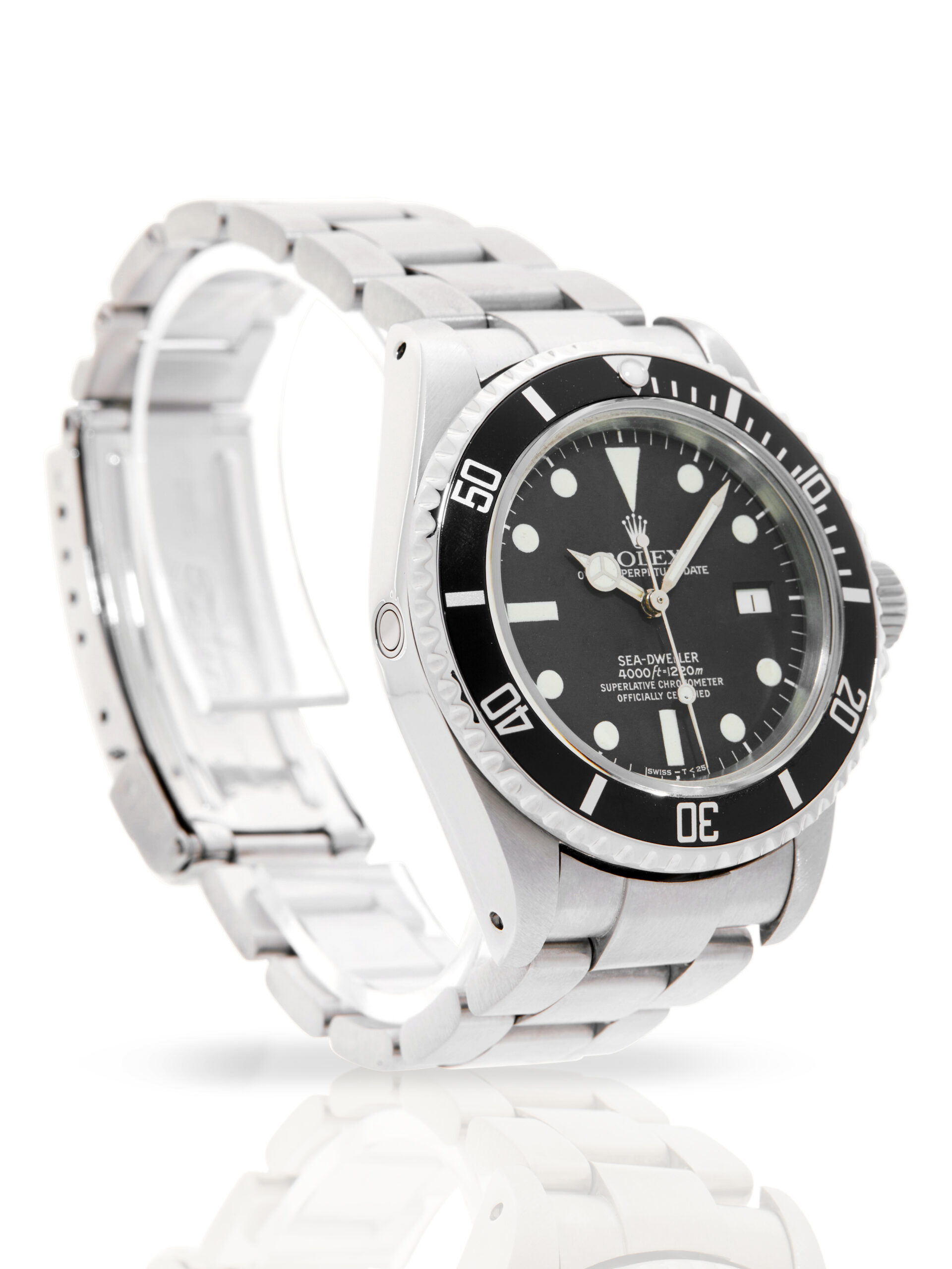 This stunning example of a 1983 Rolex Sea-Dweller 16660 ‘Triple Six’ features a 40mm stainless steel case, stainless steel bezel with black aluminium insert, matt black dial with nicely aged creamy hour markers, date display and is coupled to a stainless steel Oyster bracelet. Having been professionally tested for condition and accuracy, it’s deemed to be running well and is showing minor signs of wear.