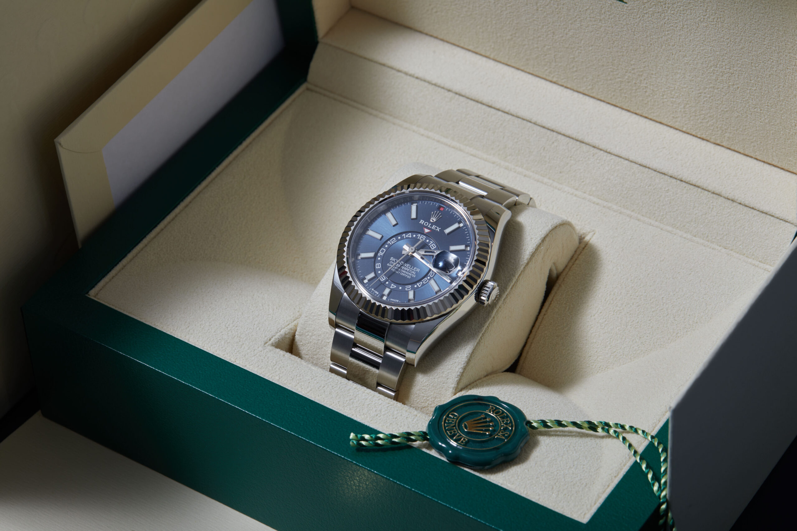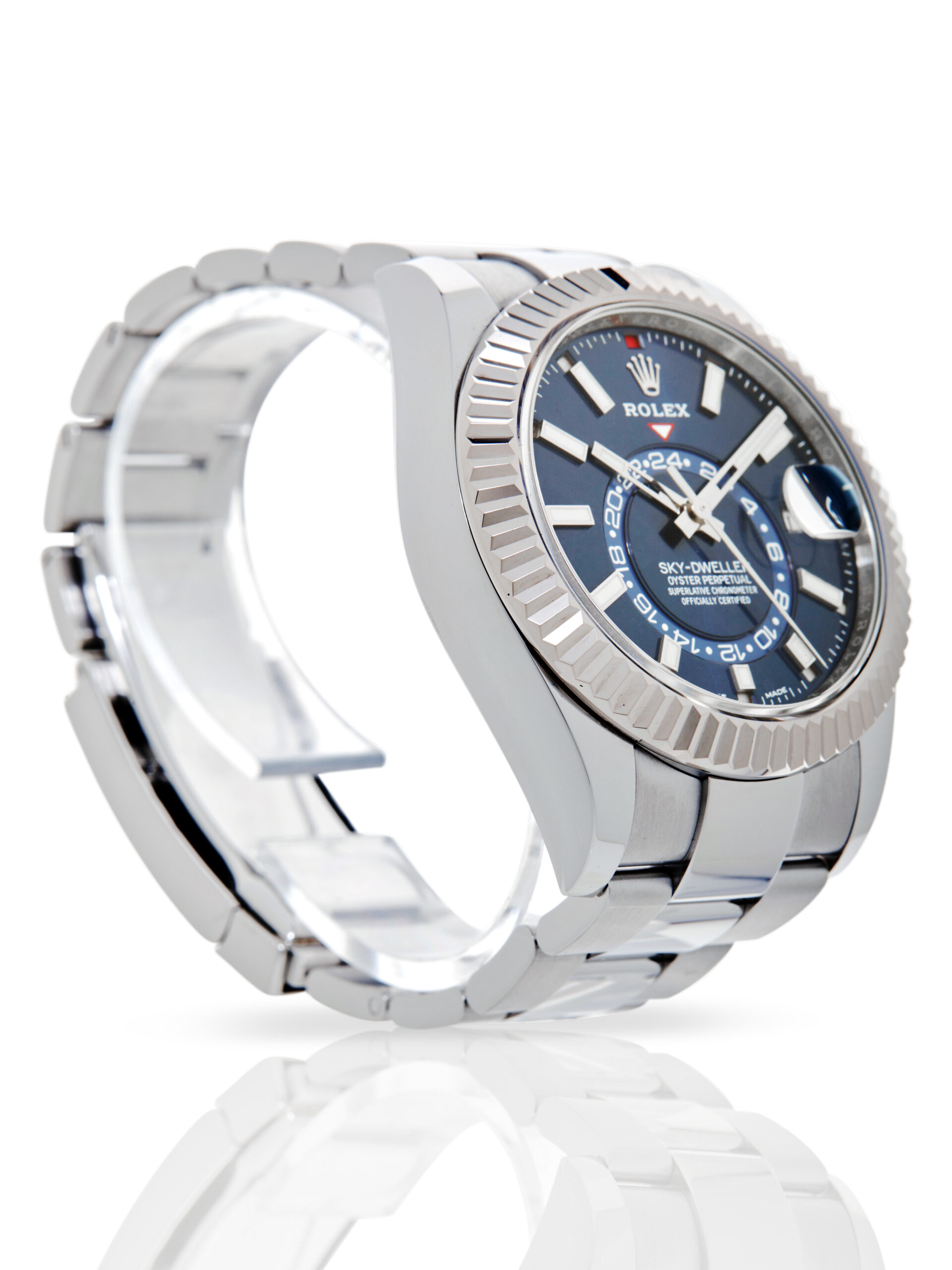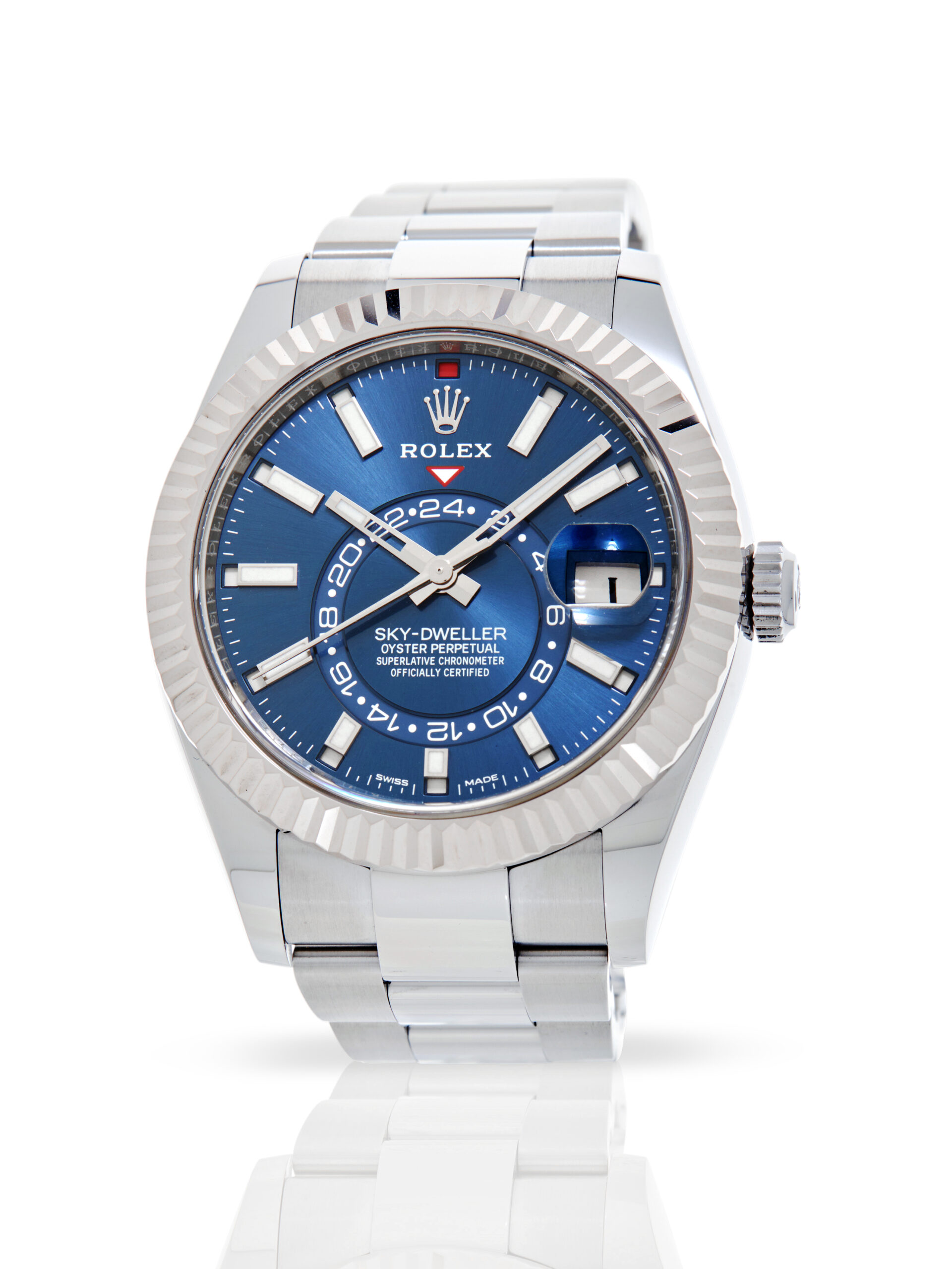 Presented in excellent condition is this striking example of a 2021 Rolex Sky-Dweller 326934. The watch features a 42mm stainless steel case, 18K white gold fluted bezel, blue dial with luminescent hour markers, GMT function, month & date complications and is coupled to a stainless steel Oyster bracelet. Having been professionally tested for condition and accuracy, it’s deemed to be running perfectly and is showing barely any signs of wear.