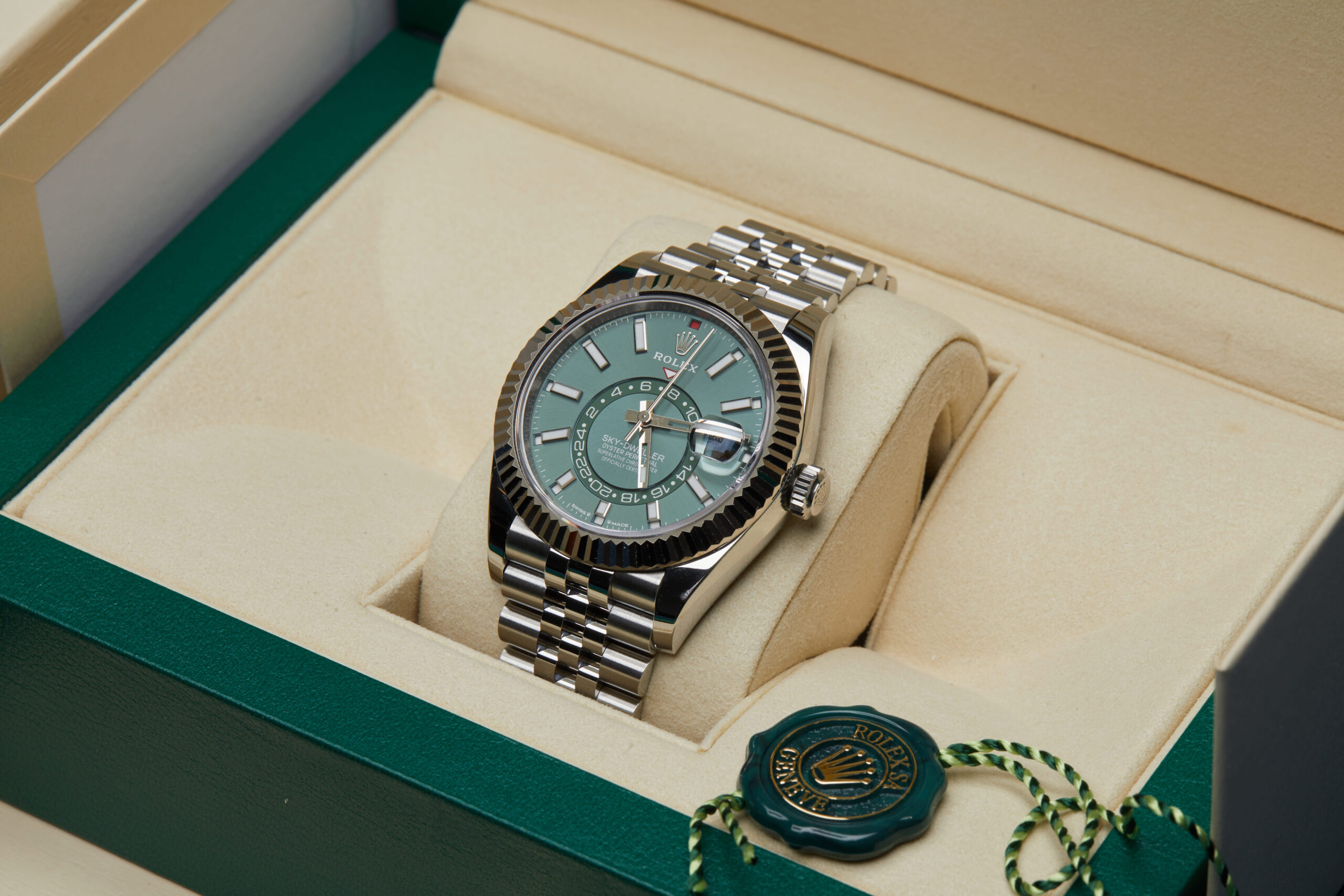 Presented in excellent condition is this stunning example of a 2024 Rolex Sky-Dweller 336934. The watch features a 42mm stainless steel case, green dial with luminescent hour markers, 18K white gold fluted bezel and is coupled to a stainless steel Jubilee bracelet. Having been professionally tested for condition and accuracy, it’s deemed to be running perfectly and is showing barely any signs of wear.