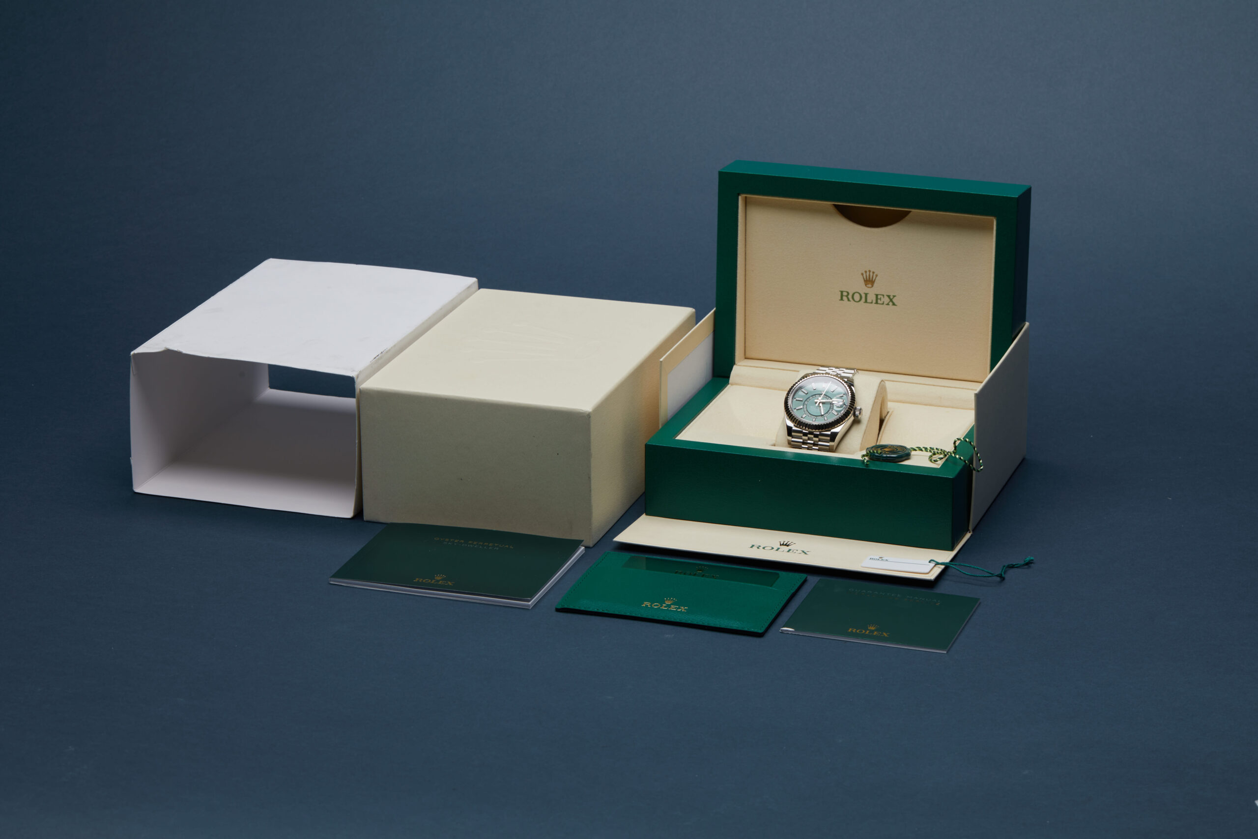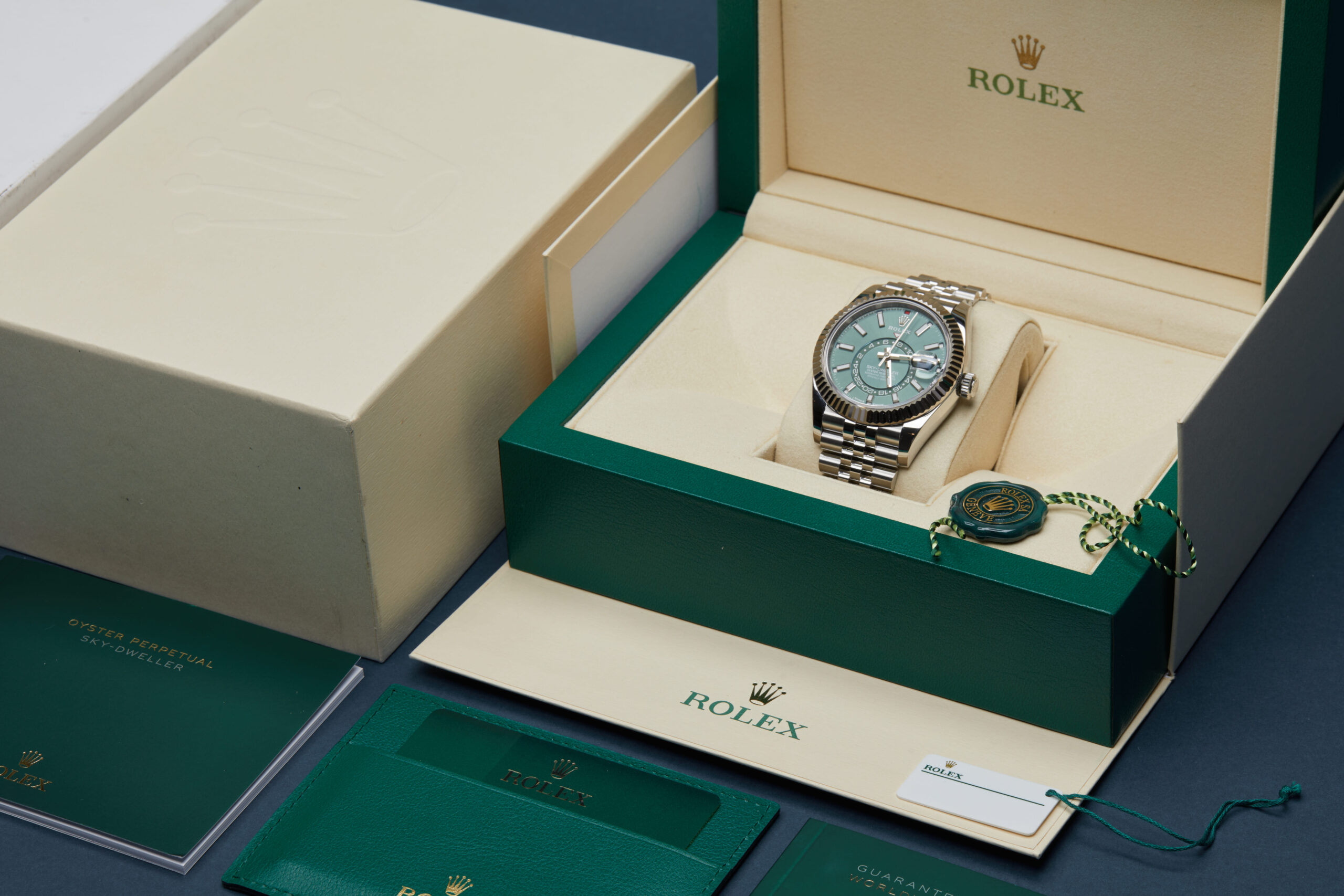 The watch is supplied with its original Rolex box, green leather wallet, manuals, 2x swing tags and warranty card dated Q3 2024.