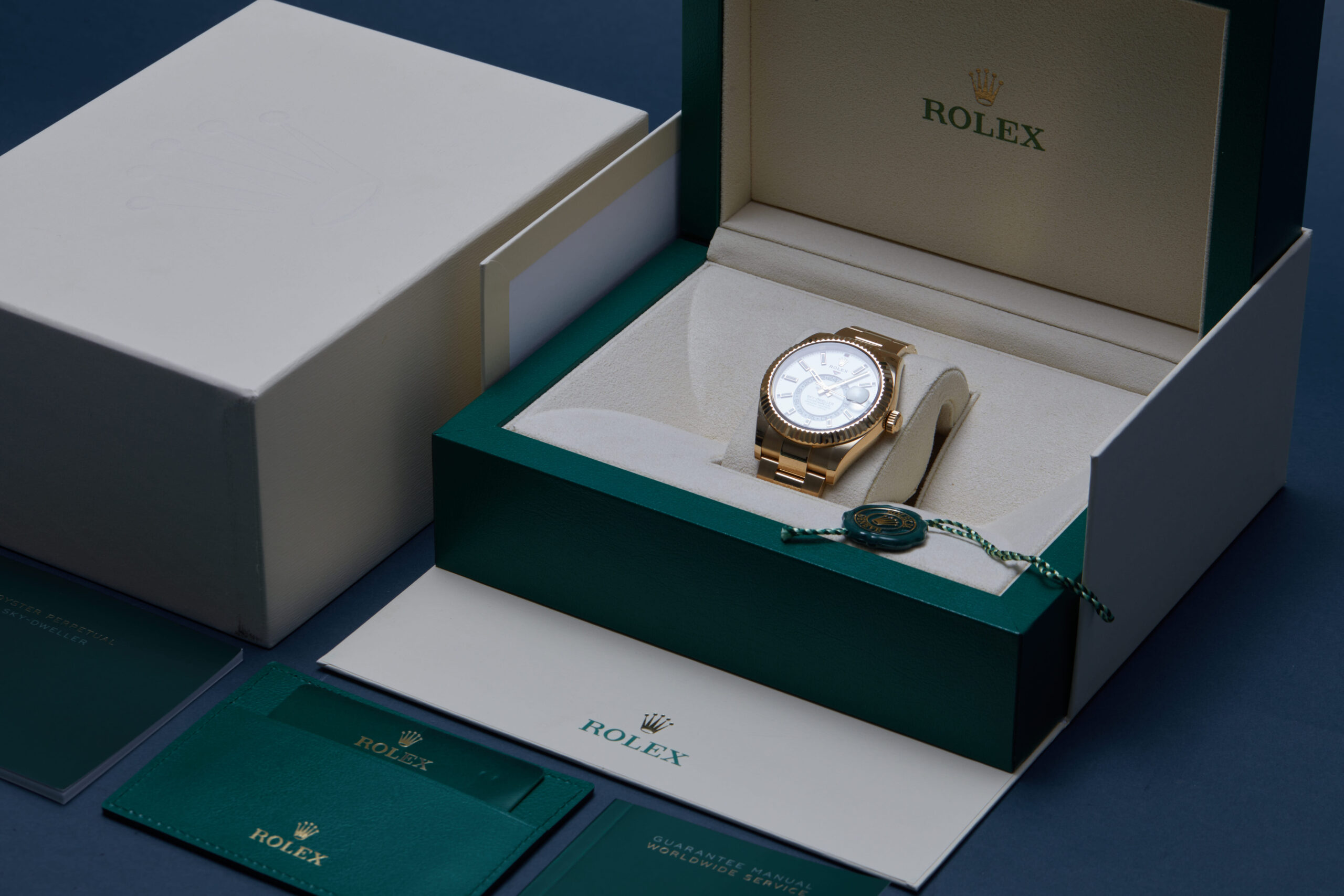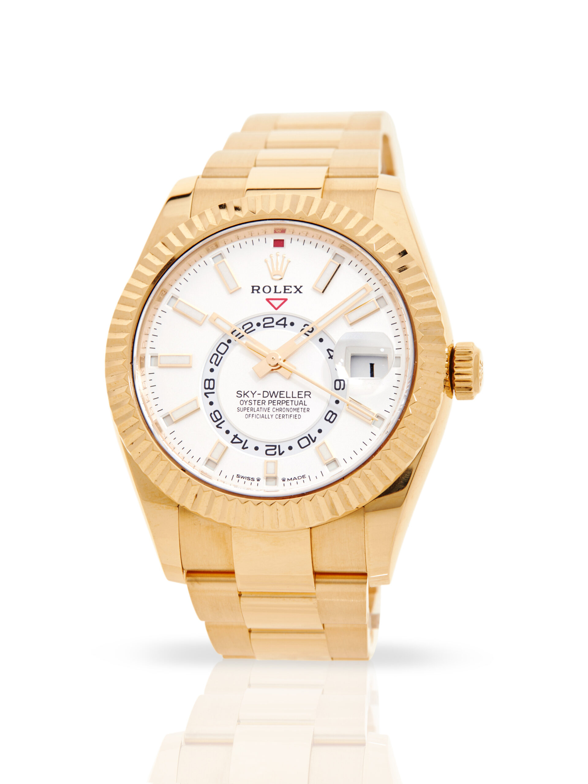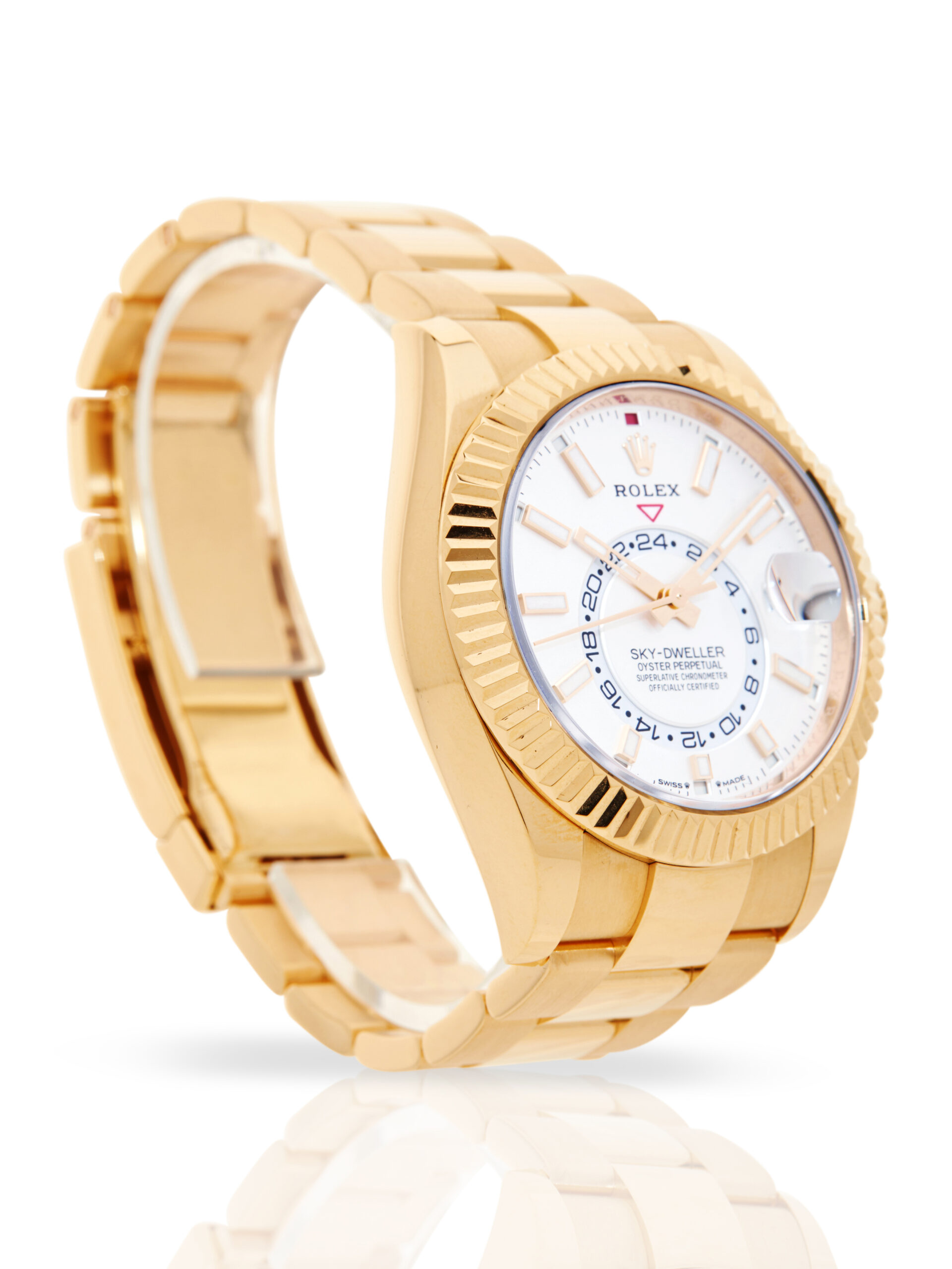 Presented in excellent condition is this beautiful example of a 2023 Rolex Sky-Dweller 336938. The watch features a 42mm 18K yellow gold case, white dial with white luminescent hour markers, GMT function, month & date complications and is coupled to an 18K yellow gold Oyster bracelet. Having been professionally tested for condition and accuracy, it’s deemed to be running perfectly and is showing barely any signs of wear.