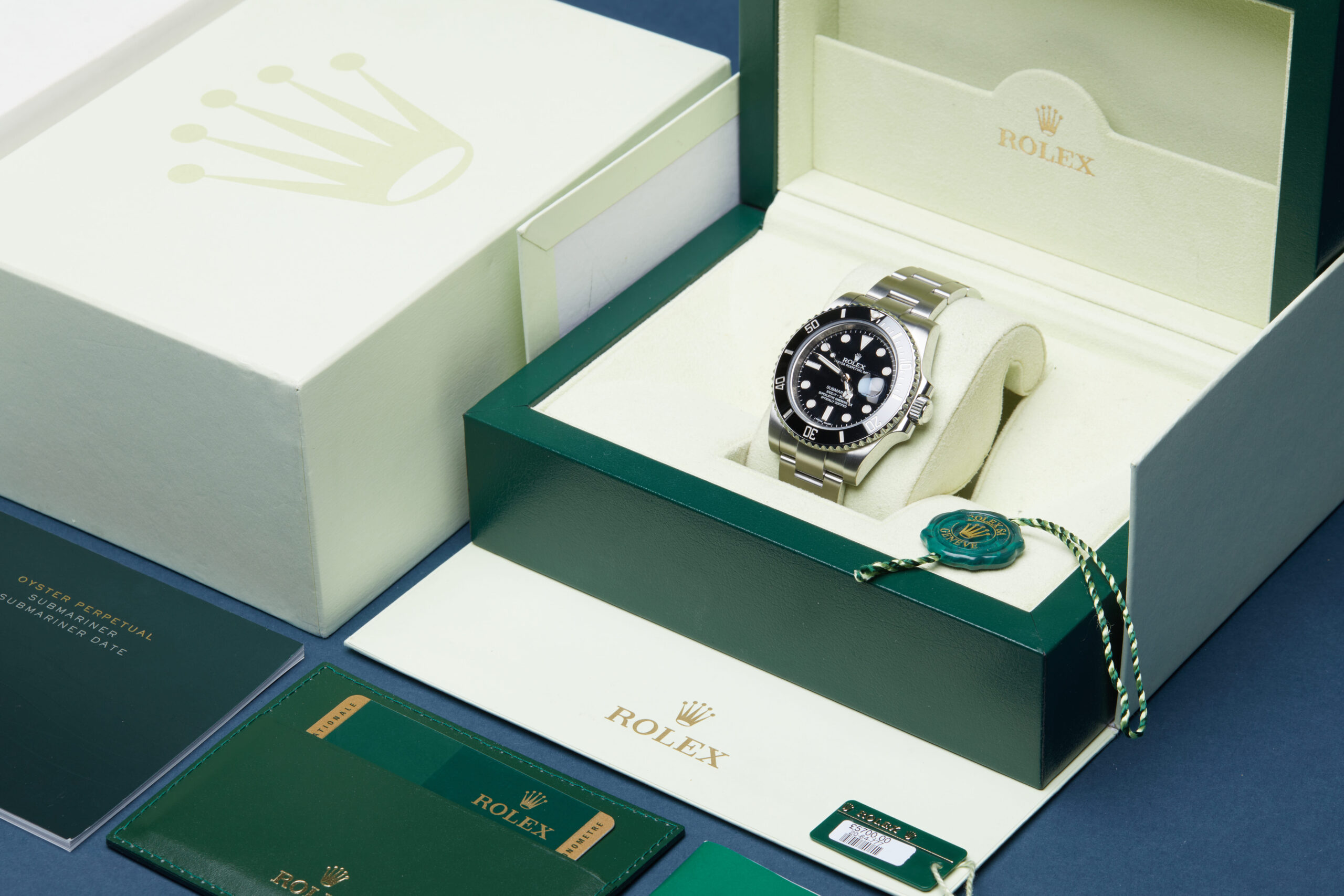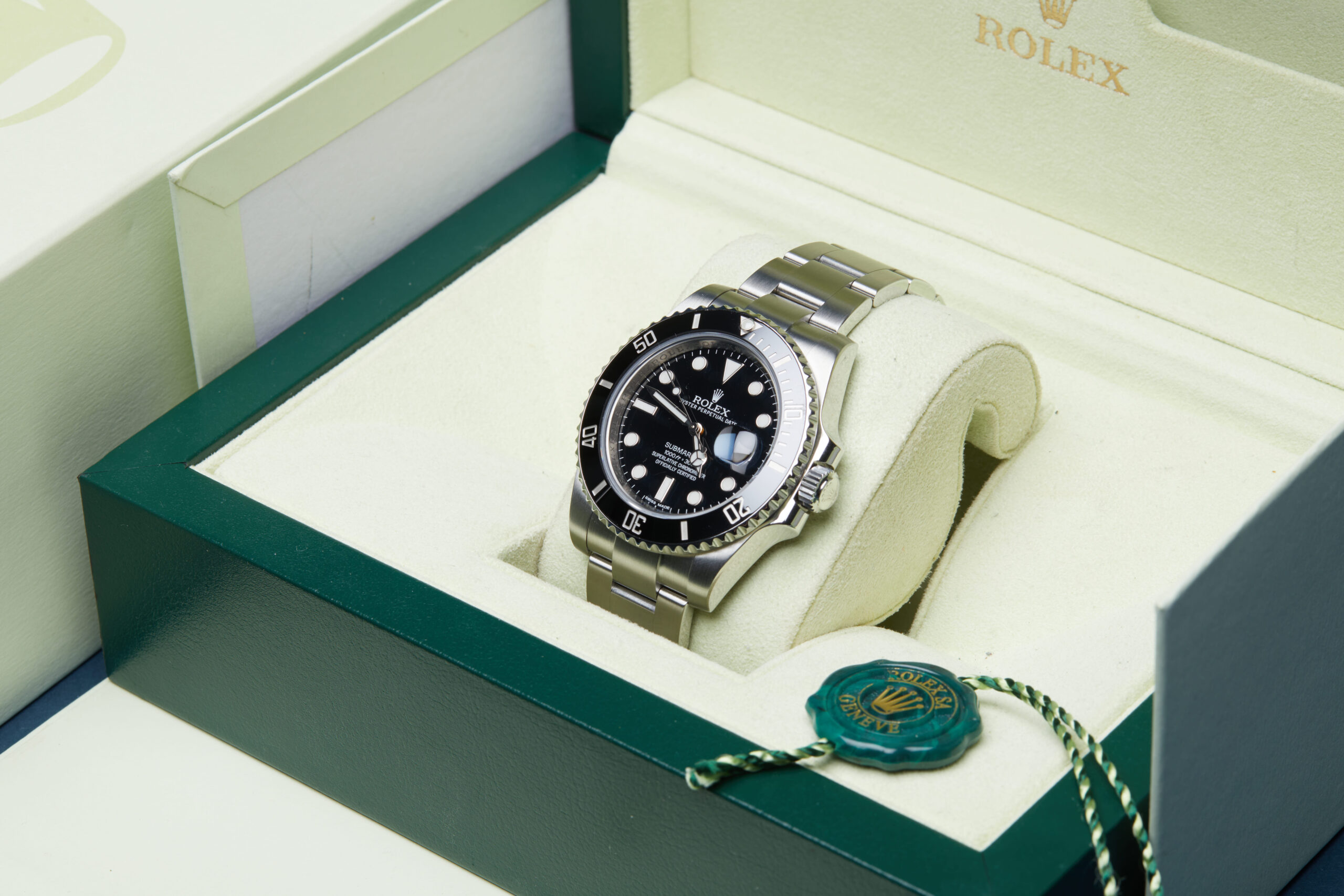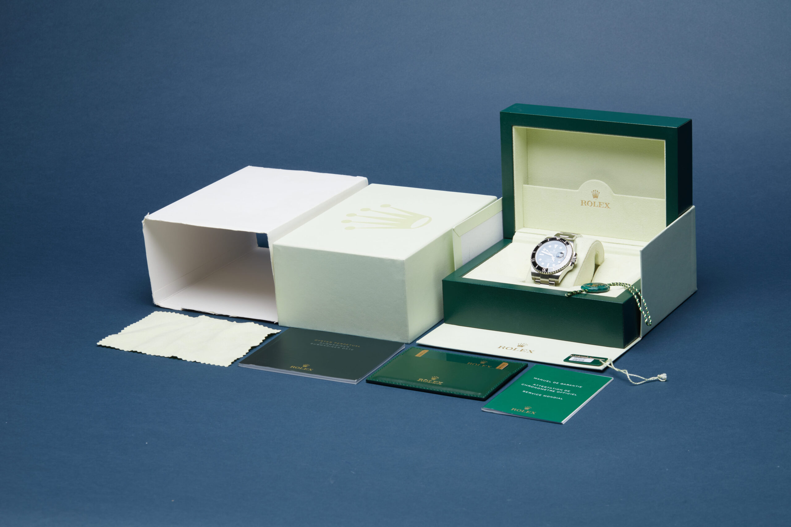The watch is supplied with its original Rolex box, green leather wallet, manuals, 2x swing tags, polishing cloth and warranty card dated Q2 2014 (UK supplied).