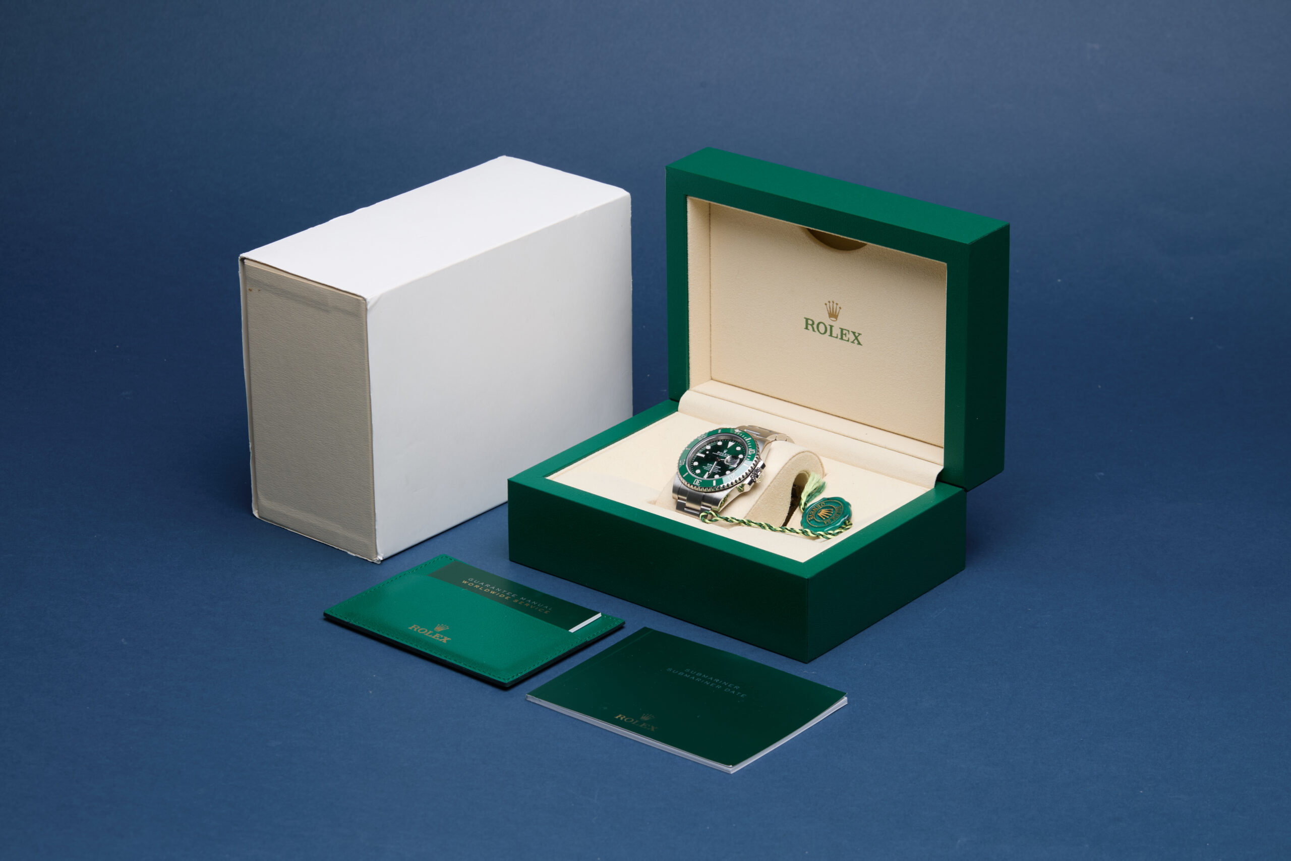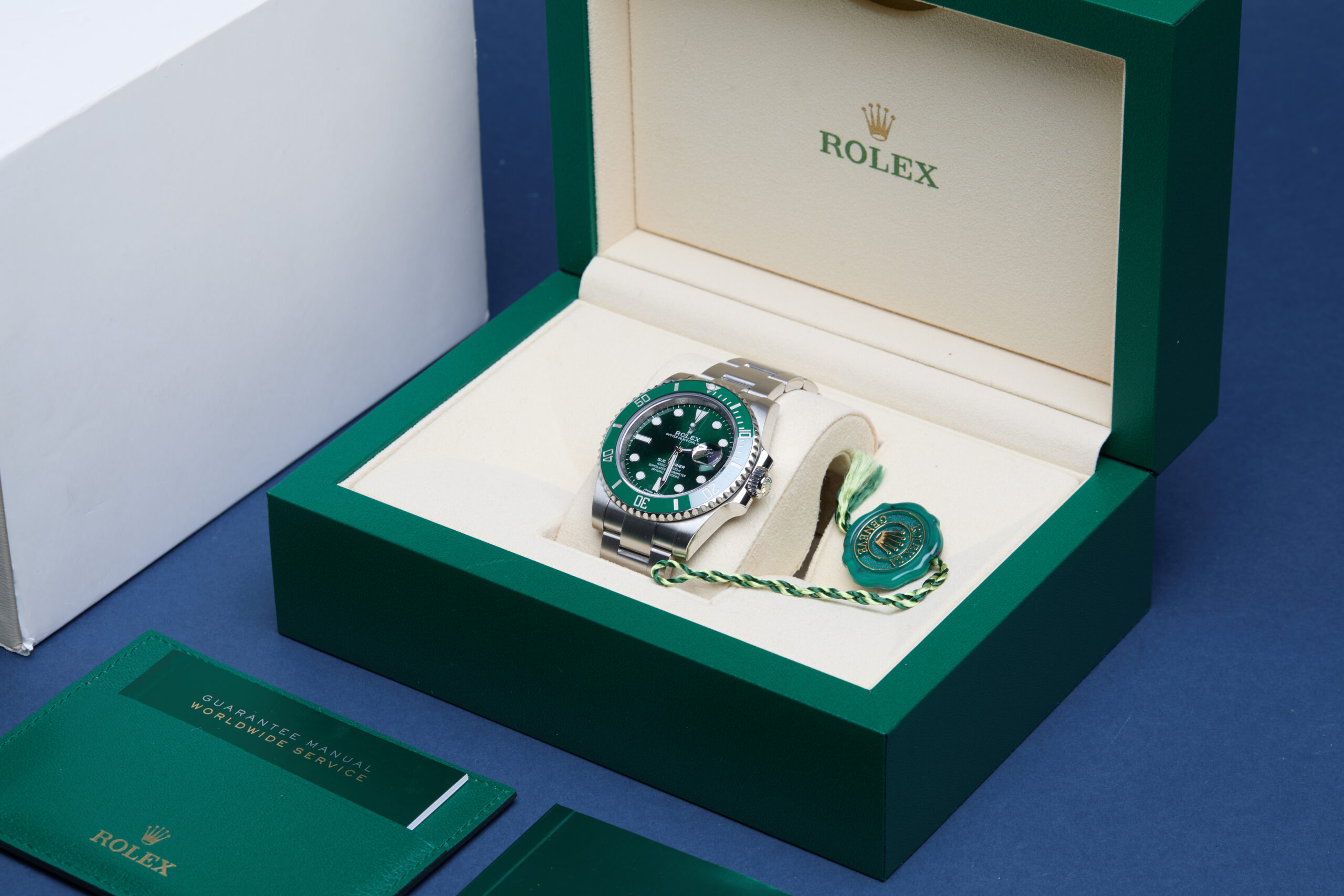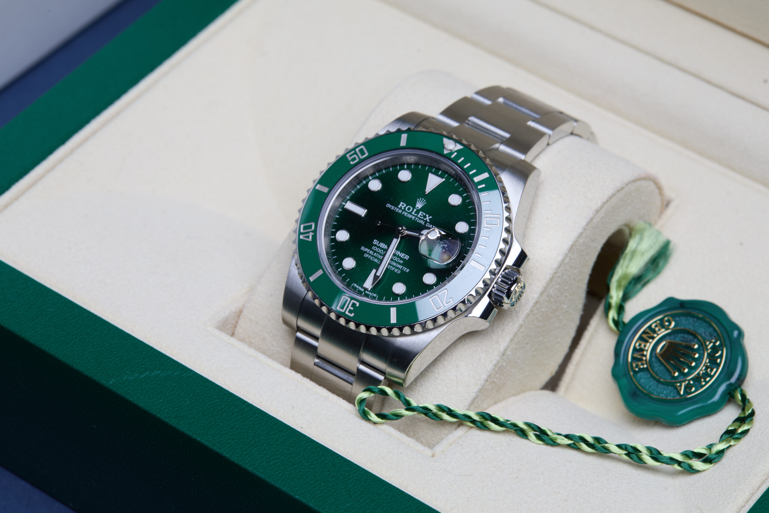 The watch is supplied with its original Rolex box, green leather wallet, green swing tag, manuals and warranty card dated Q3 2016 (UK supplied).