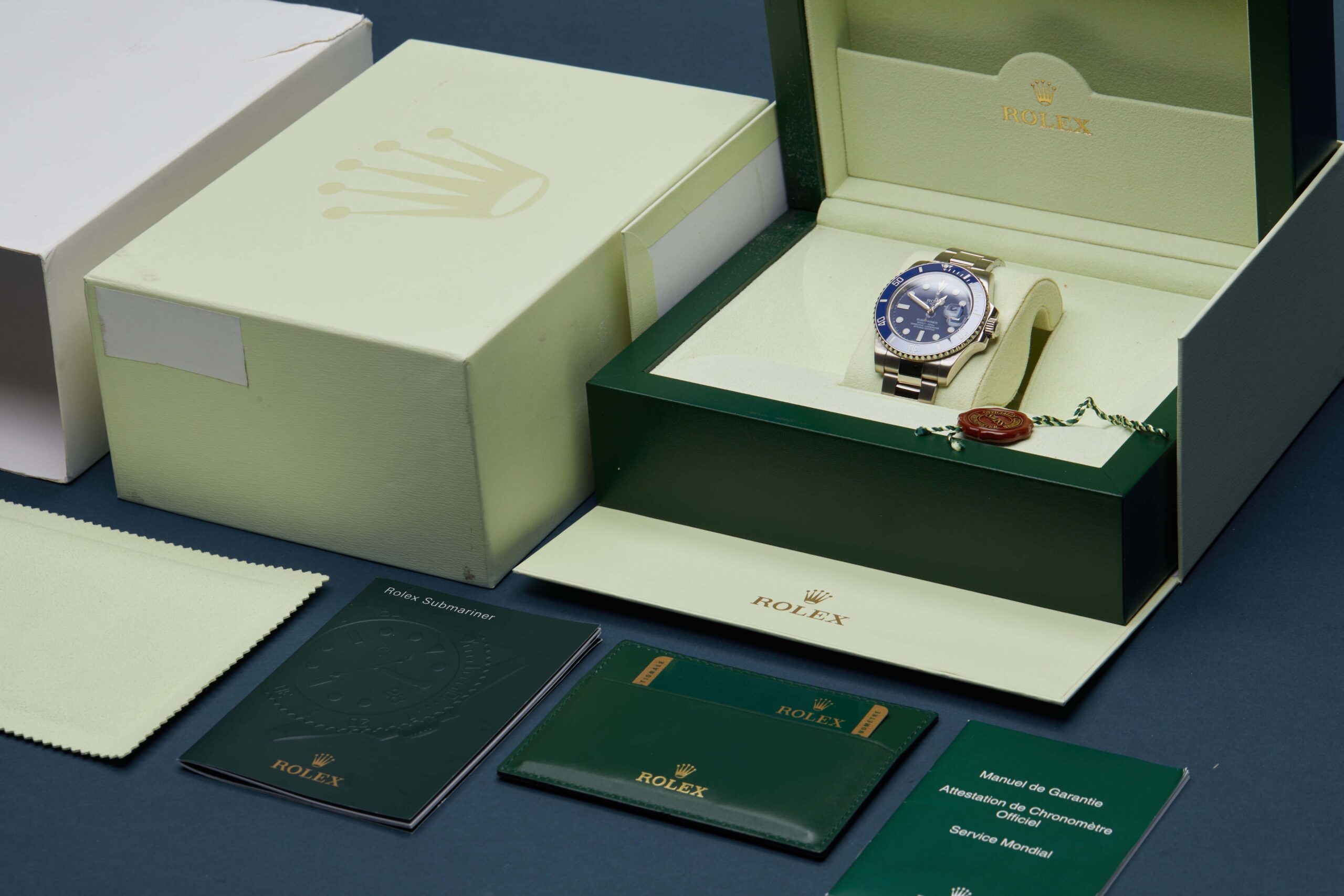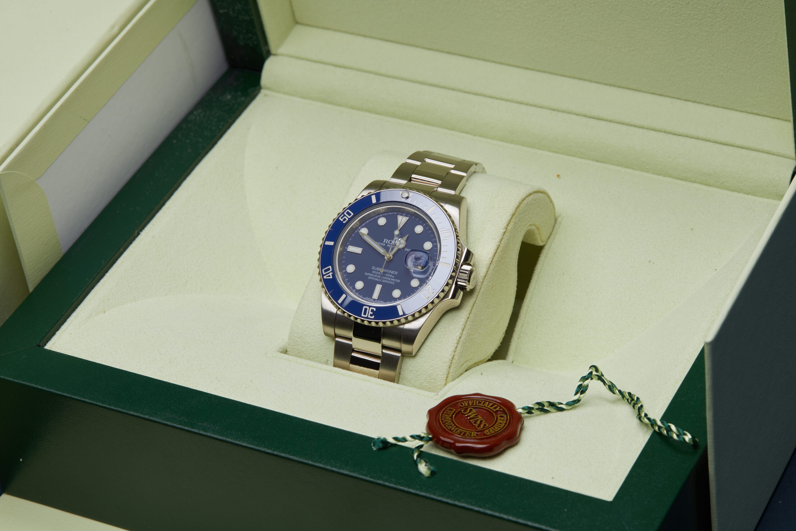 Presented in fantastic condition is this great example of a 2009 Rolex Submariner Date 116619LB ‘Smurf’. The watch features a 40mm 18K white gold case, blue dial with luminescent hour markers, 18K white gold case with blue ceramic insert and is coupled to an 18K white gold Oyster bracelet. Having been professionally tested for condition and accuracy, it’s deemed to be running very well and is showing minor signs of wear.