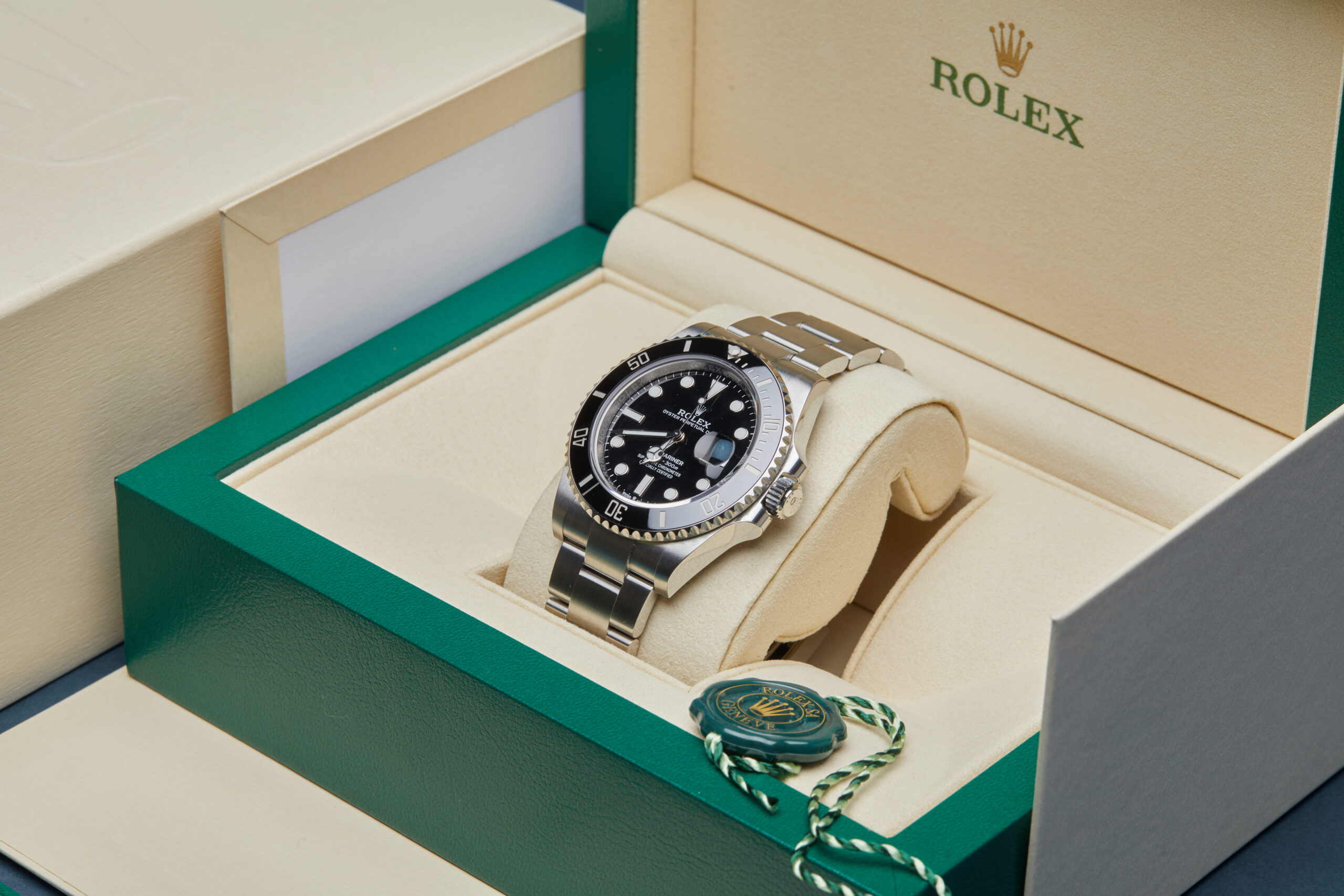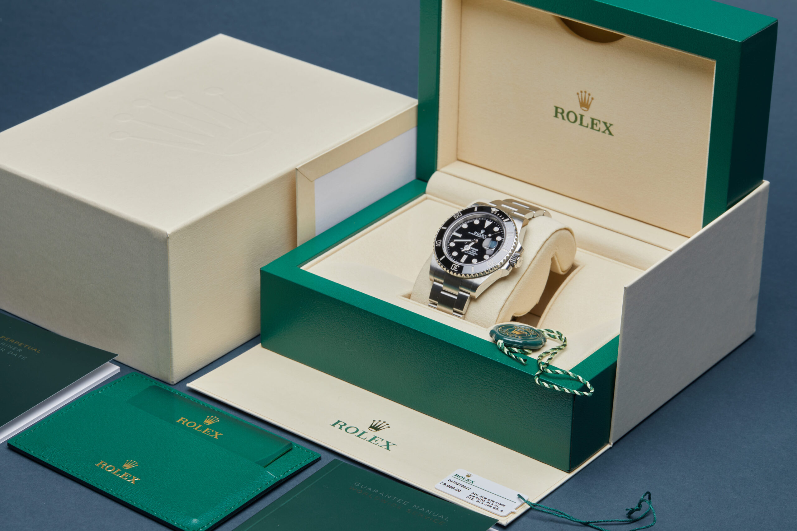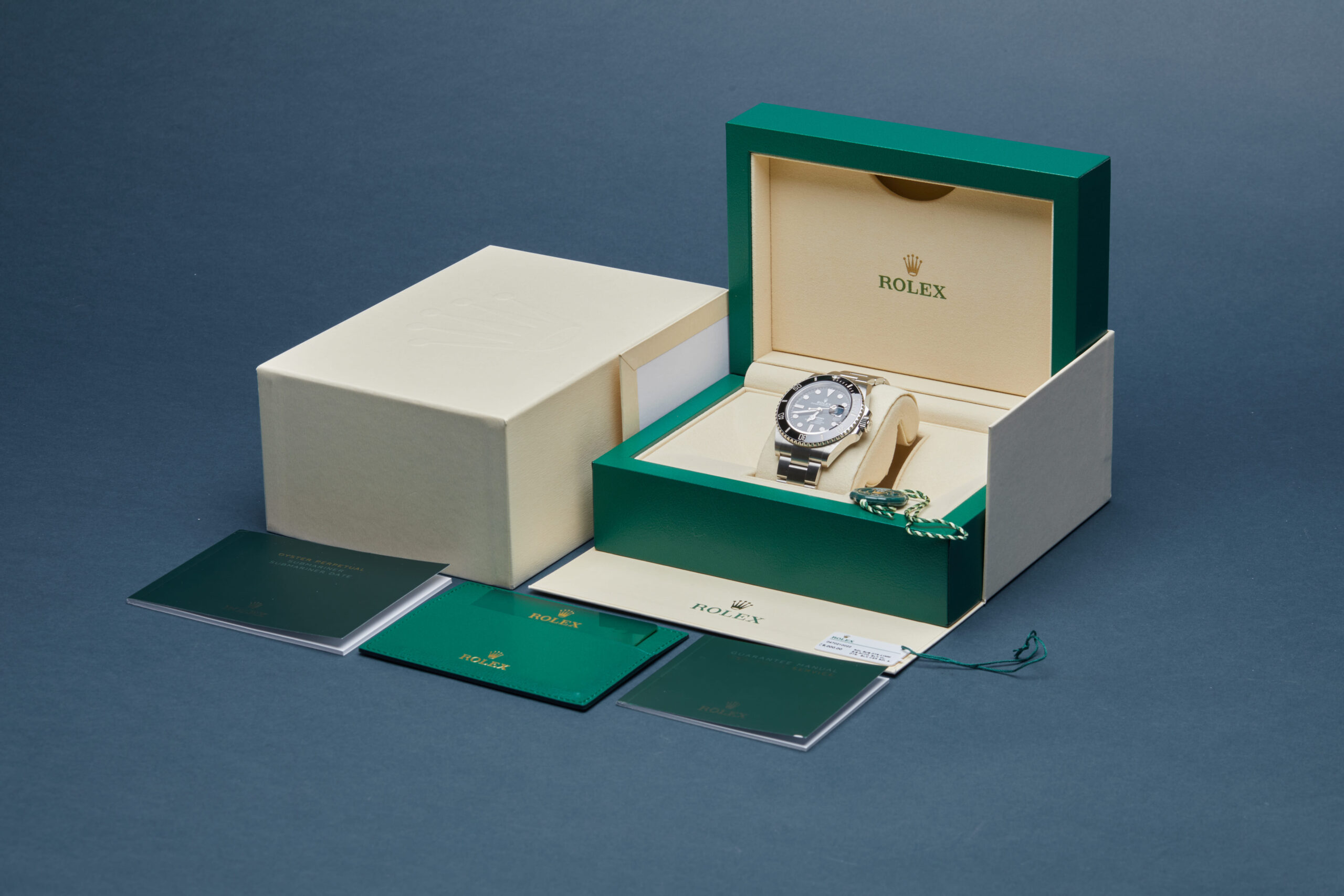 The watch is supplied with its original Rolex box, green leather wallet, manuals, 2x swing tags and warranty card dated Q4 2024.