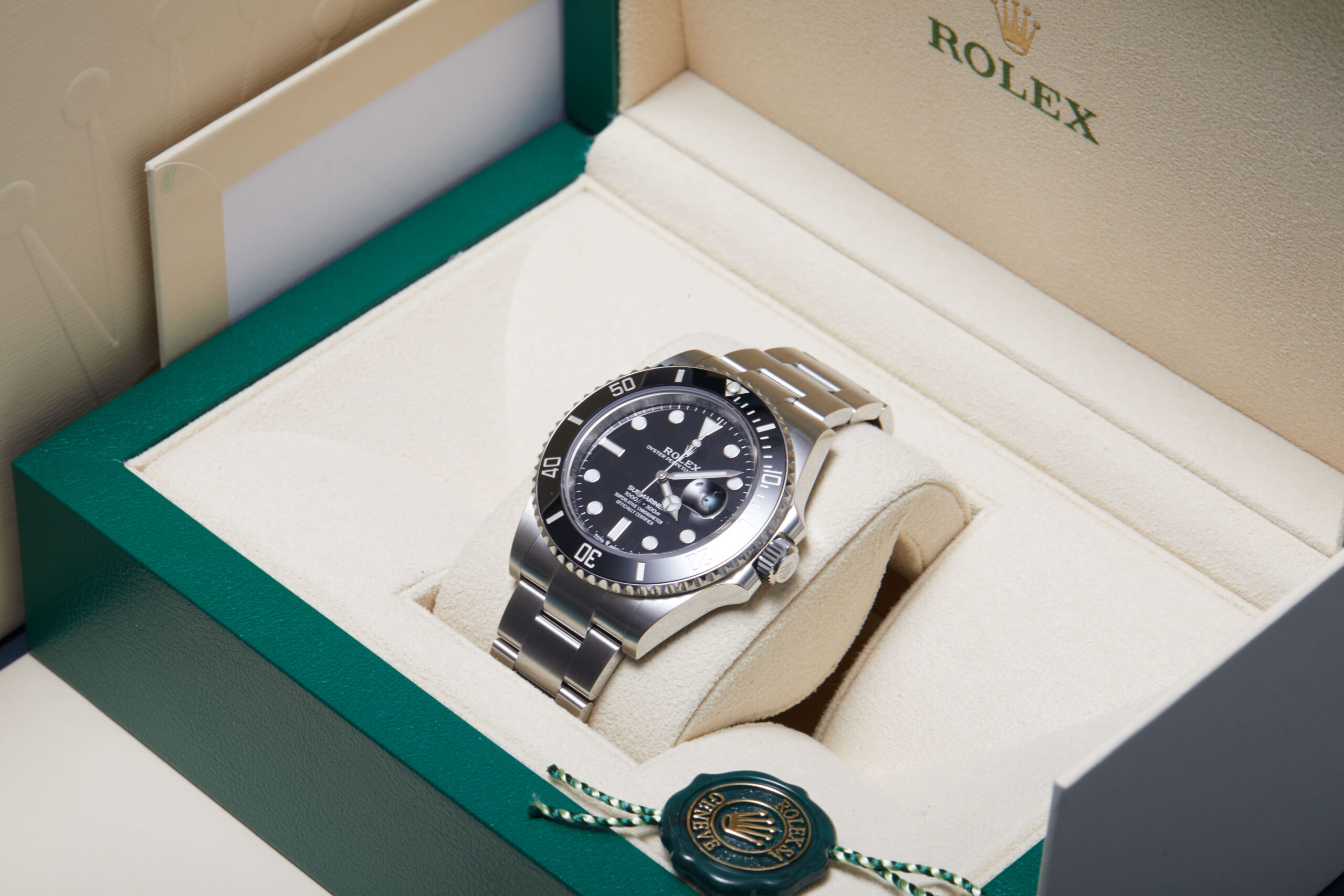 The watch is supplied with its original Rolex box, green leather wallet, manuals, 2x swing tags and warranty card dated Q2 2021.