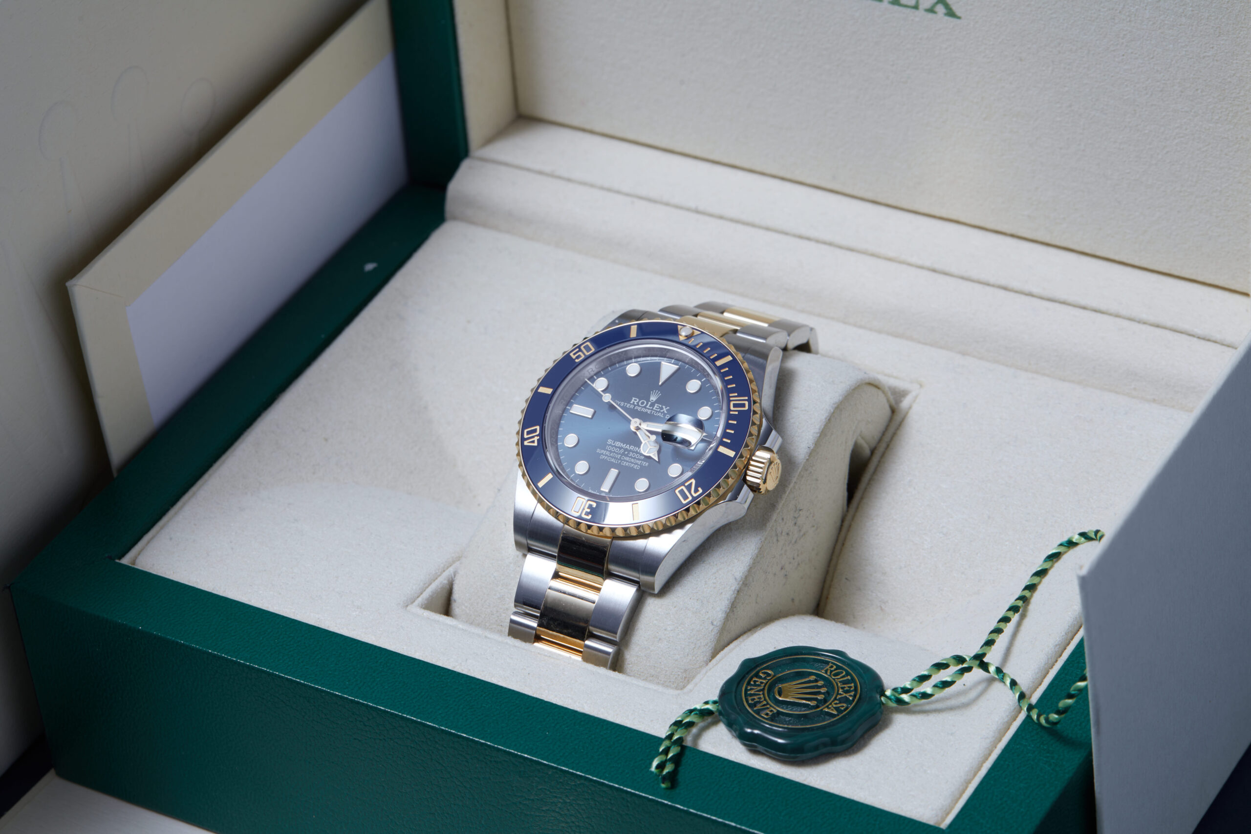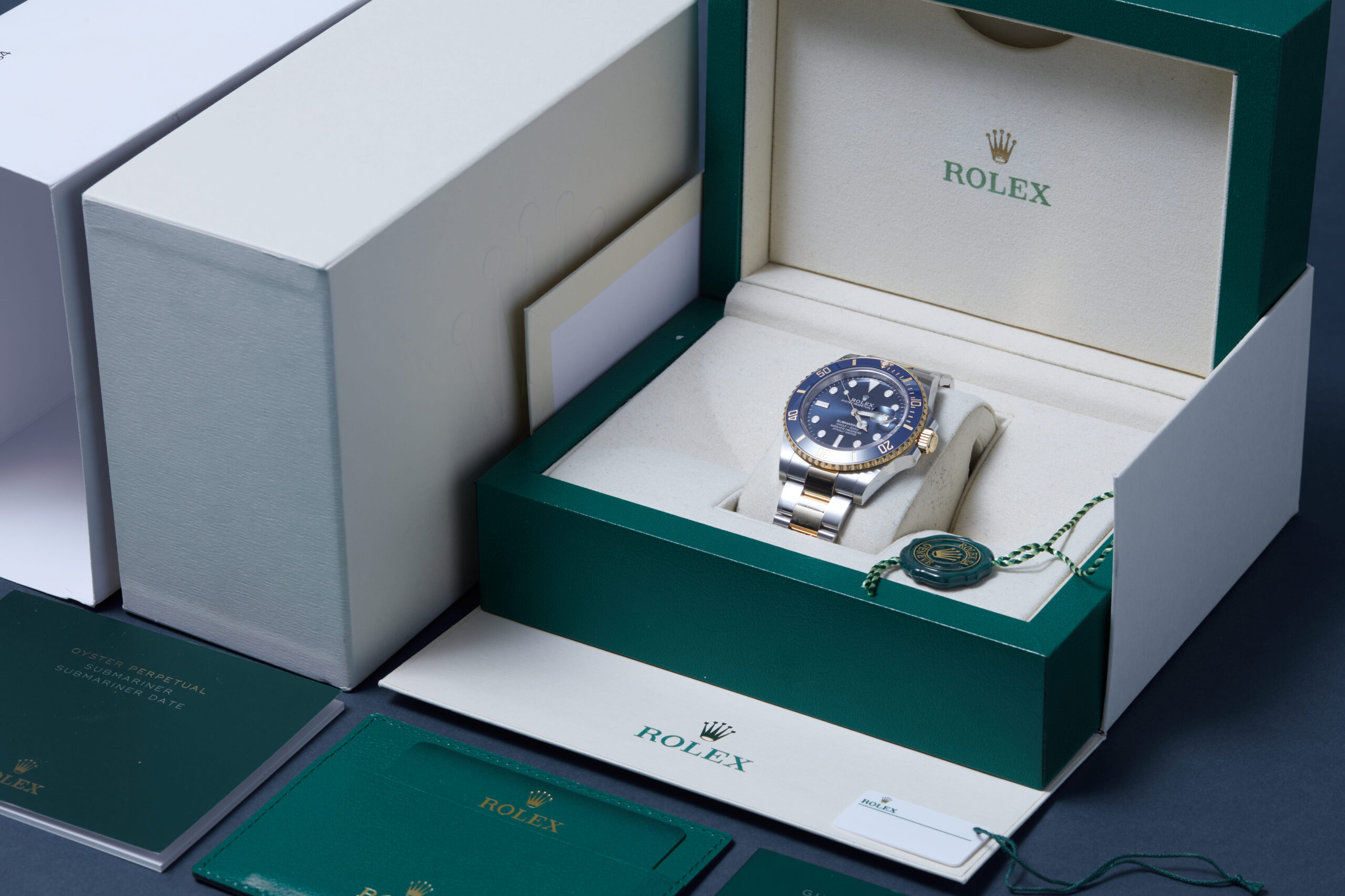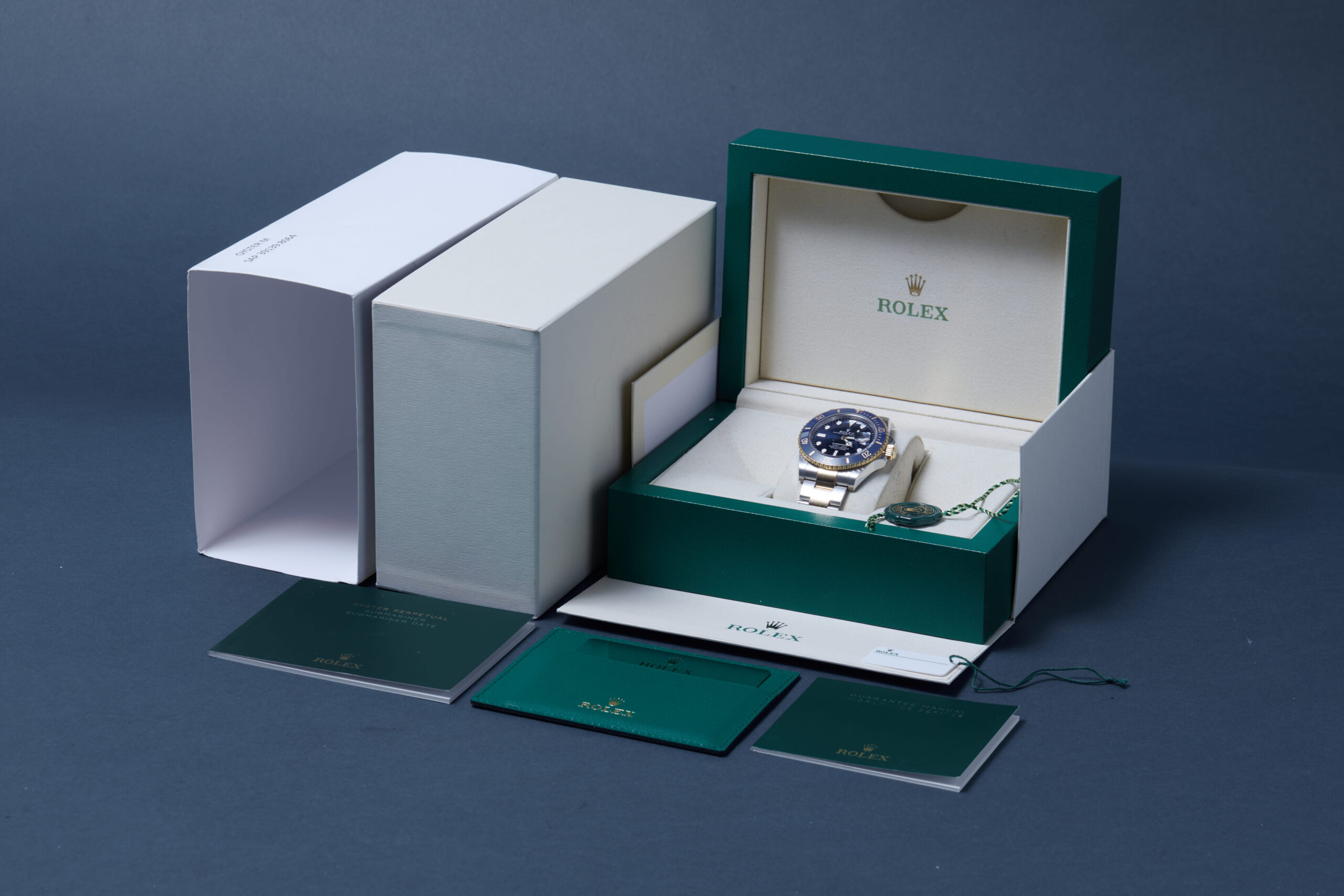 The watch is supplied with its original Rolex box, green leather wallet, manuals, 2x swing tags and warranty card dated Q3 2024.
