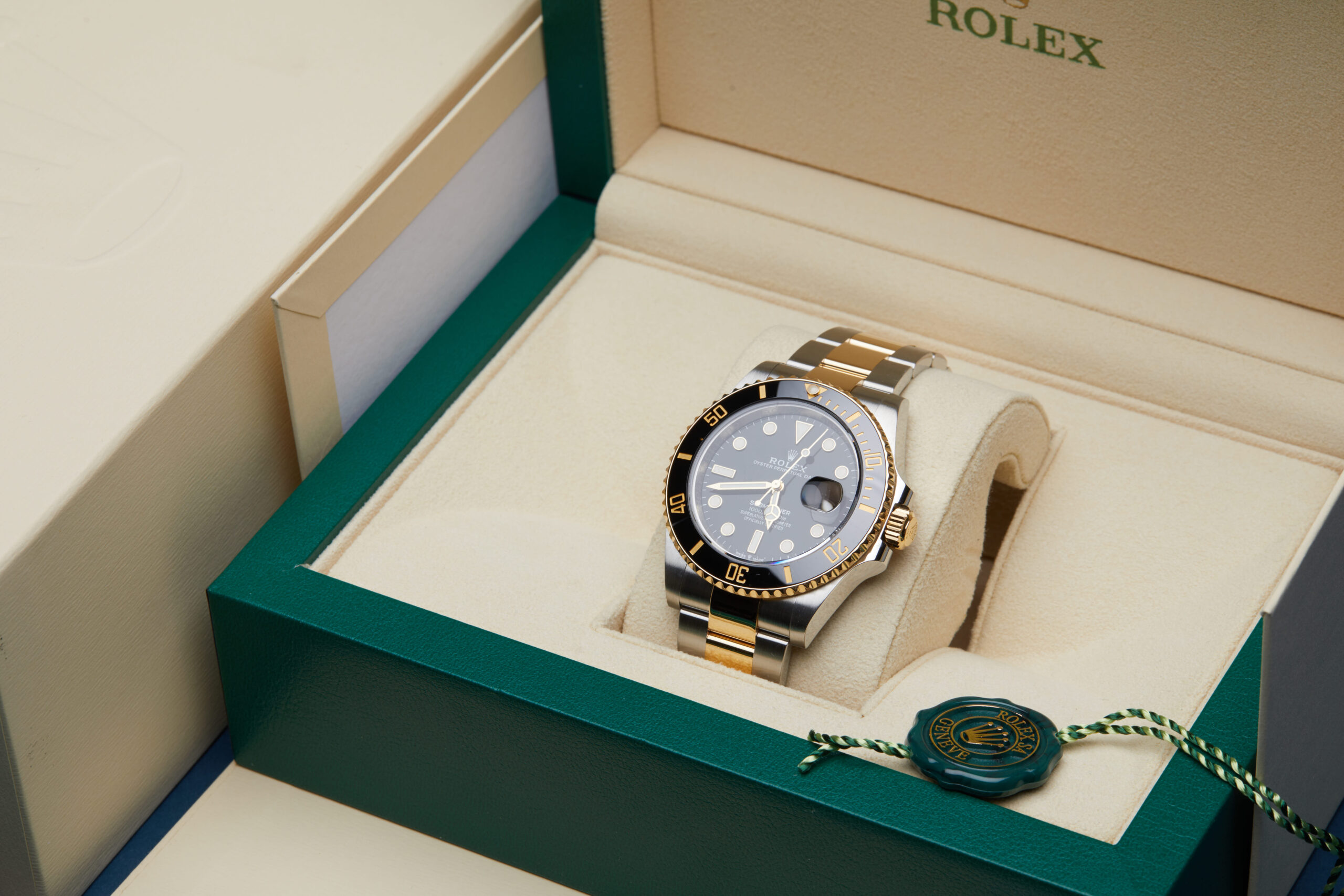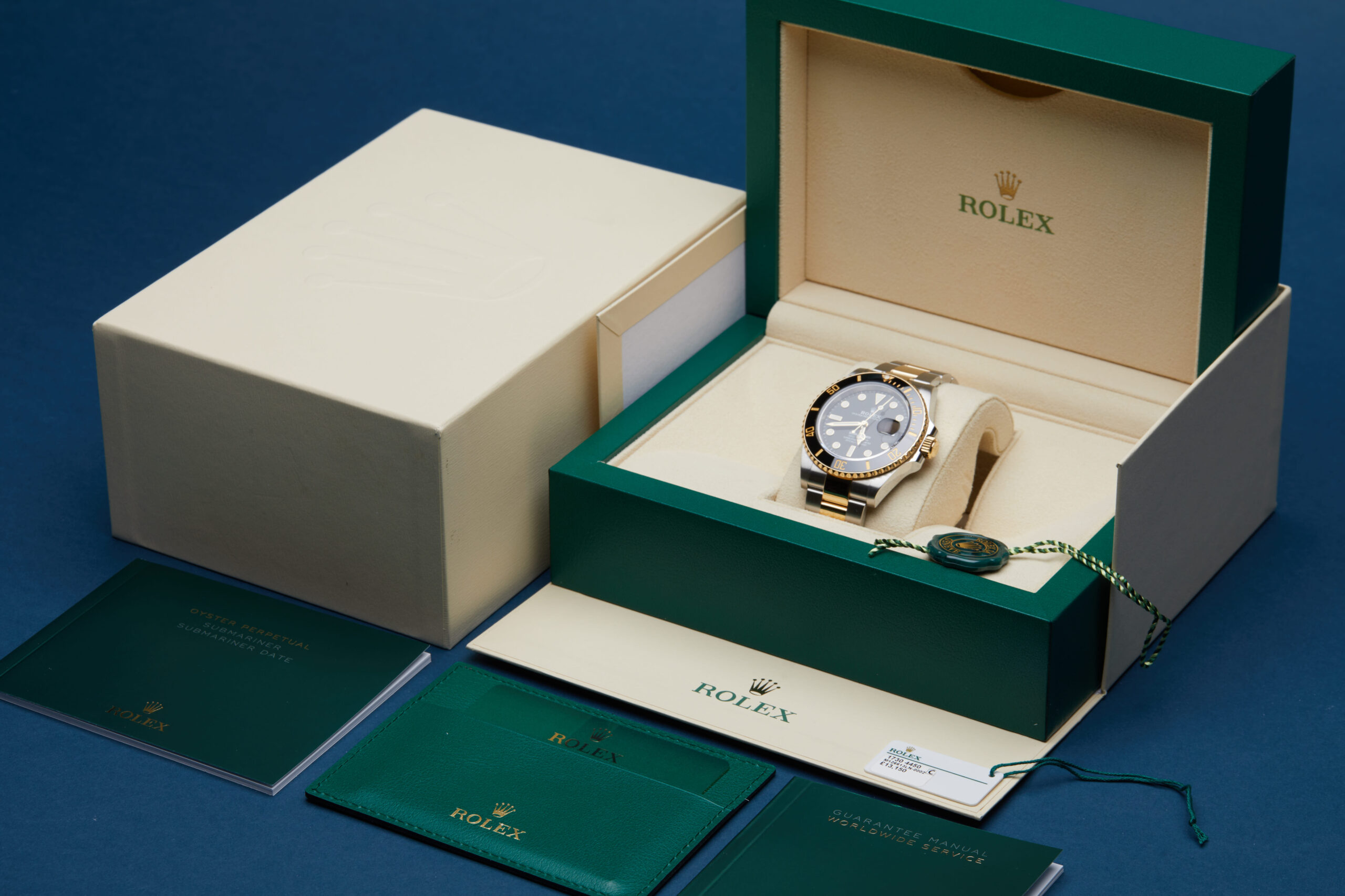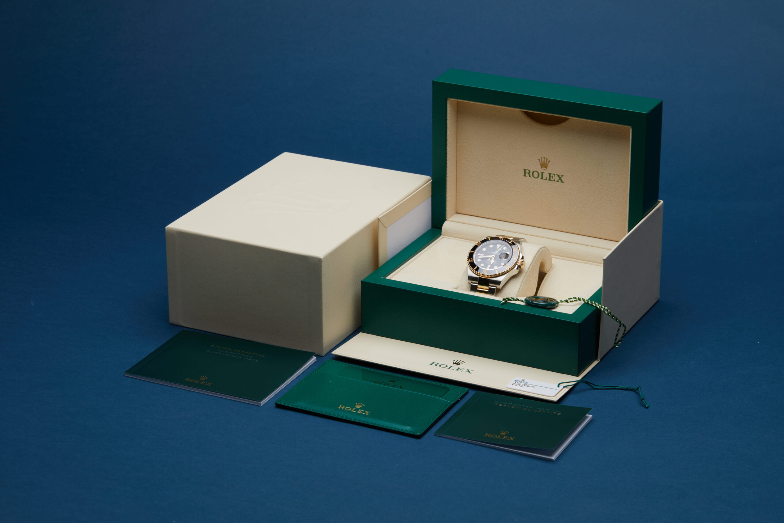 The watch is supplied with its original Rolex box, green leather wallet, manuals, 2x swing tags and warranty card dated Q3 2023.