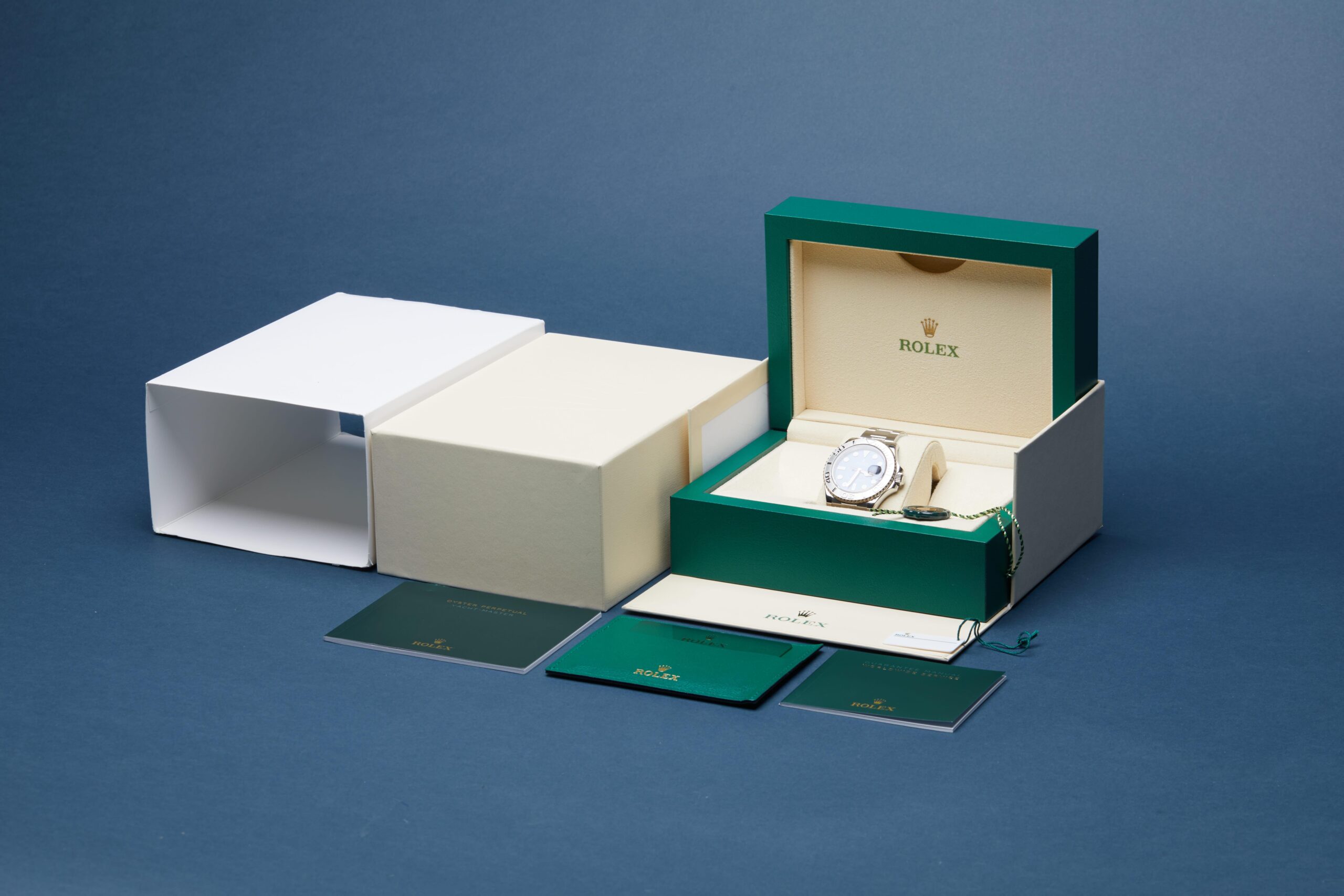 The watch is supplied with its original Rolex box, green leather wallet, manuals, 2x swing tags and warranty card dated Q2 2023.