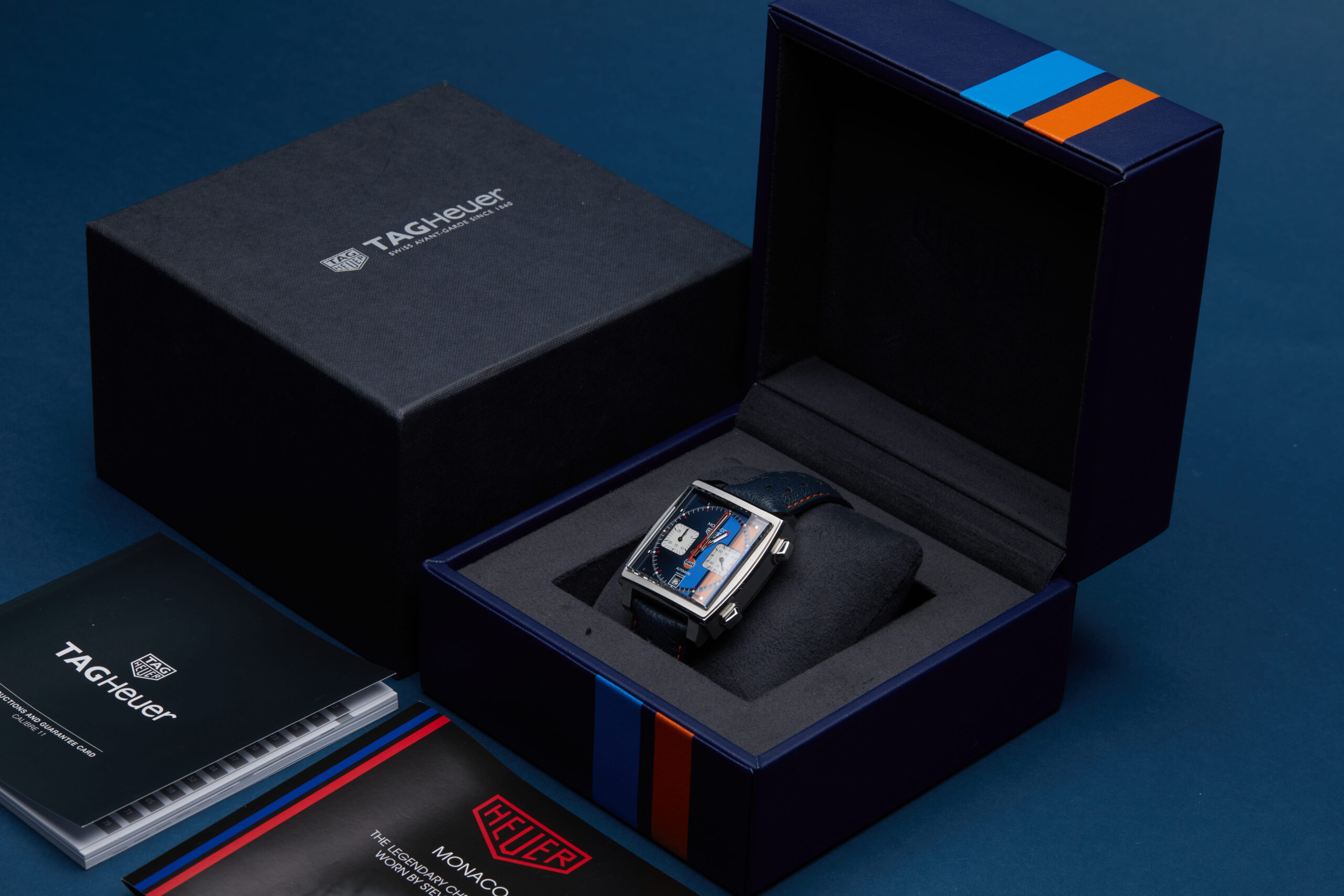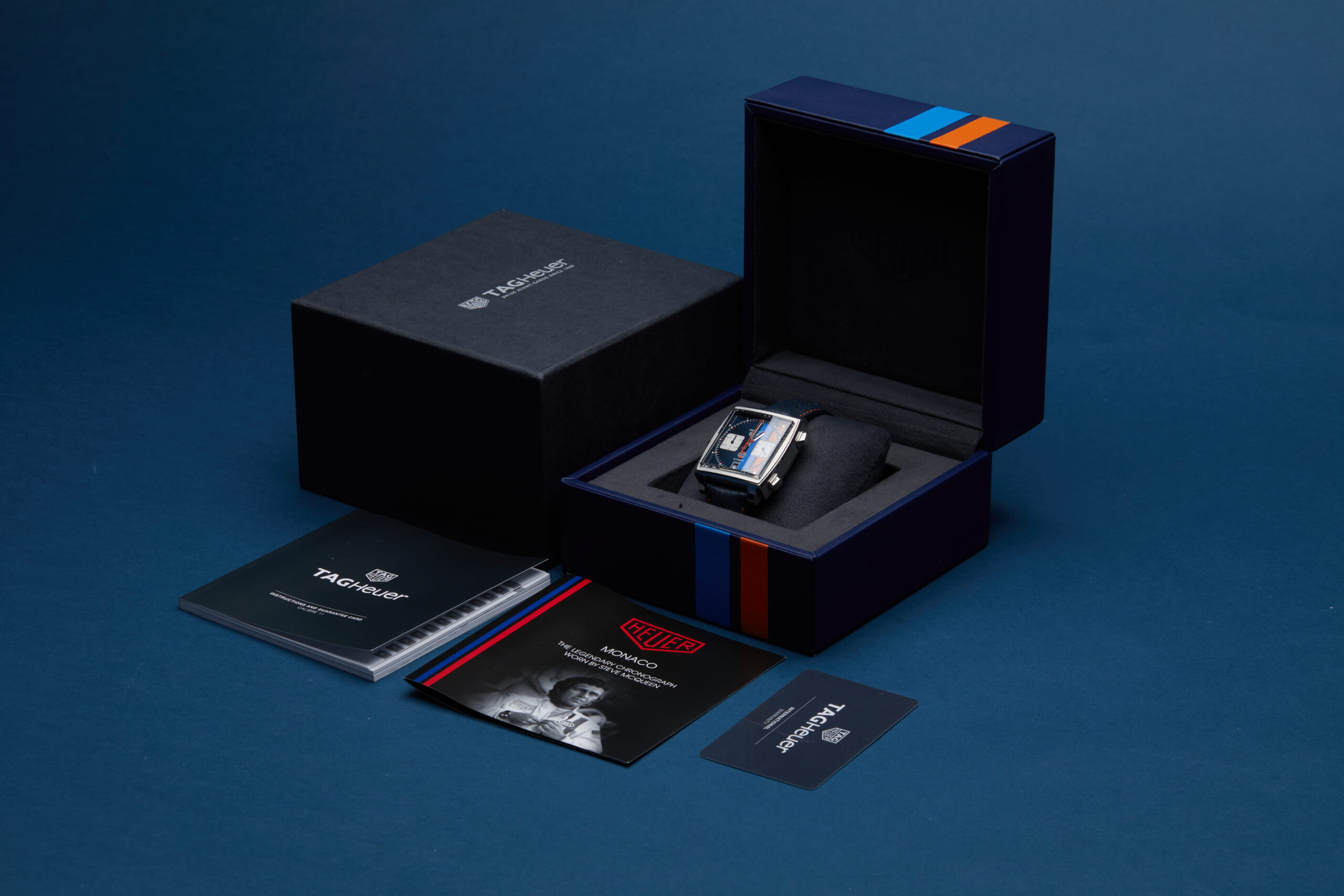 The watch is supplied with its original TAG Heuer box, manual booklet, Monaco booklet and warranty card dated Q2 2018.