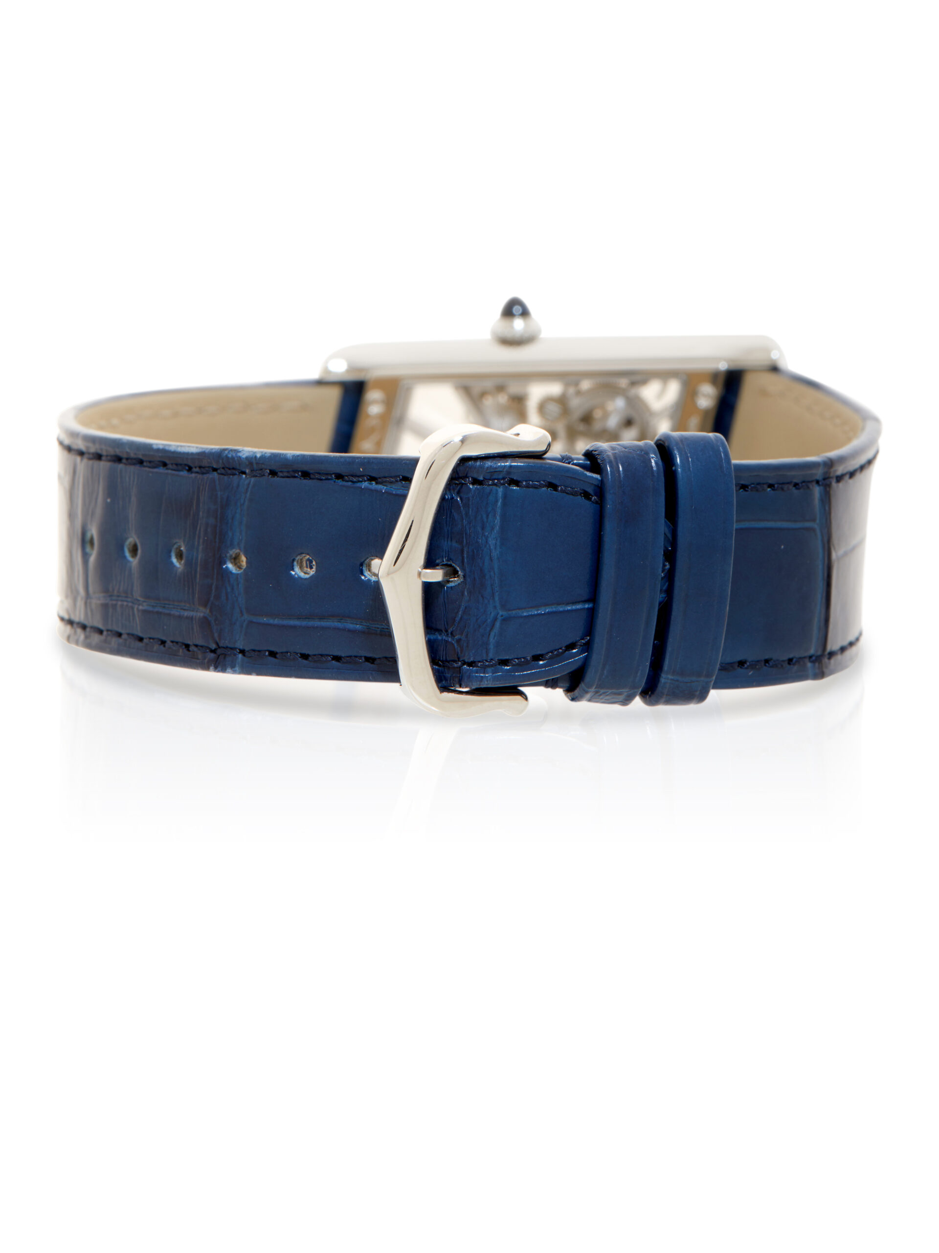 Presented in unworn condition is this rare and beautiful example of a 2021 Cartier Tank Asymetrique WHTA0012, limited to just 100 pieces with this timepiece being numbered 1. The watch features a 47 x 26mm platinum case, skeleton dial with blue hour markers and is coupled to a blue alligator strap with a platinum buckle. Having been professionally tested for its condition and accuracy, it’s deemed to be running very well and is showing barely any signs of wear.